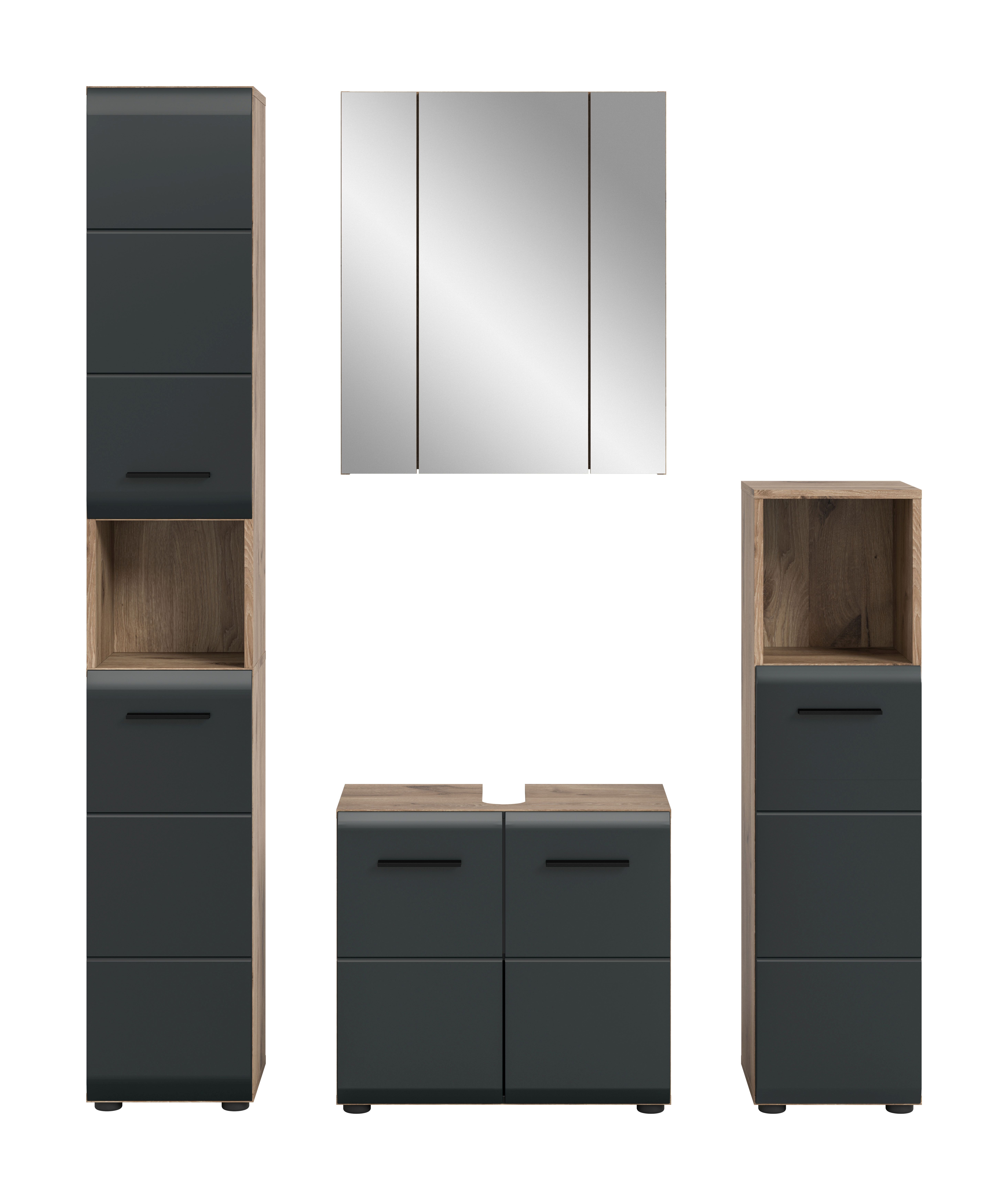 Découvrez notre élégante salle de bains combinée dans un ton noir mat et décor chêne Nox. Cet ensemble astucieux de meubles de salle de bains offre un bel espace de rangement pour vos accessoires tout en conférant à votre pièce un look tendance et rangé.
