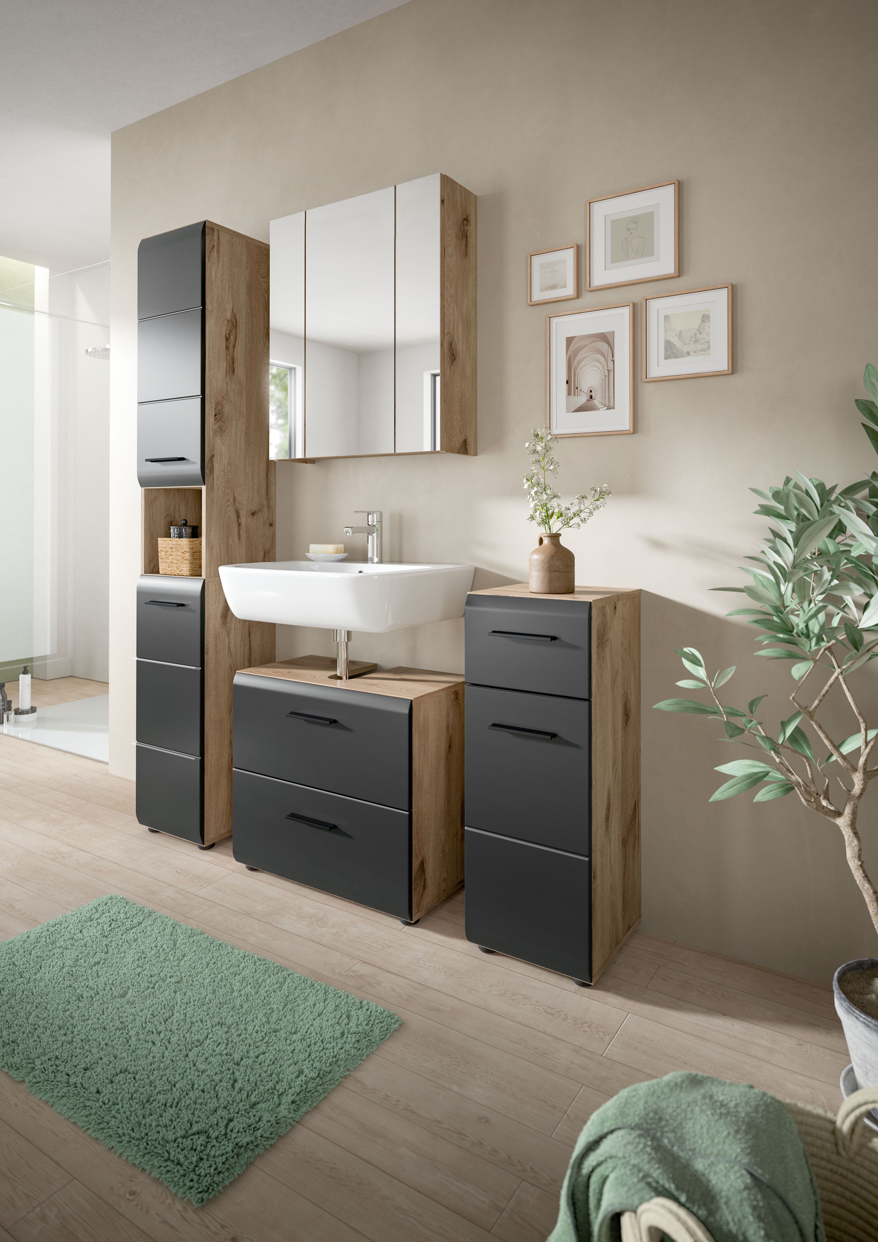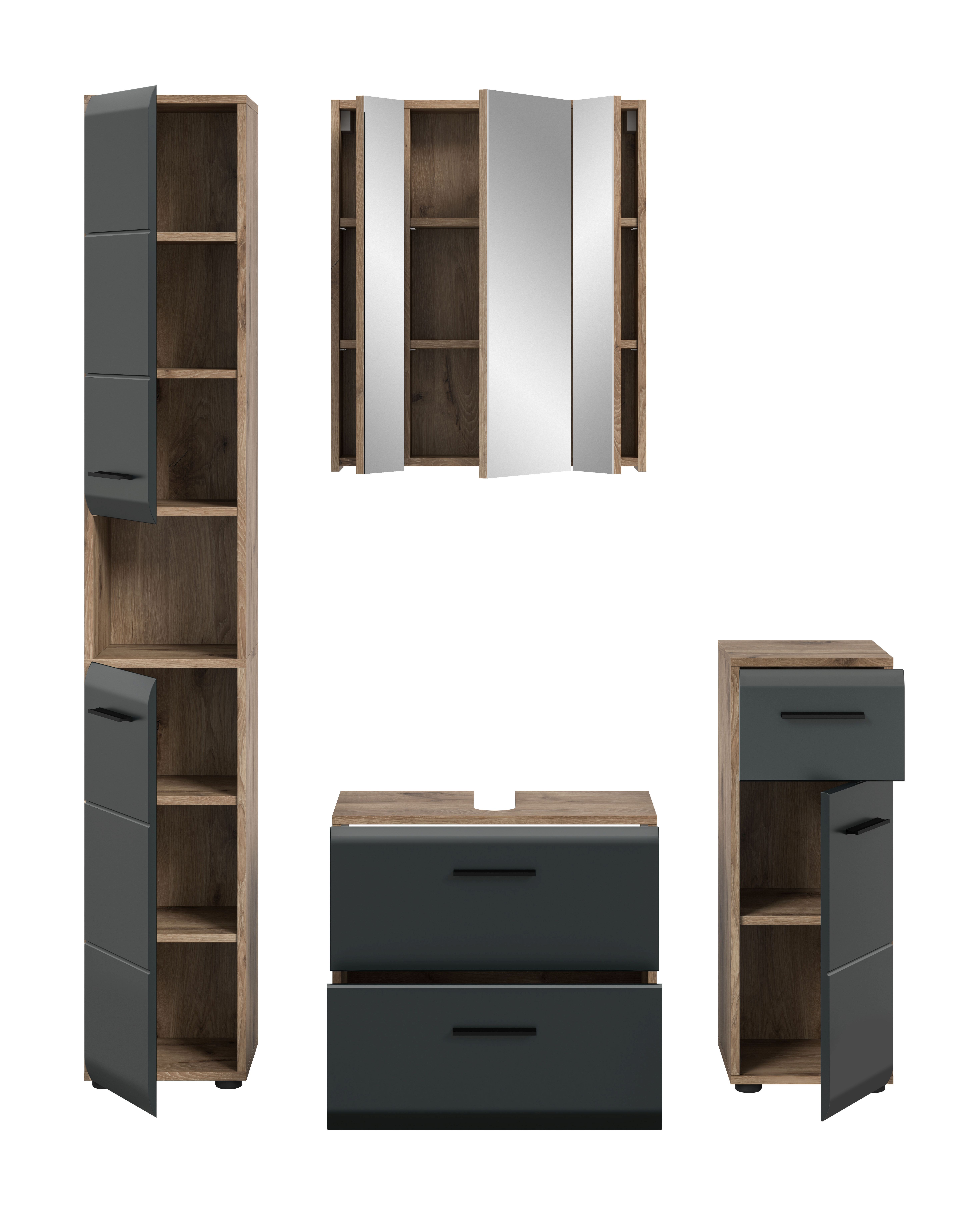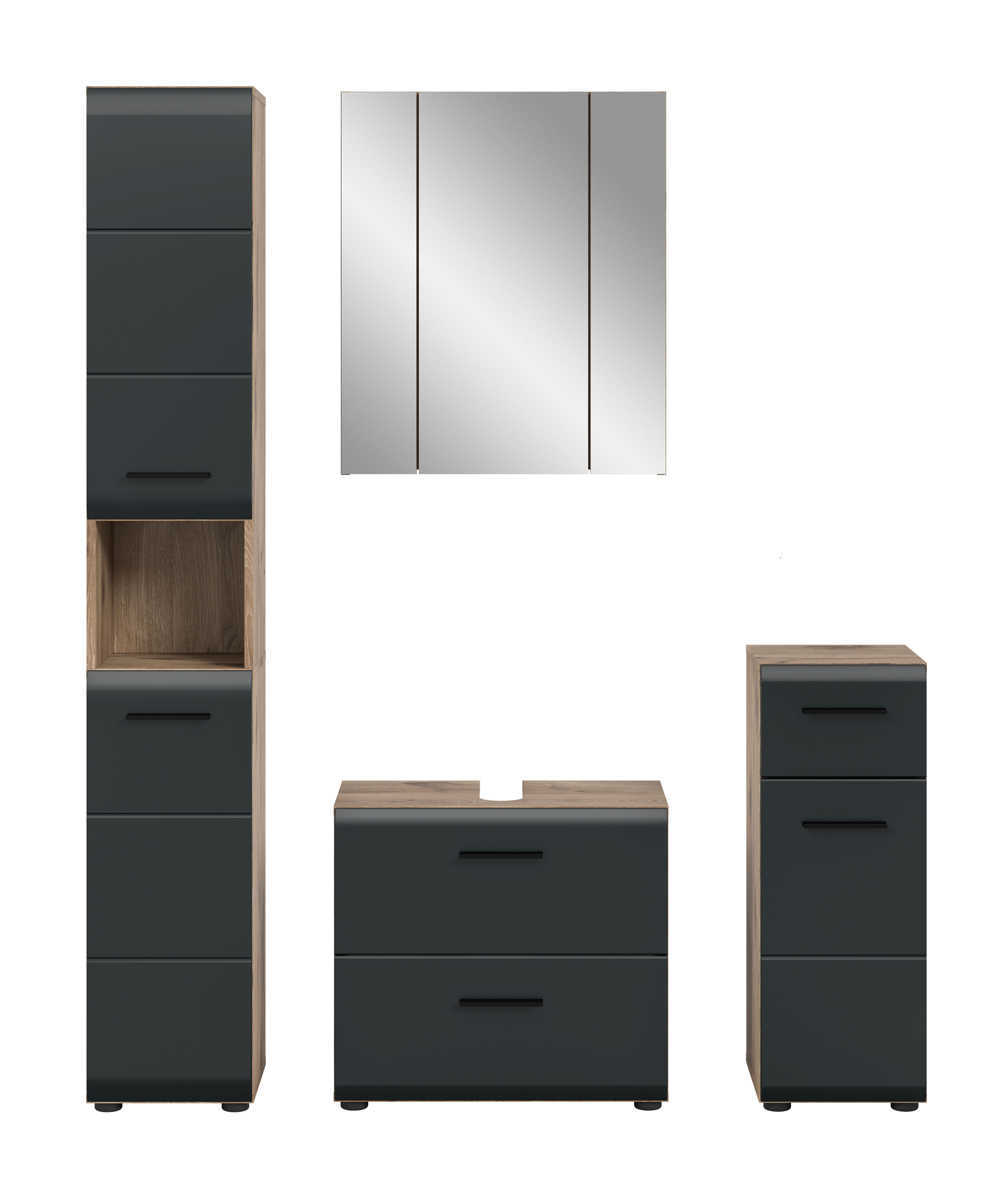 Découvrez notre élégante salle de bains combinée dans un ton noir mat et décor chêne Nox. Cet ensemble astucieux de meubles de salle de bains offre un bel espace de rangement pour vos accessoires tout en conférant à votre pièce un look tendance et rangé.