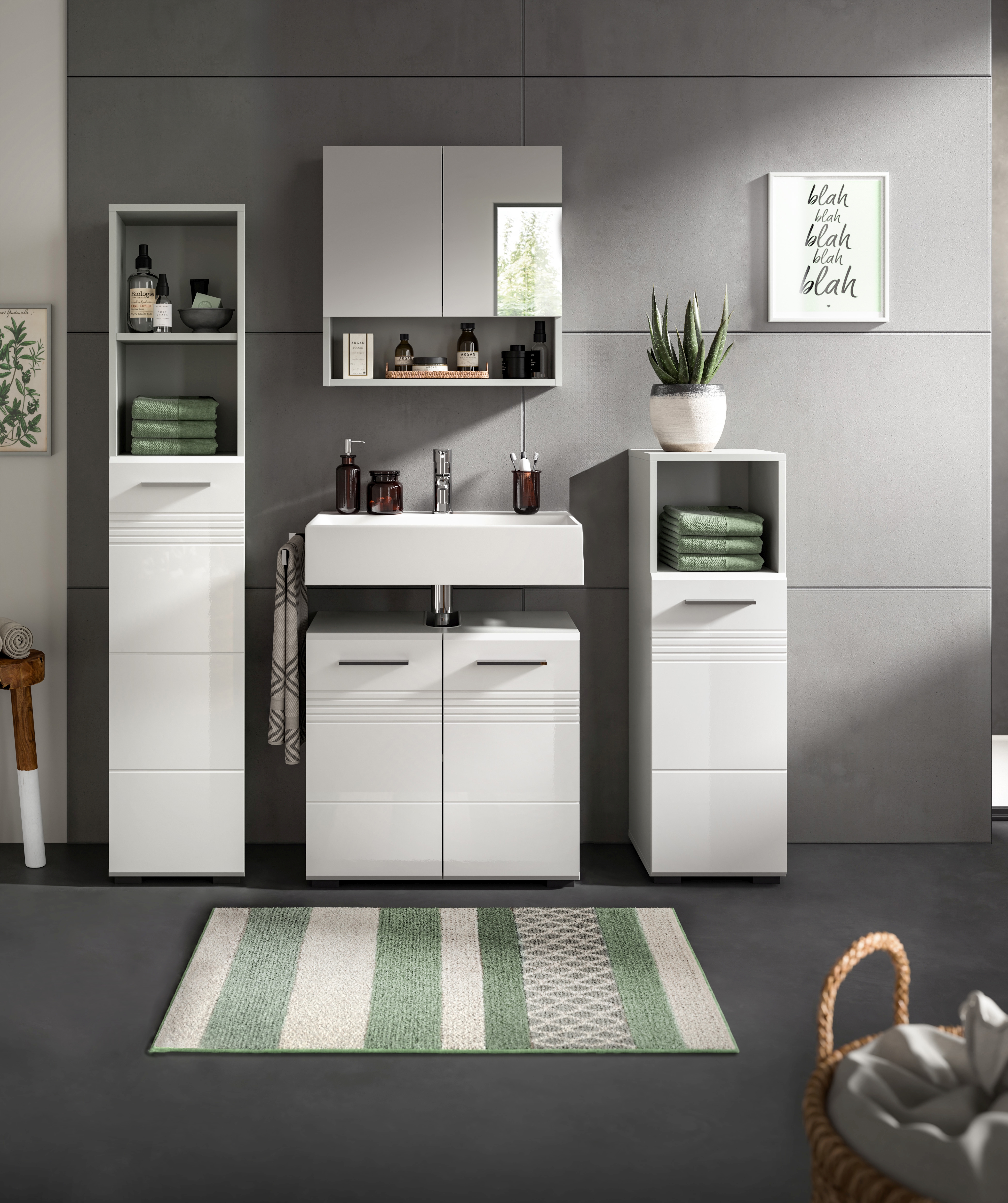 1 colonne de salle de bains avec 1 porte, 2 tablettes amovibles et 2 casiers ouverts