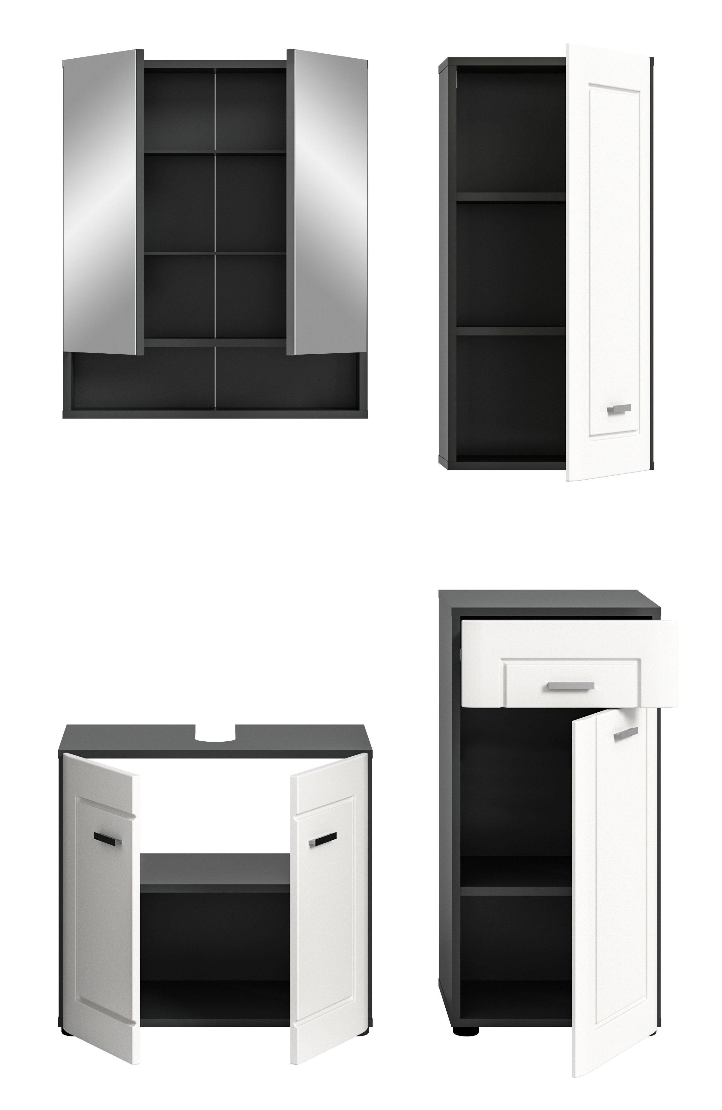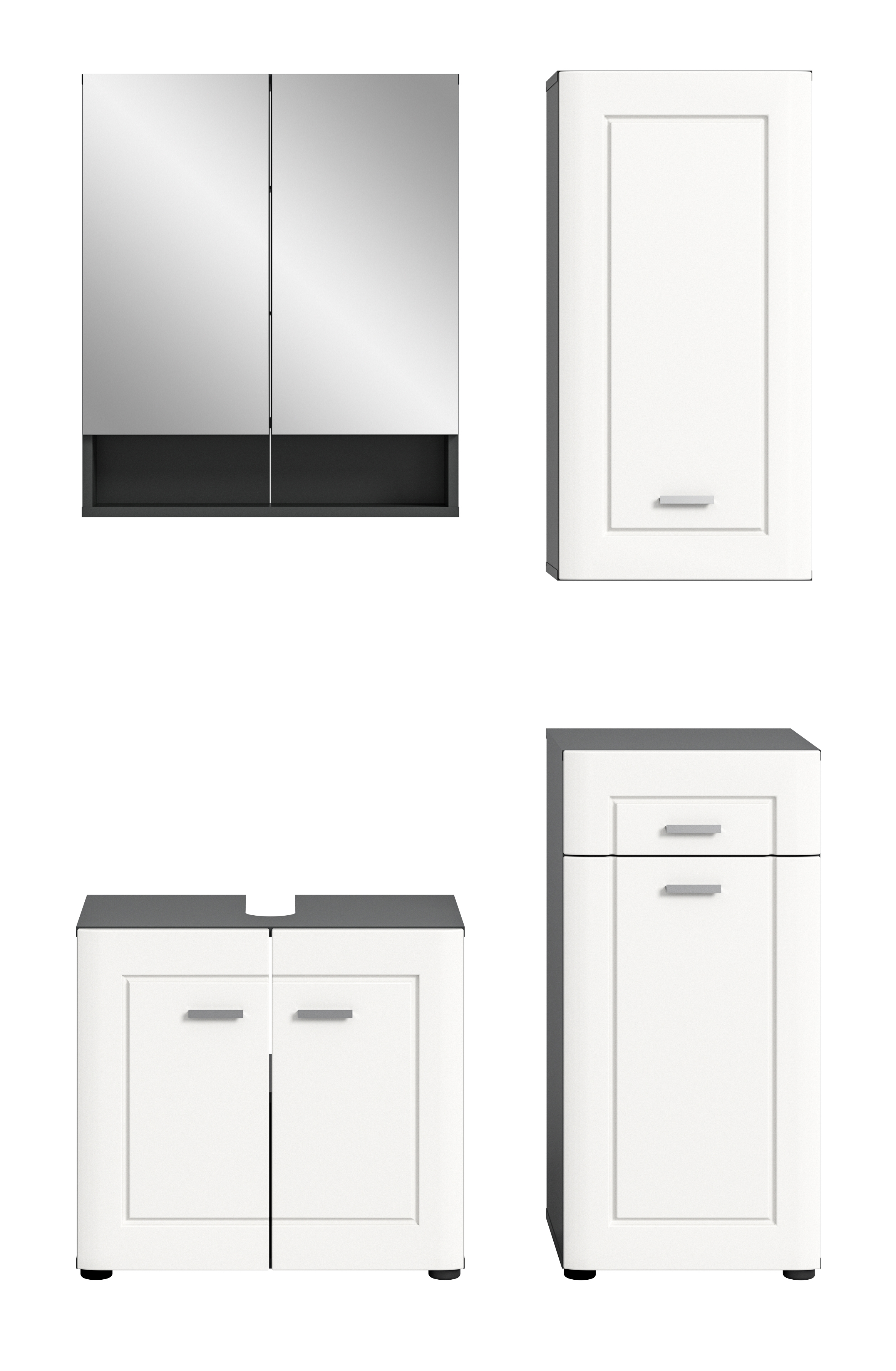 - Fonctionnalité : salle de bain complète avec différents éléments (meuble sous lavabo, armoire de toilette, meuble de rangement et meuble haut) pour une utilisation optimale de l’espace disponible et un stockage efficace des accessoires de bains et produits de nettoyage.