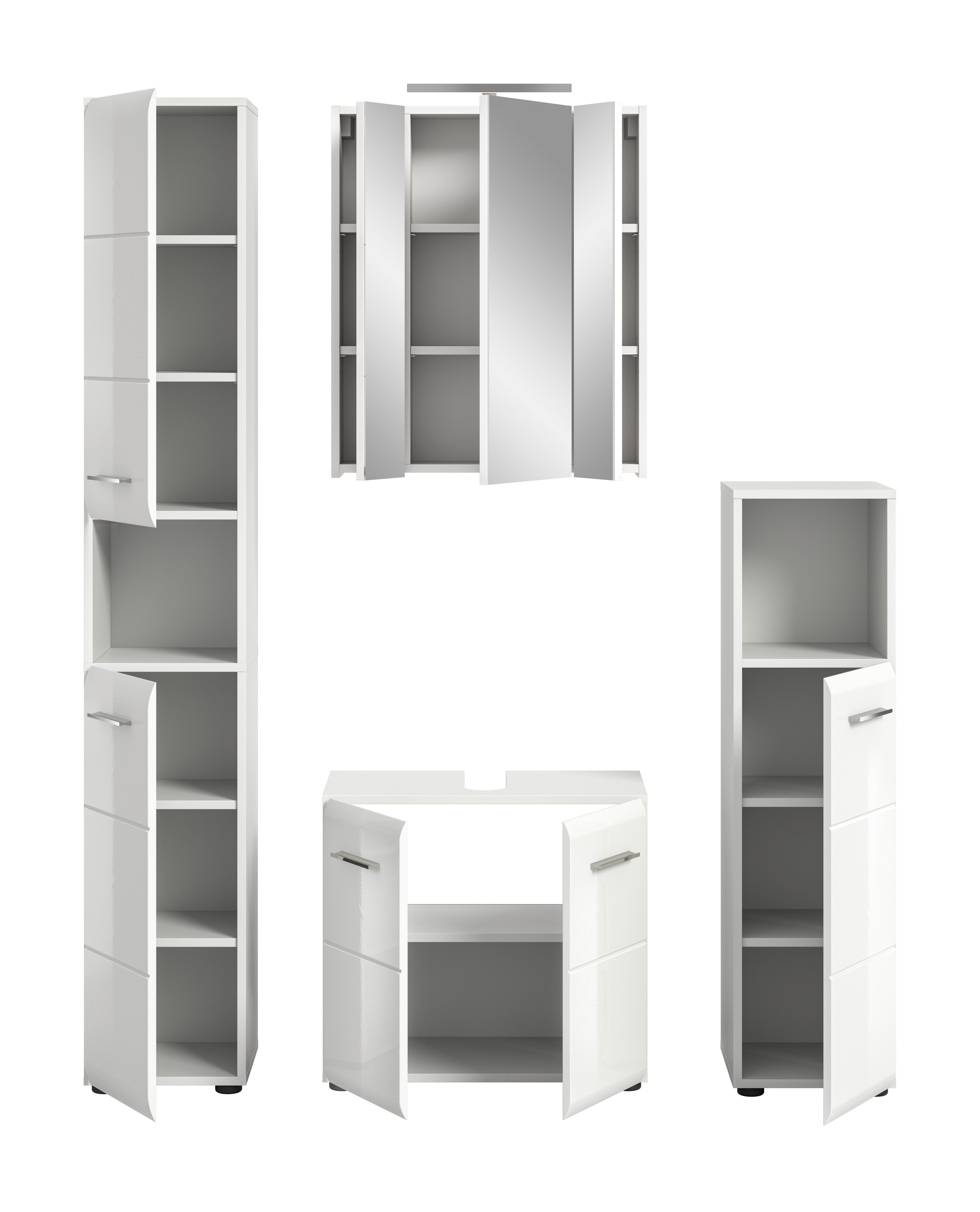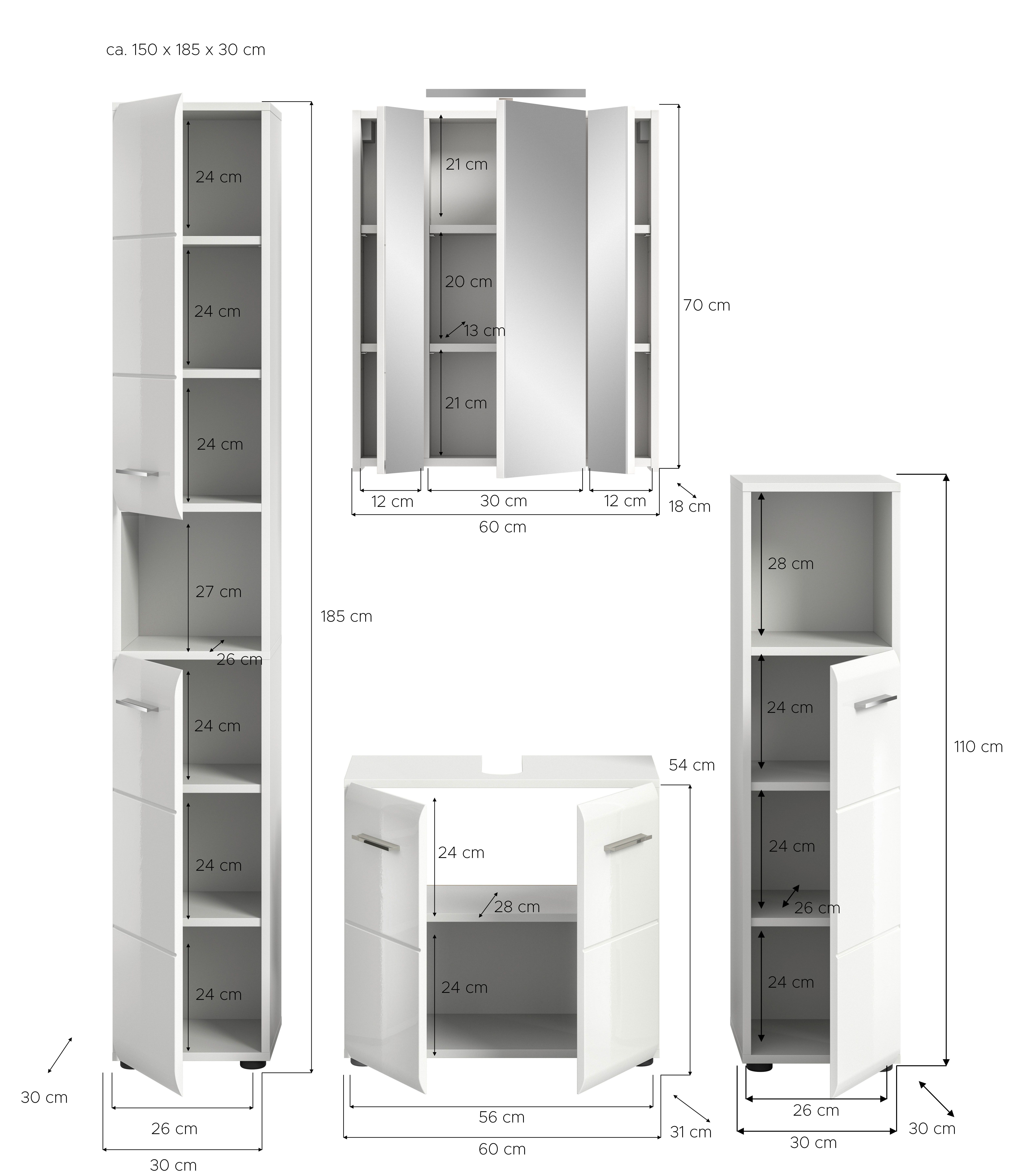 - Salle de bains combinée 5 éléments comprenant 1x meuble colonne, 1x meuble sous lavabo, 1x armoire de toilette avec éclairage et 1x meuble de rangement demi-colonne