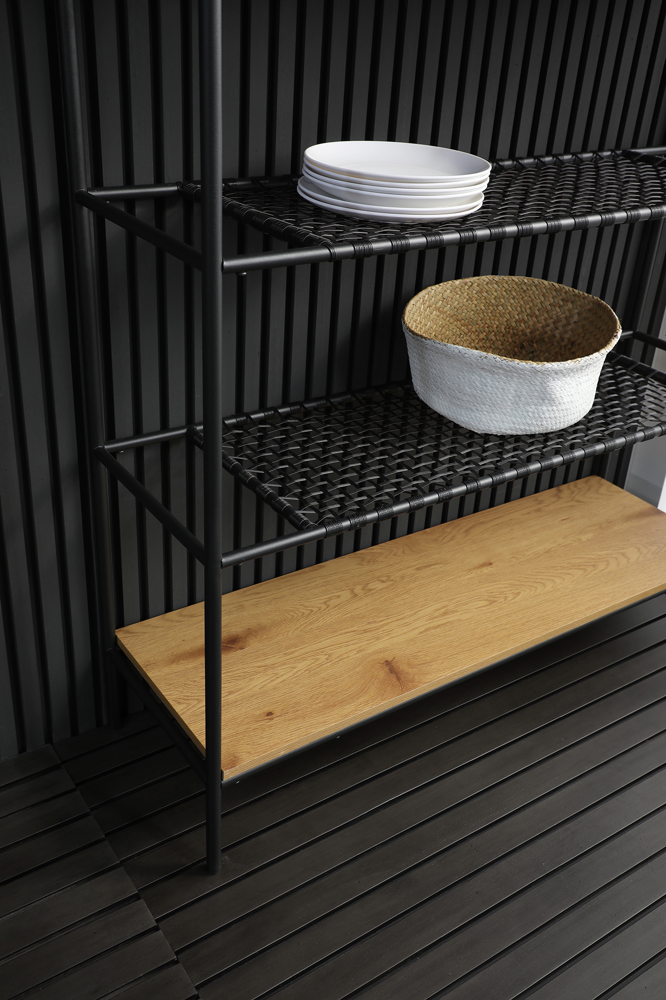 La rencontre du design rétro et de l'élégance froide et intemporelle. Cette bibliothèque séduit par son design original. Deux tablettes en bois MDF ton naturel contrastent avec les deux tablettes en poly rotin ton noir mat pour twister ce meuble de façon intéressante. La troisième tablette en partant du haut attire l'attention grâce à son évidement aux deux extrémités. Avec une hauteur de 129 cm et une largeur de 110 cm, la bibliothèque offre suffisamment de place pour vos livres préférés et divers objets de décoration. Grâce à son design intemporel, cette bibliothèque s'intègre parfaitement dans tous les styles d'intérieurs et peut également être utilisée comme étagère de cuisine ou de salle à manger - votre créativité n'a donc plus aucune limite !