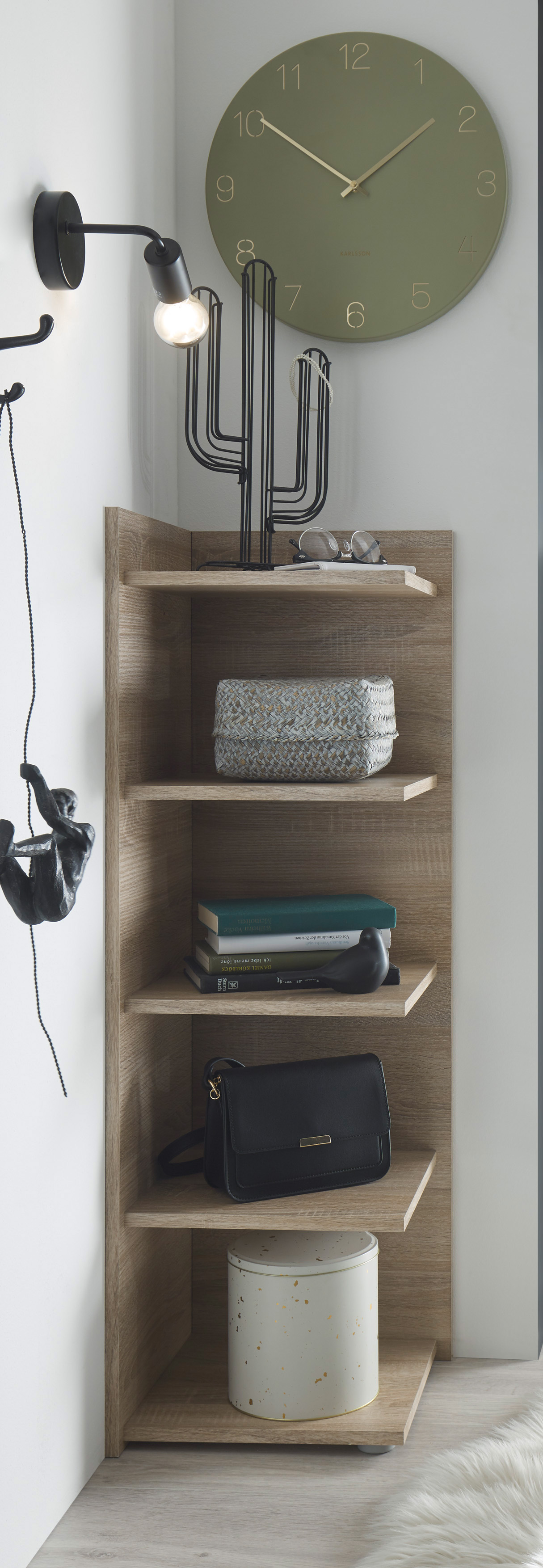 Cette étagère d'angle en imitation chêne Sonoma allie fonctionnalité pratique et charme naturel. Avec ses quatre compartiments ouverts et ses cinq étagères, elle offre suffisamment d'espace pour présenter avec style et ranger de manière ordonnée des livres, des objets décoratifs ou des objets du quotidien. L'aspect bois chaleureux s'intègre harmonieusement dans n'importe quel intérieur et fait de cette étagère un élément fonctionnel qui attire le regard dans n'importe quel coin de la pièce.