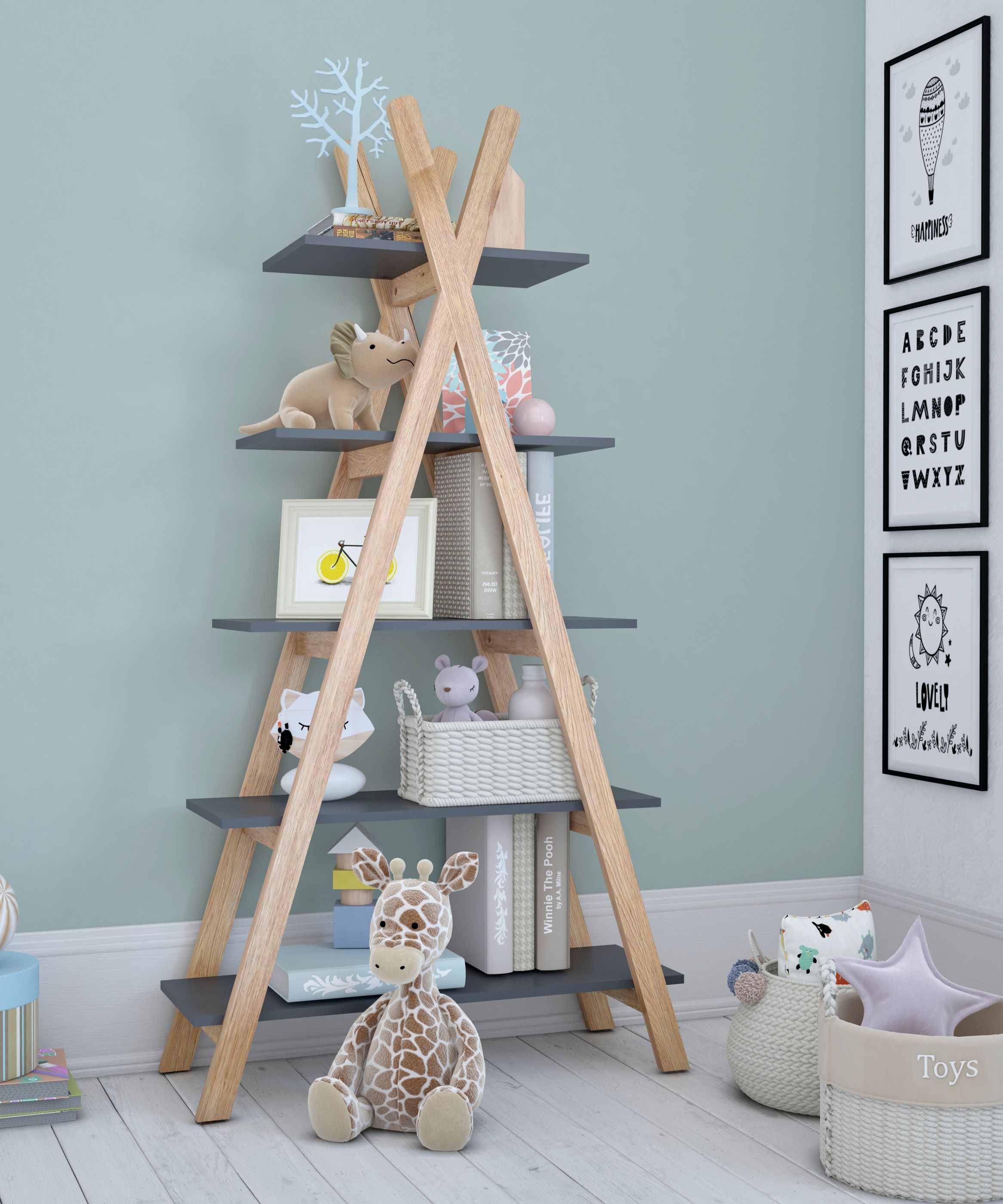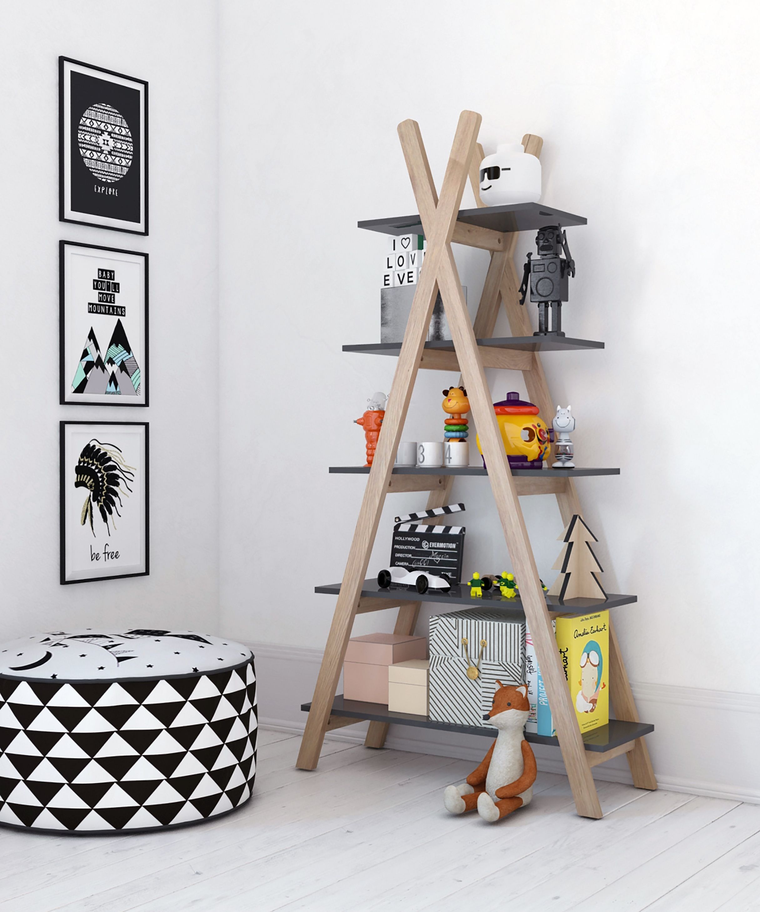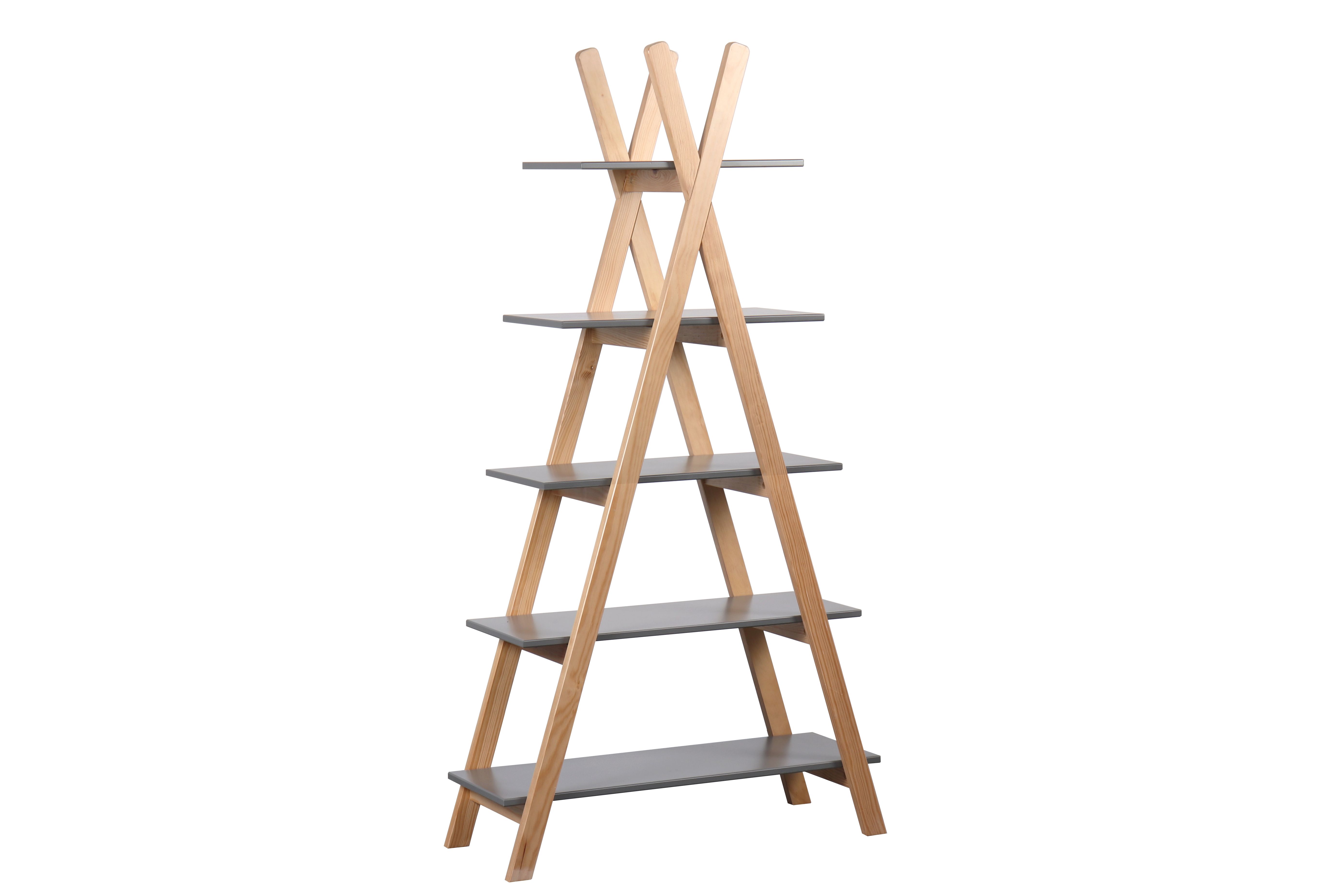 Cette étagère en forme de tipi est un excellent choix pour tous les petits Indiens. Cinq tablettes de différentes tailles offrent un bel espace de rangement pour les livres, les jouets et la décoration. La structure en bois de pin constitue un contraste naturel avec les tablettes en MDF laqué ton gris. Le design nordique et moderne de l'étagère s'intègre facilement dans tout type de chambre d'enfant où elle accrochera le regard. Posée librement dans la pièce, par exemple en guise de séparateur de pièce, l'étagère en forme de tente est également du plus bel effet. Coordonnée avec différents autres meubles de la collection junior ou utilisée comme élément de contraste dans un joyeux "mix & match", l'étagère s'harmonise parfaitement avec de nombreux aménagements. Rangez les livres et les peluches de votre enfant dans cette bibliothèque en les mettant joliment en scène.