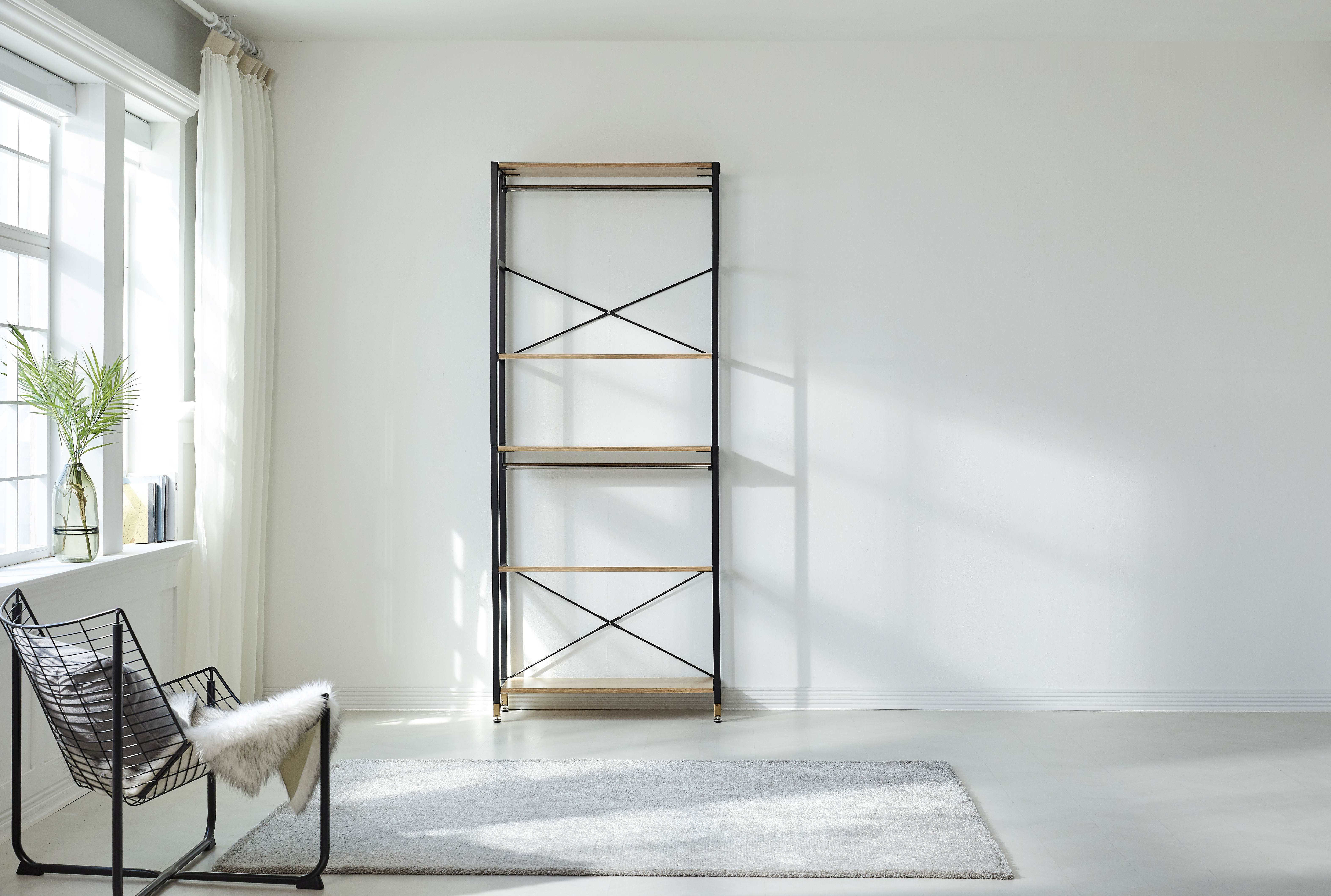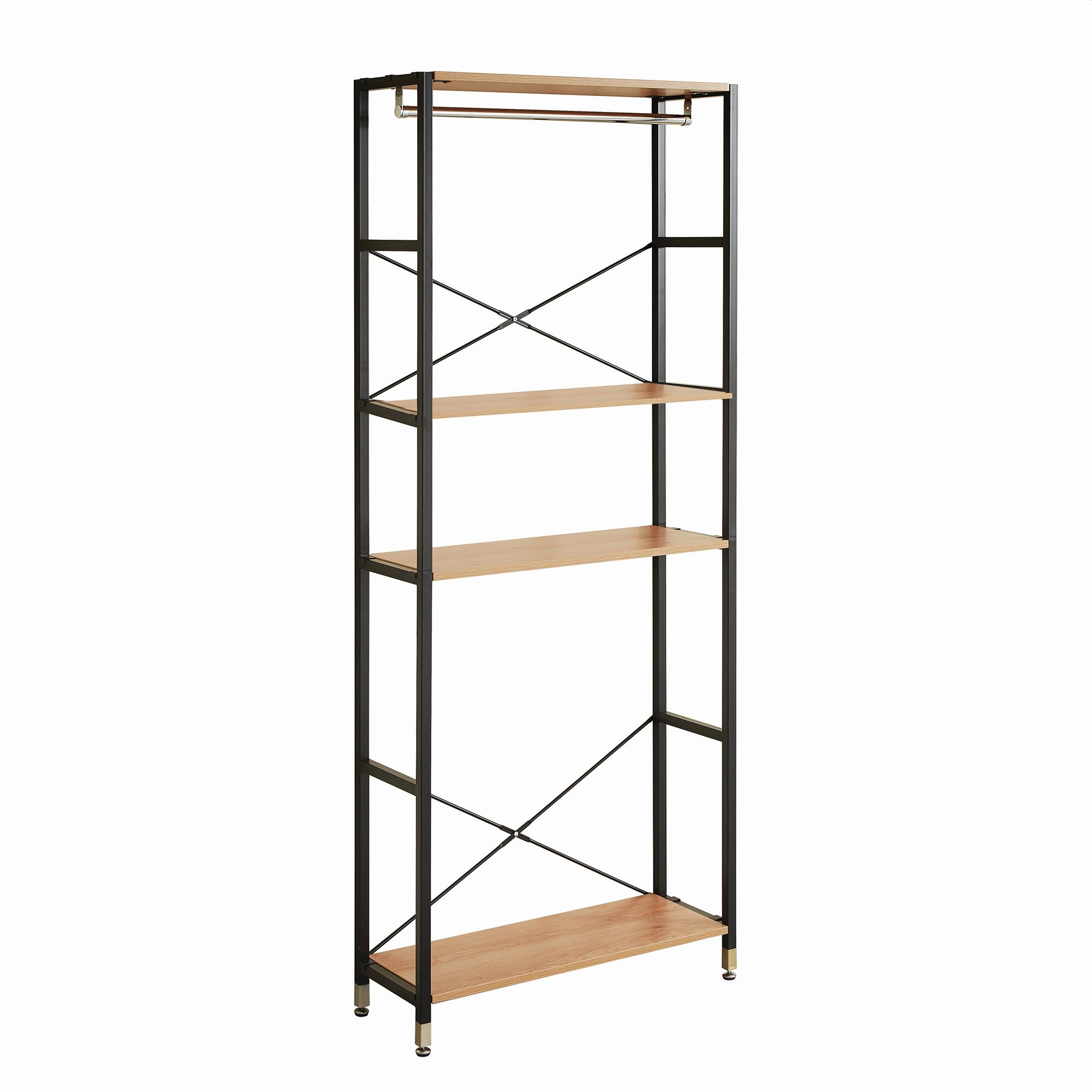 Faites régner l'ordre ! Avec cette étagère, créez un espace de rangement supplémentaire et le manque de place ne sera plus jamais un problème. Avec une hauteur de 210 cm, cette étagère offre suffisamment de place par exemple pour les livres ou les articles de décoration. . Vous pourrez suspendre vos vêtements à la barre de penderie. La structure est en métal. Les quatre tablettes amovibles sont en MDF plaqué aspect acacia. Grâce à la répartition ouverte, l'étagère peut également servir de séparateur de pièce. Avec sa largeur de 85 cm, cette étagère est idéale pour quasiment toutes les pièces.