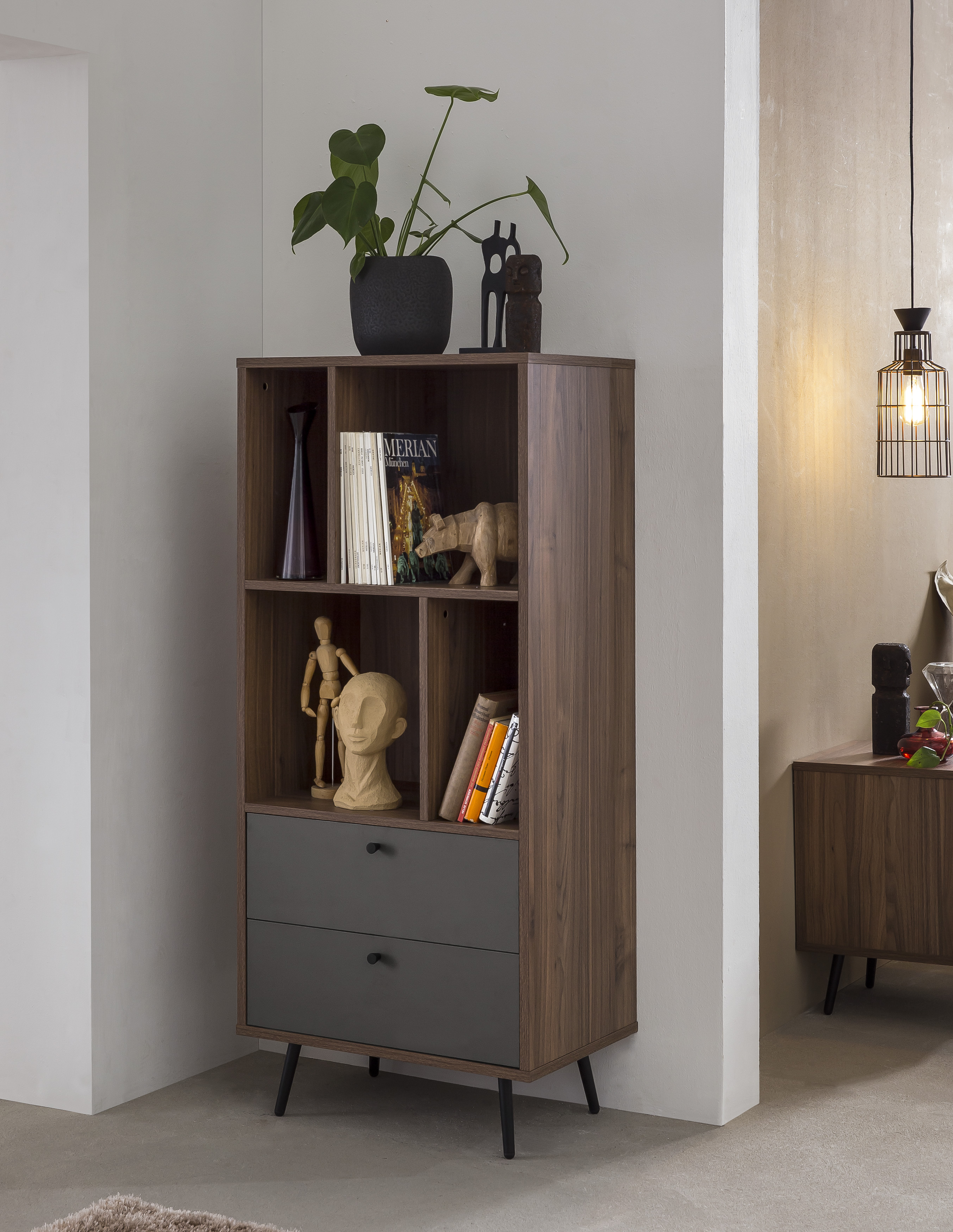 Le design aux lignes droites de cette bibliothèque associe bois MDF ton noyer et ton gris avec pieds en métal laqué ton noir mat. L'étagère haute de 138 cm offre avec quatre casiers et deux tiroirs un bel espace de rangement ouvert et fermé pour différents objets. Les pieds en métal ton noir mat garantissent une excellente stabilité. Les quatre casiers ouverts sont asymétriques et donc ultra tendance. Utilisez cette bibliothèque dans votre salon pour présenter vos livres préférés et vos décorations. Ce meuble chic de style minimaliste s'intègre facilement dans tous les intérieurs tout en attirant le regard. Cette bibliothèque est le complément idéal pour votre aménagement intérieur !