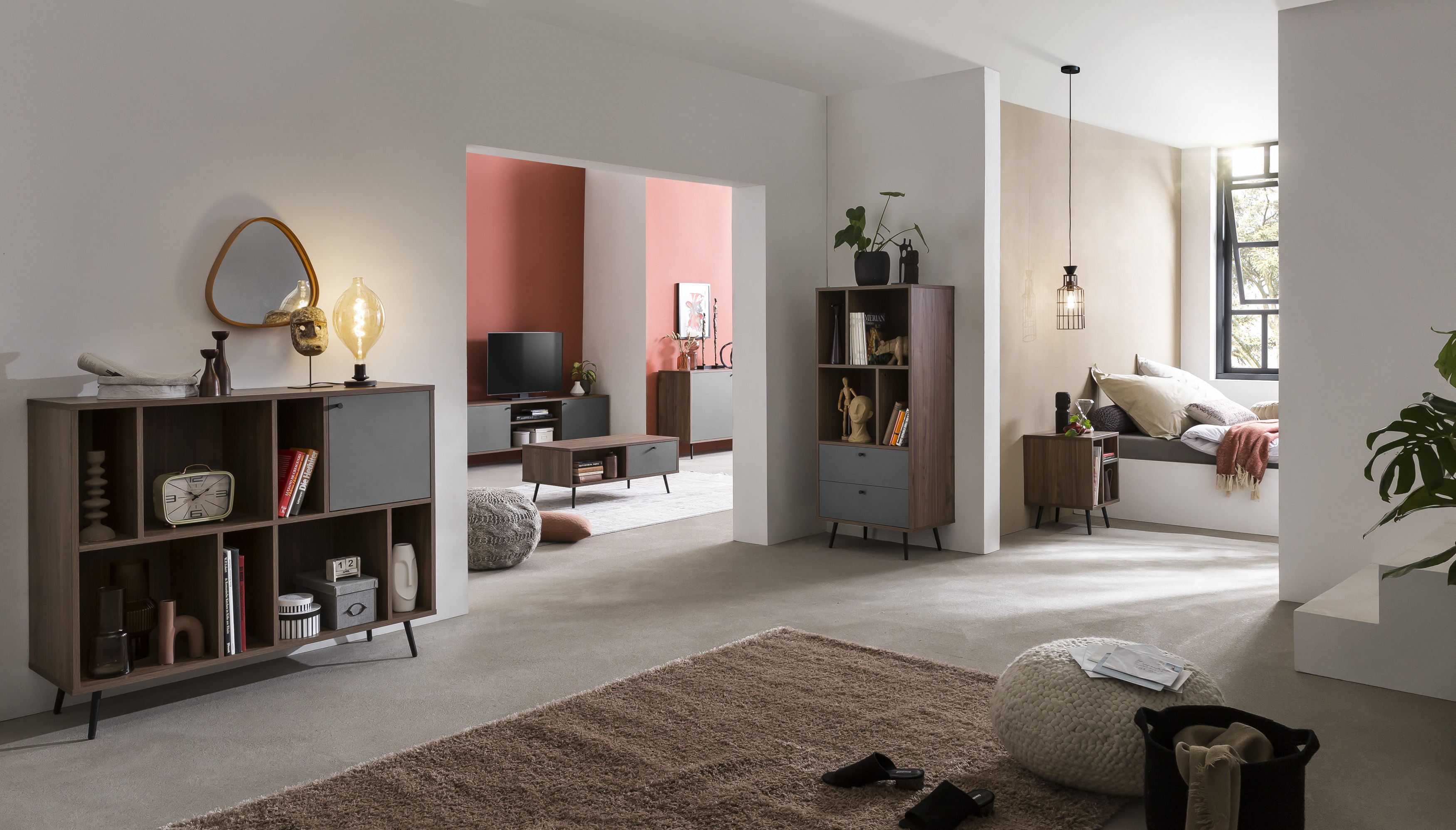 Le design aux lignes droites de cette bibliothèque associe bois MDF ton noyer et ton gris avec pieds en métal laqué ton noir mat. L'étagère haute de 118 cm offre avec sept casiers et une porte un bel espace de rangement ouvert et fermé pour différents objets. Les pieds en métal ton noir mat garantissent une excellente stabilité. Les sept casiers ouverts sont asymétriques et donc ultra tendance. Utilisez cette étagère dans votre salon pour présenter vos livres préférés et vos décorations. Ce meuble chic de style minimaliste s'intègre facilement dans tous les intérieurs tout en attirant le regard. Cette bibliothèque est le complément idéal pour votre aménagement intérieur !