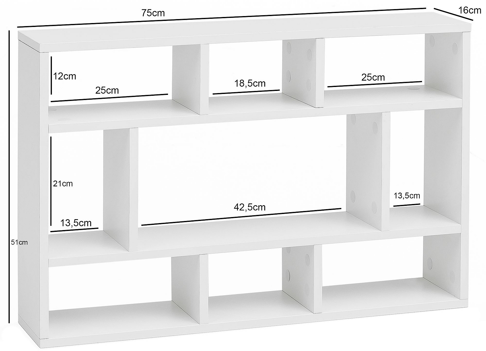 - ESPACE DE RANGEMENT AU MUR ✔ Vos livres préférés, les trophées remportés ou simplement de jolis accessoires de décoration : ces objets méritent une place spéciale ! Le mur est l’emplacement idéal, car vos objets favoris attireront immédiatement l’attention. C’est là que notre étagère murale à casiers ouverts entre en jeu. Avec ses neuf compartiments, il y a suffisamment de place pour vos objets fétiches !