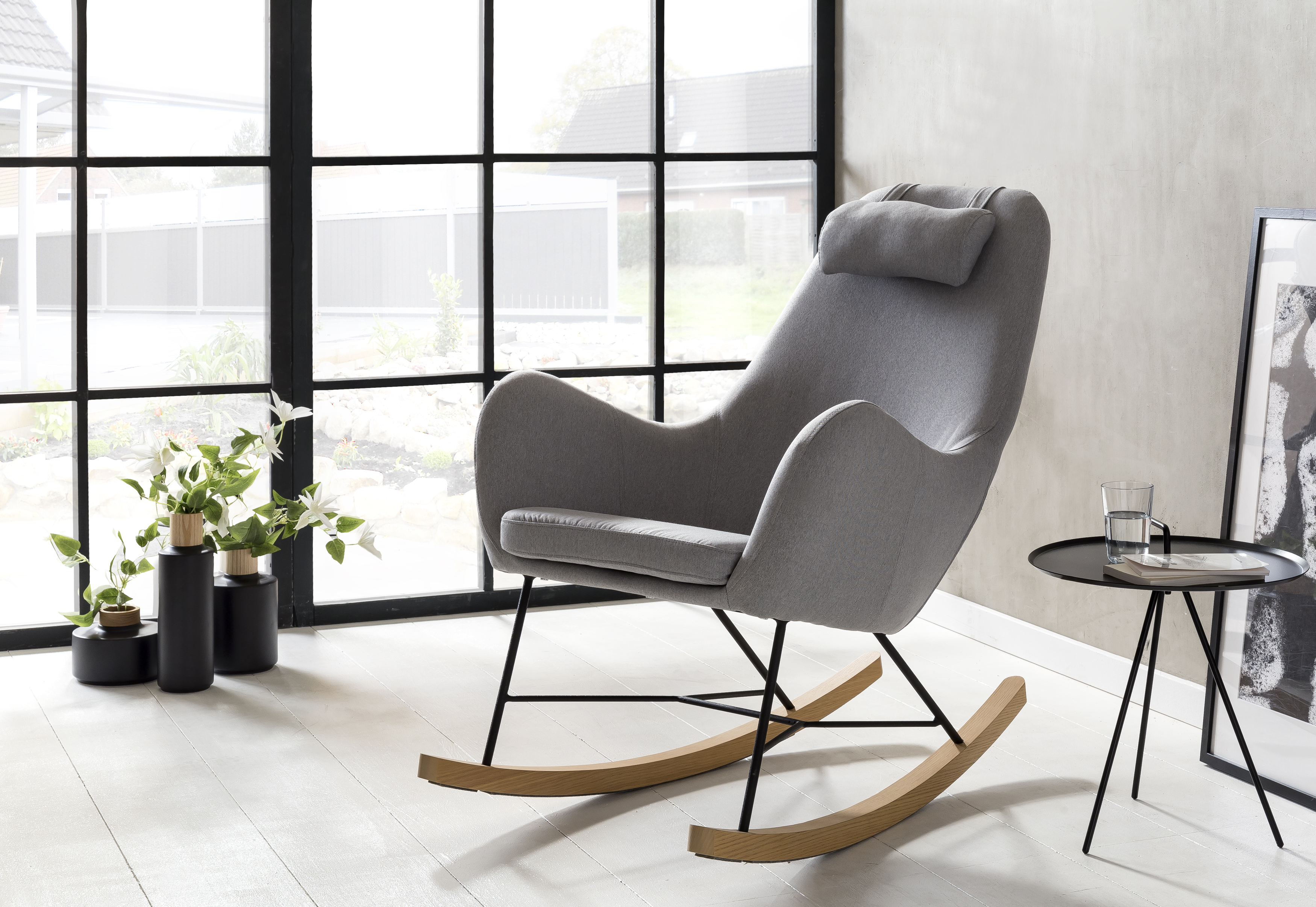 Le fauteuil à bascule de style scandinave est équipé d'un coussin de nuque amovible. Le revêtement en textile de qualité supérieure vous offre une assise stylée pour vous sentir bien. Tandis que la structure est en métal thermolaqué, les pieds en arceaux sont en bois de chêne (bois plein). Cette structure garantit une répartition uniforme du poids et un beau mouvement du fauteuil tout en s'harmonisant parfaitement avec le revêtement textile. Grâce au rembourrage en mousse polyéther, aux accoudoirs, au repose-tête et au coussin d'assise, vous ferez l'expérience d'une détente et d'un confort haut de gamme. Le rocking-chair séduit par son aspect original, sa qualité et sa robustesse. Faites de ce fauteuil à bascule votre nouvel endroit préféré et profitez de son confort pour lire ou regarder la télévision.