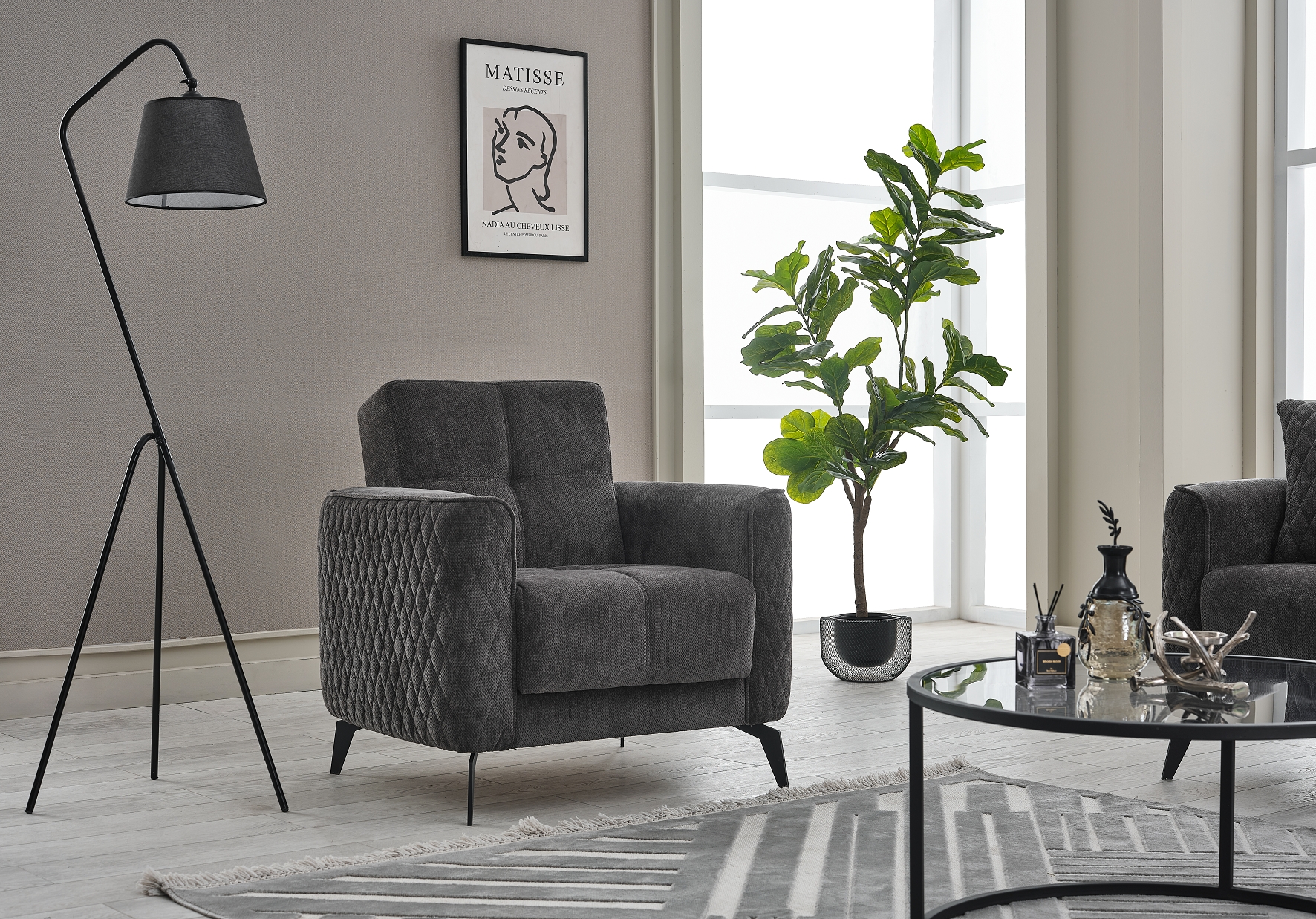 Ce fauteuil est un complément fonctionnel pour les pièces à vivre disposant d'un espace limité ou comme élément d'un ensemble de sièges. Le revêtement est résistant et facile d'entretien, idéal pour un usage quotidien. L'assise et le dossier sont rembourrés de ressorts Bonell et offrent un confort agréable et uniforme. Le dossier est entièrement recouvert de tissu véritable, ce qui permet de placer le fauteuil n'importe où dans la pièce. Les pieds en métal noir assurent une bonne stabilité et confèrent un look simple et moderne. La livraison s'effectue sans décoration.