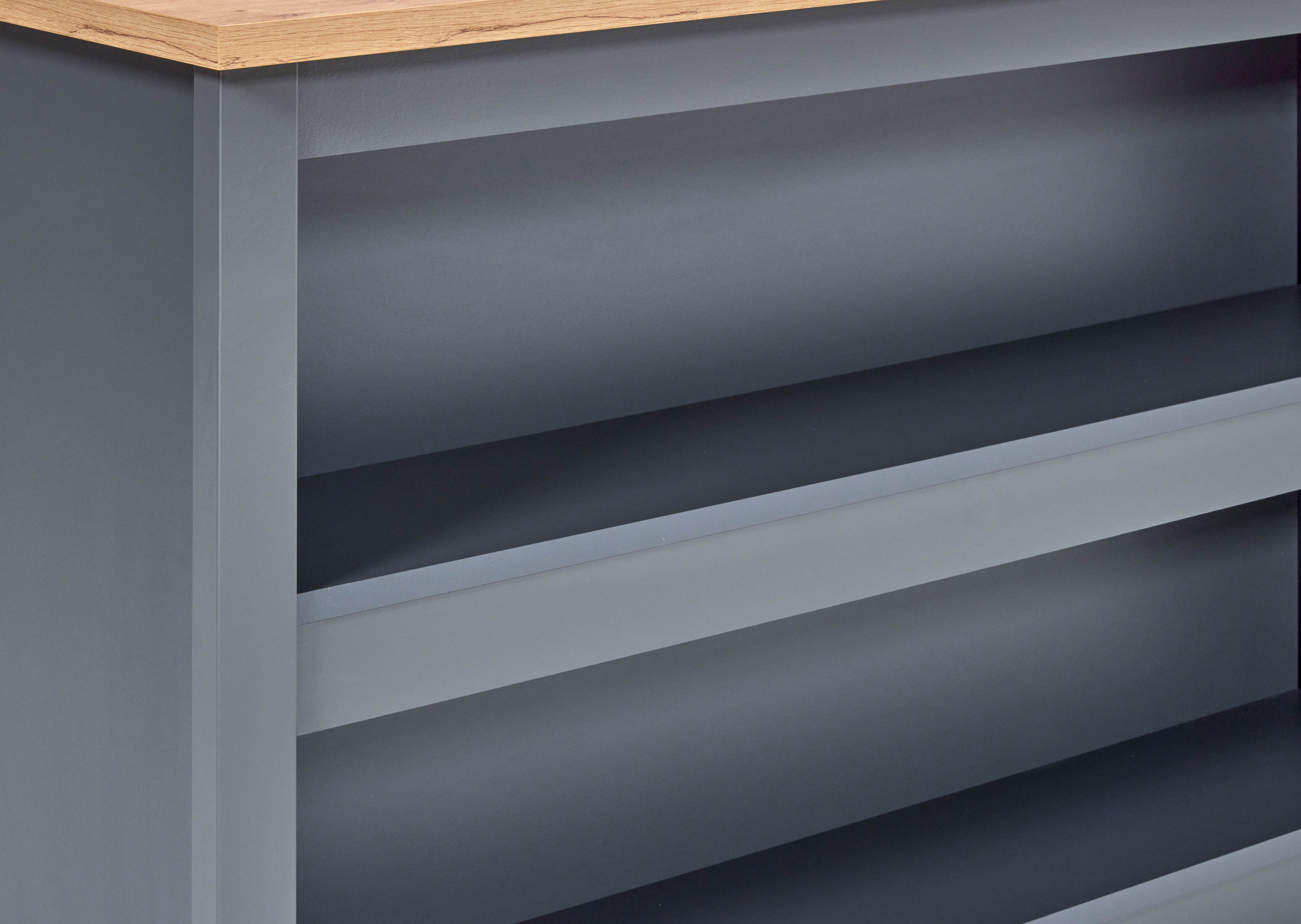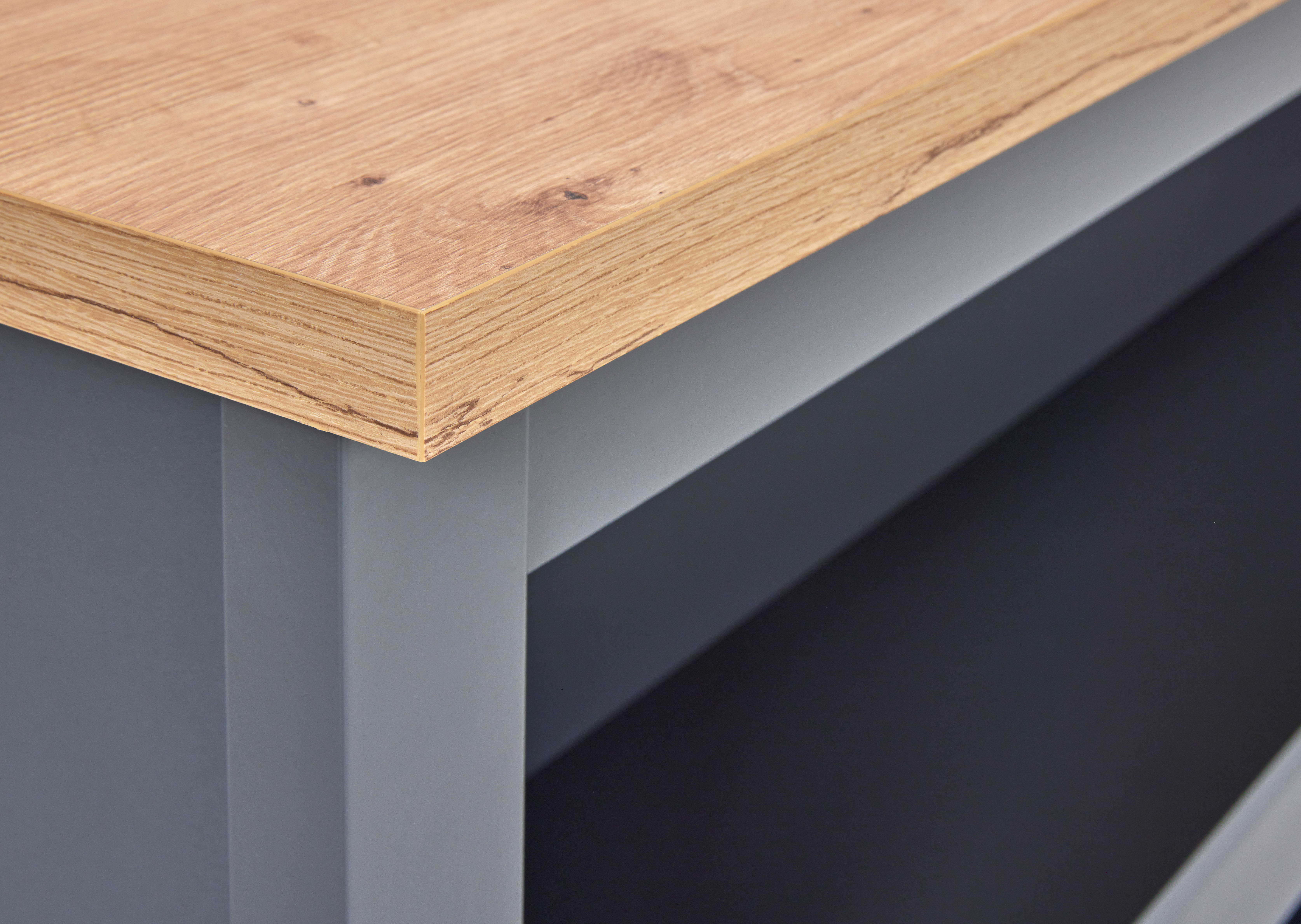 Le plan de travail, d’une épaisseur de 25 mm, est fabriqué à la main en MDF aspect chêne. Il mesure 124 cm de long sur 75 cm de profondeur, des dimensions parfaites pour préparer vos plats.