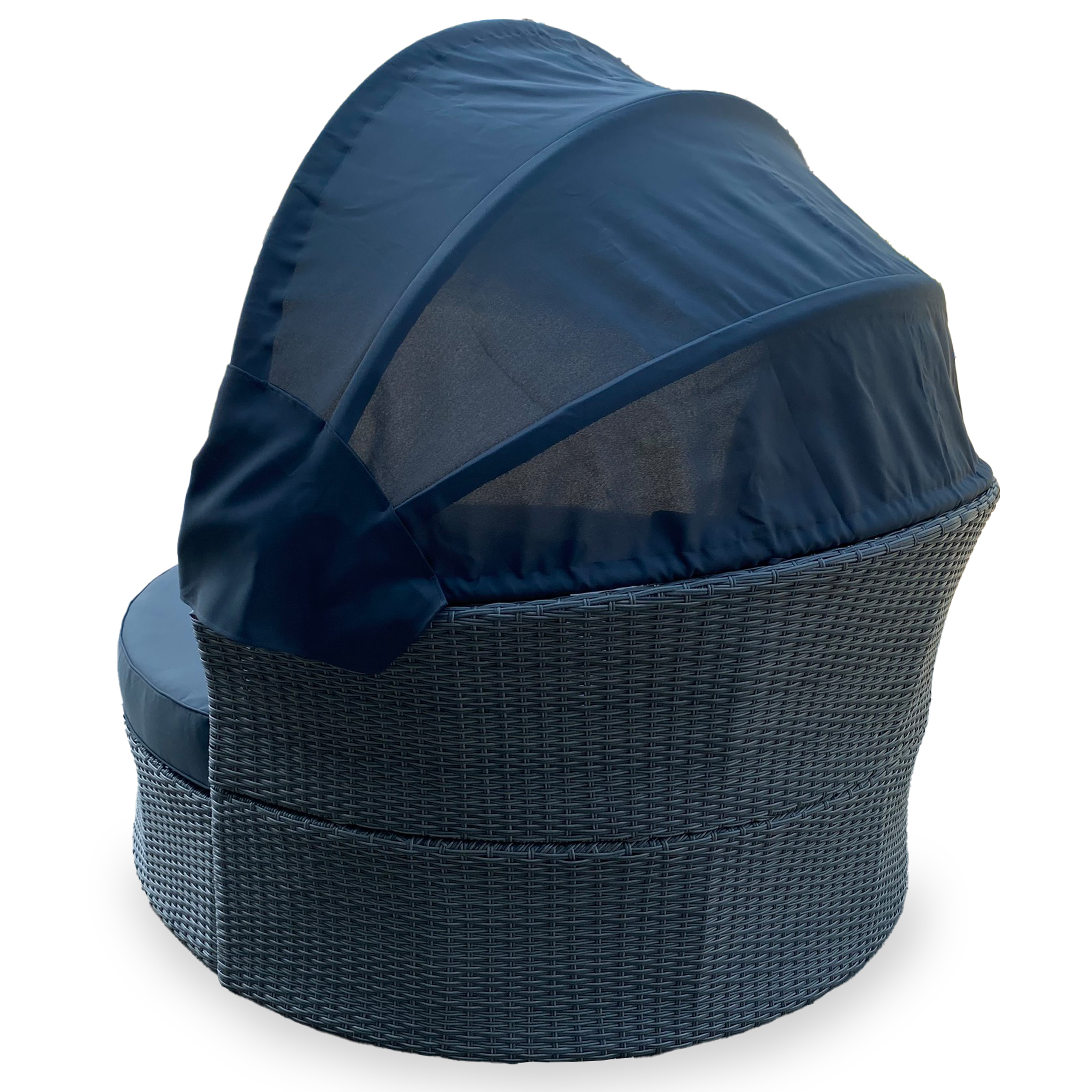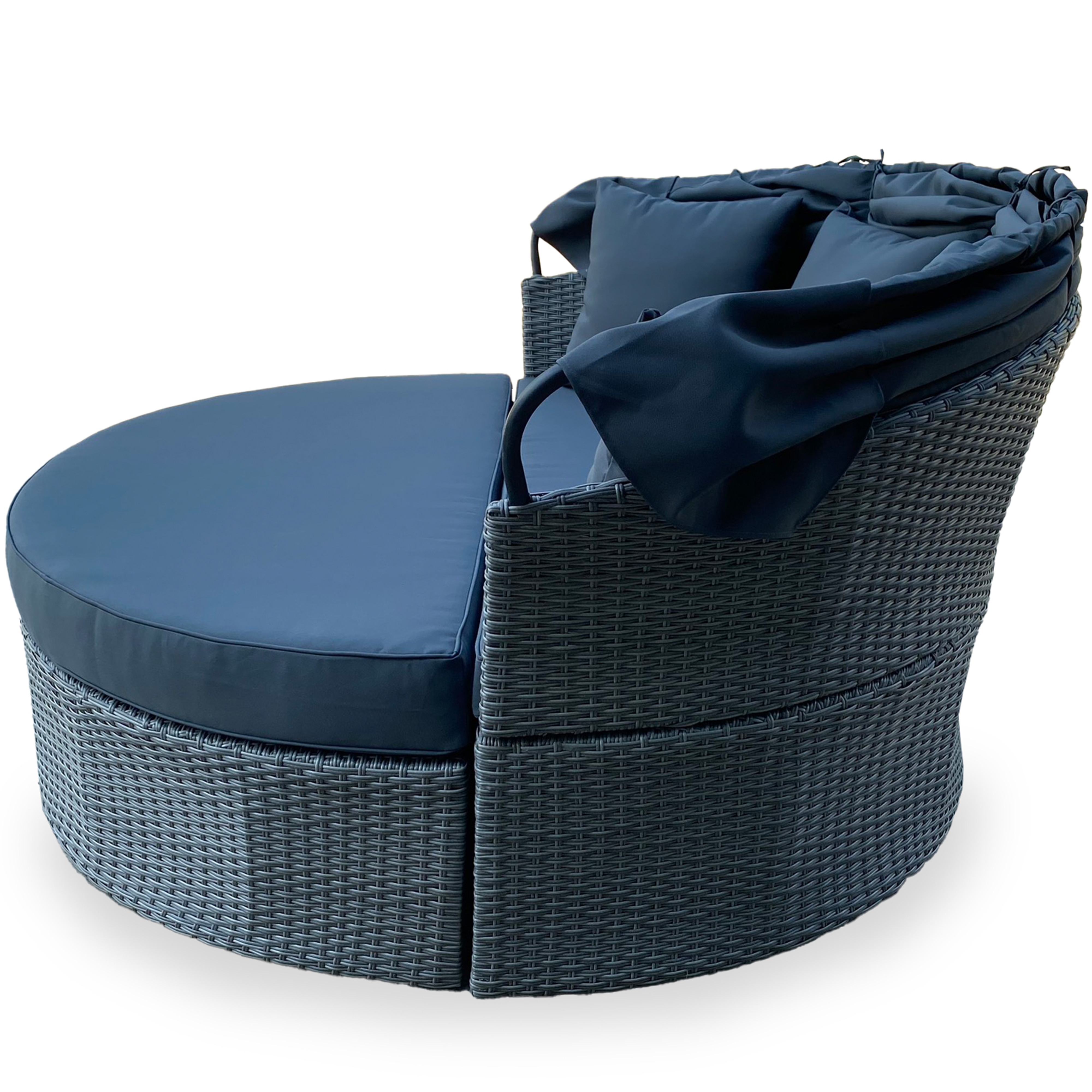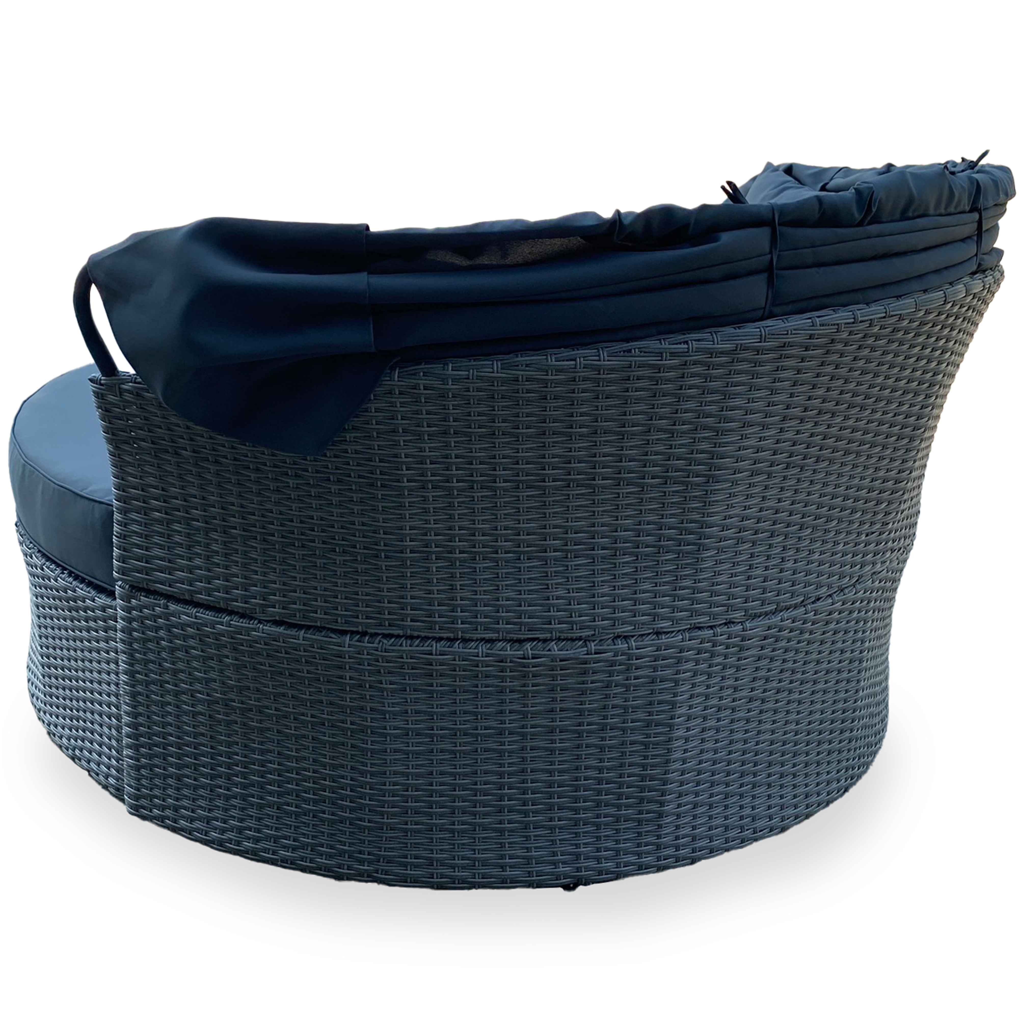La structure est en rotin industriel de haute qualité, qui se caractérise par une grande stabilité et une grande élasticité. Le matériau est hydrofuge, résistant aux intempéries et durable, ce qui rend l'îlot de soleil idéal pour une utilisation en extérieur tout au long de l'année. La couleur grise intemporelle souligne le look moderne et peut être combinée de nombreuses façons.