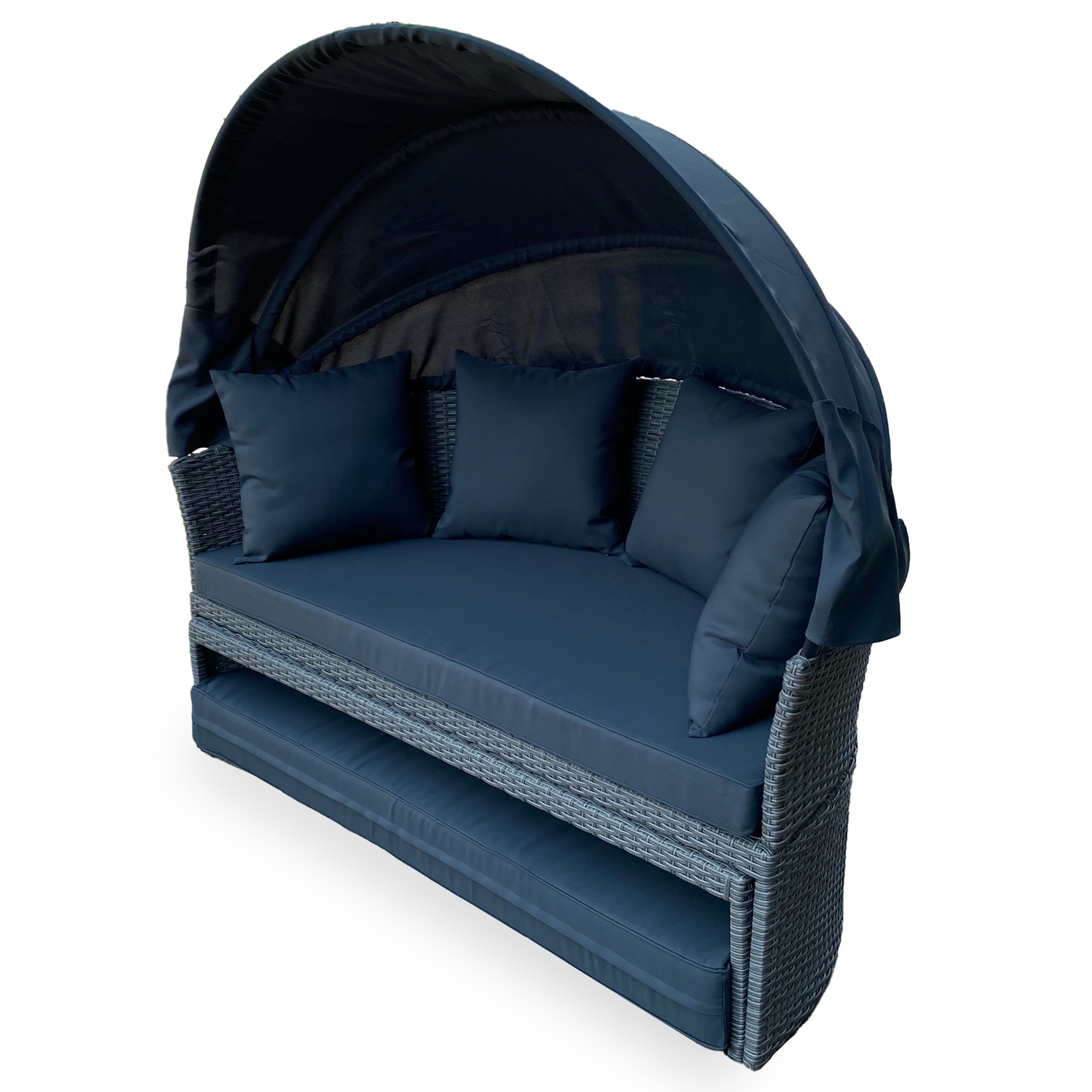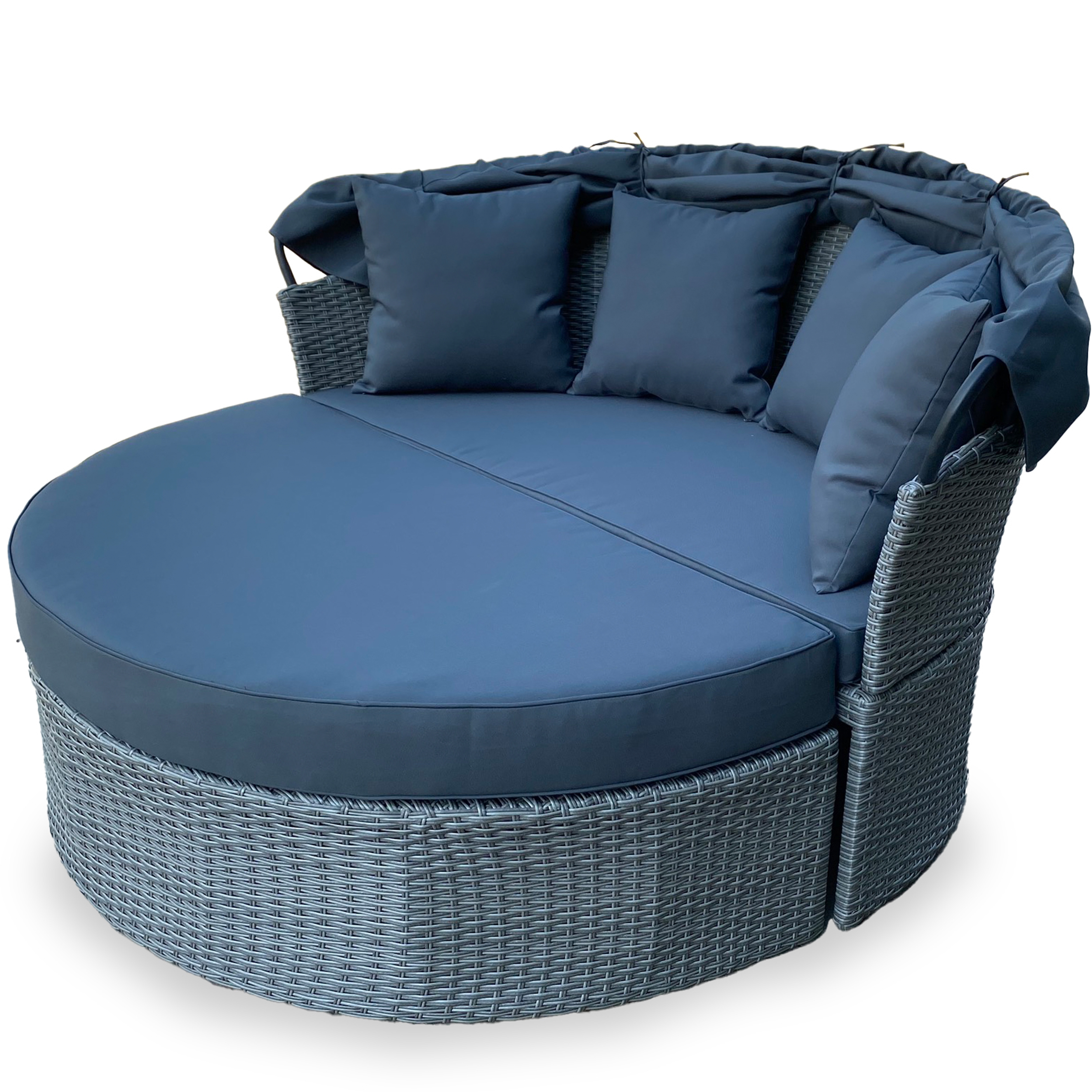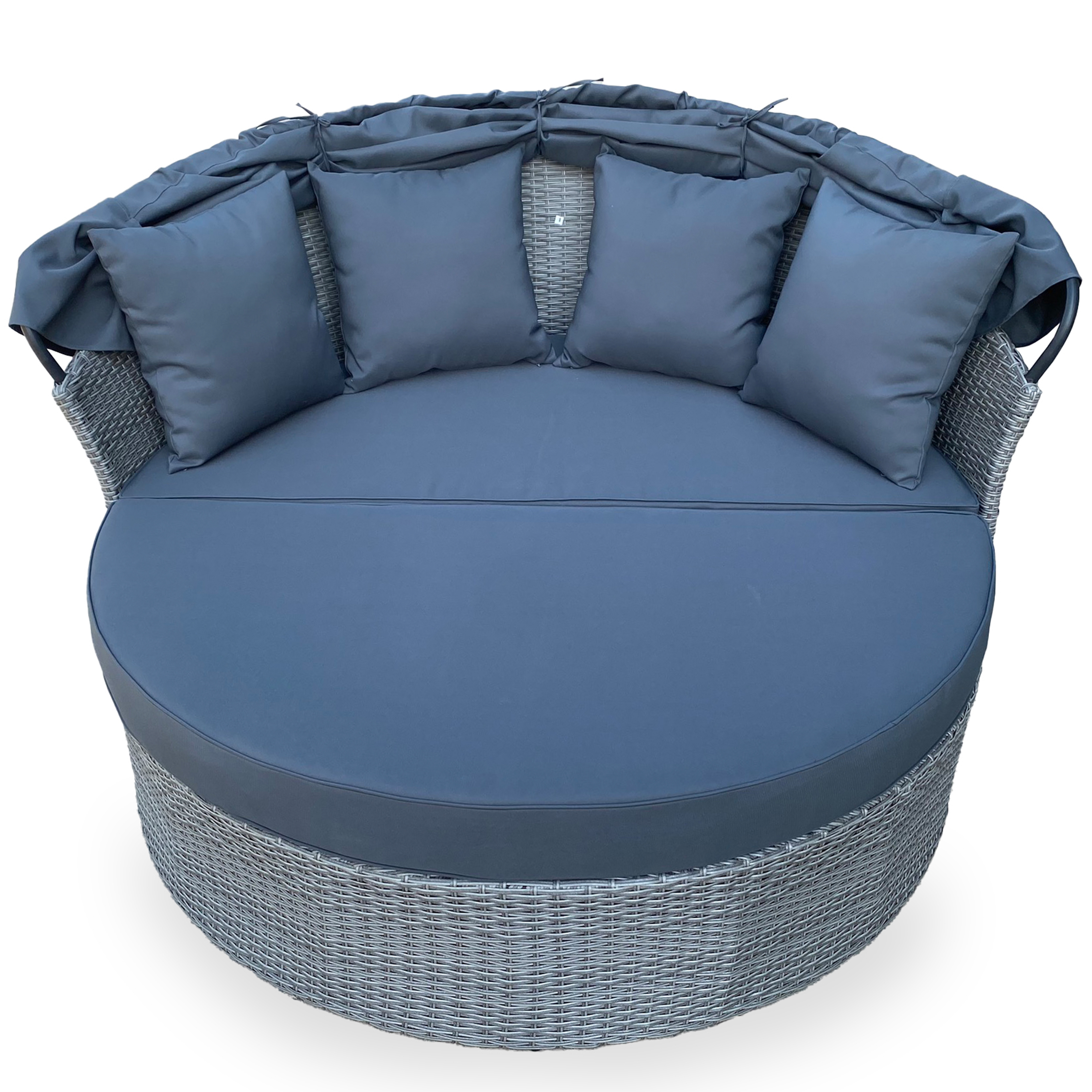 La structure est en rotin industriel de haute qualité, qui se caractérise par une grande stabilité et une grande élasticité. Le matériau est hydrofuge, résistant aux intempéries et durable, ce qui rend l'îlot de soleil idéal pour une utilisation en extérieur tout au long de l'année. La couleur grise intemporelle souligne le look moderne et peut être combinée de nombreuses façons.
