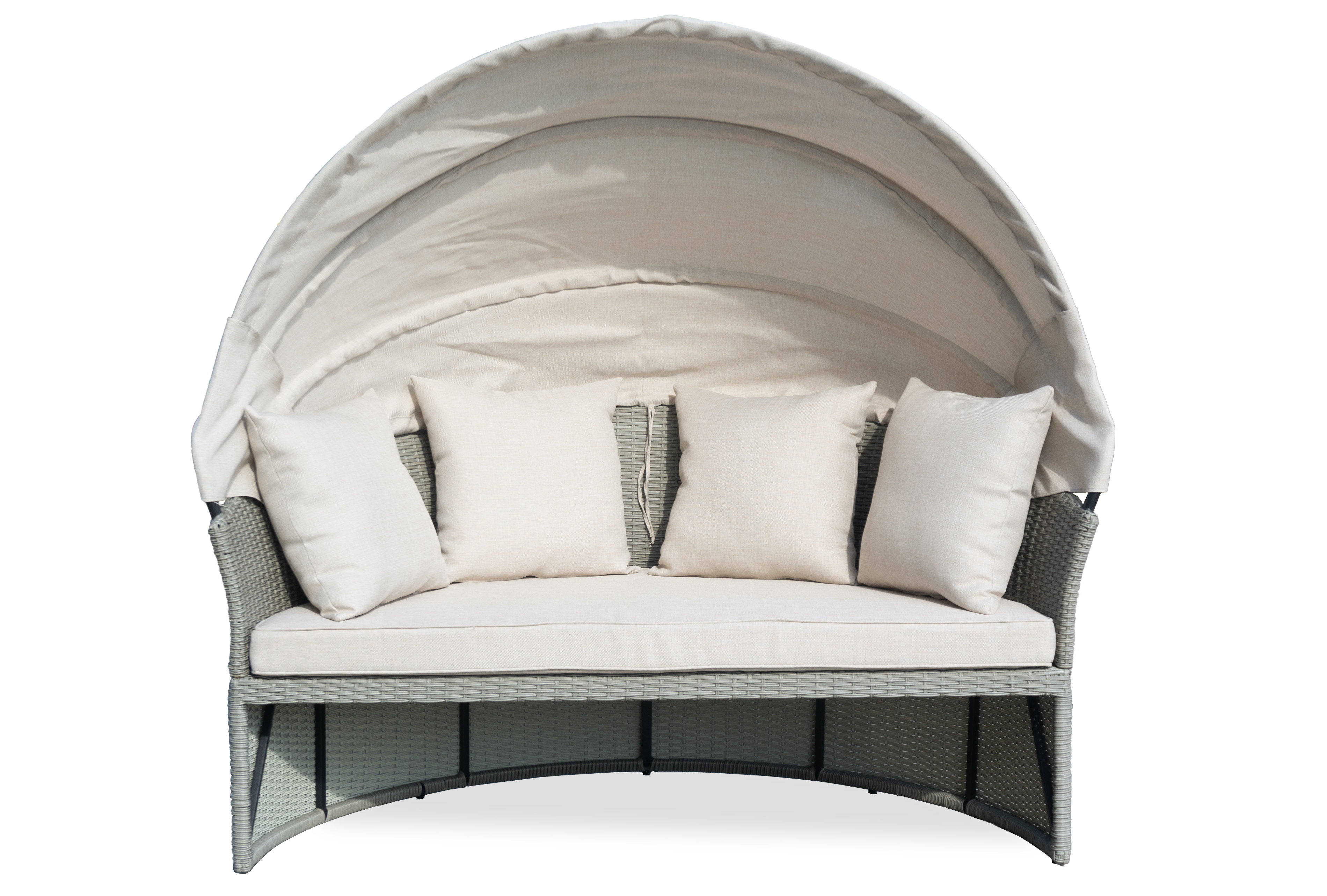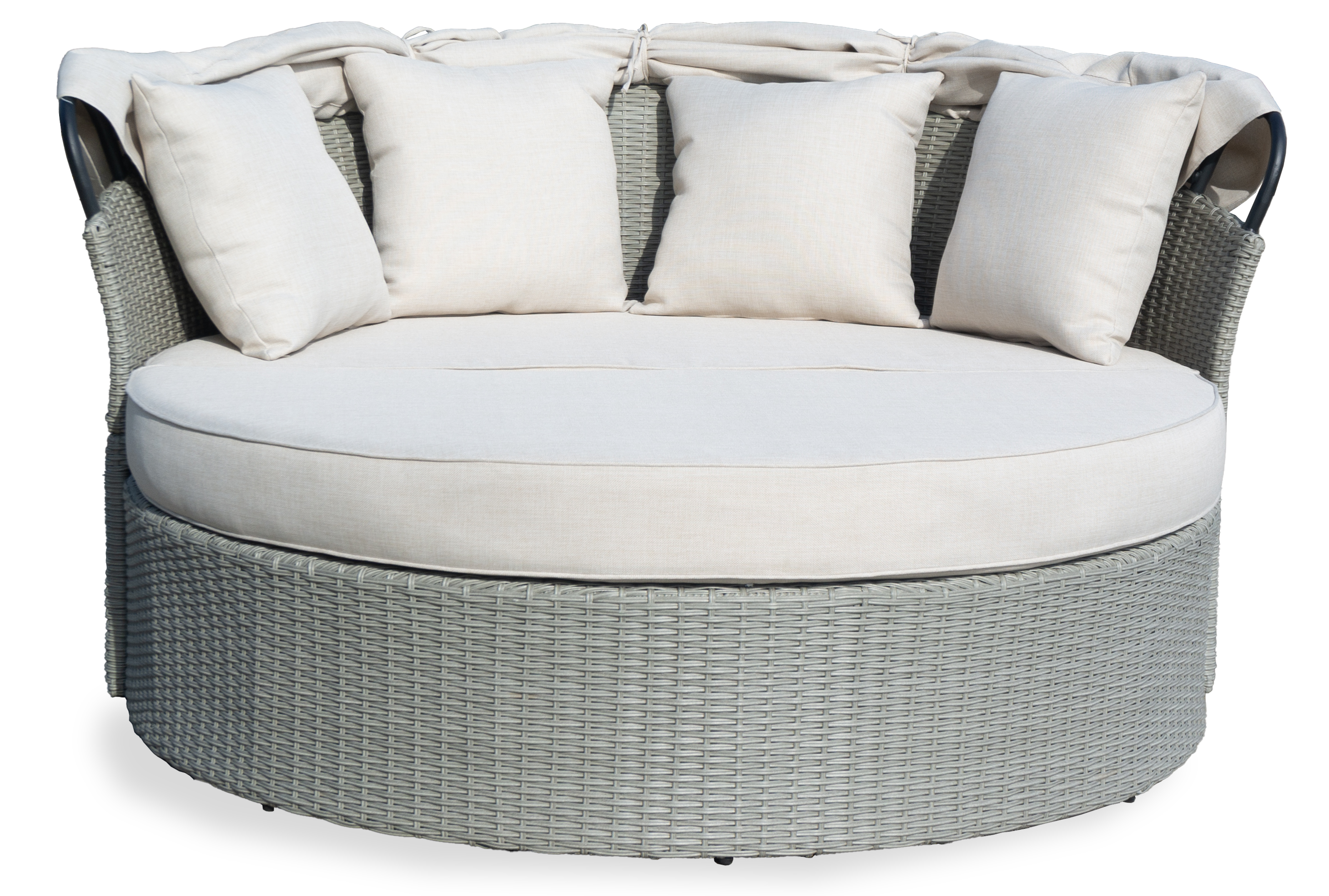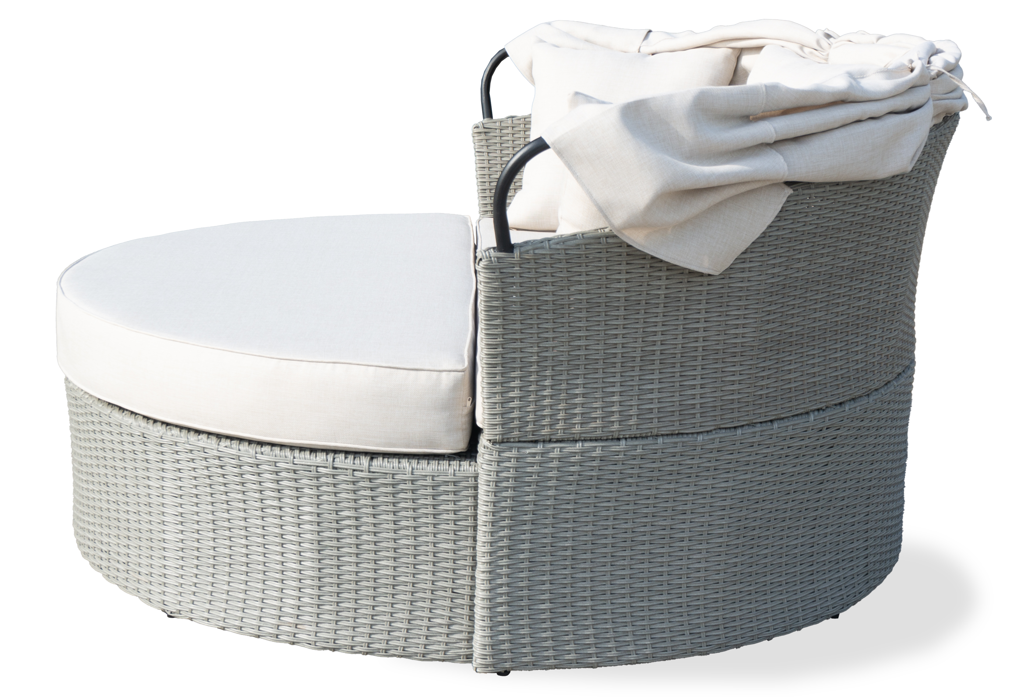 La structure est en rotin industriel de haute qualité, qui se caractérise par une grande stabilité et une grande élasticité. Le matériau est hydrofuge, résistant aux intempéries et durable, ce qui rend l'îlot de soleil idéal pour une utilisation en extérieur tout au long de l'année. La couleur grise intemporelle souligne le look moderne et peut être combinée de nombreuses façons.