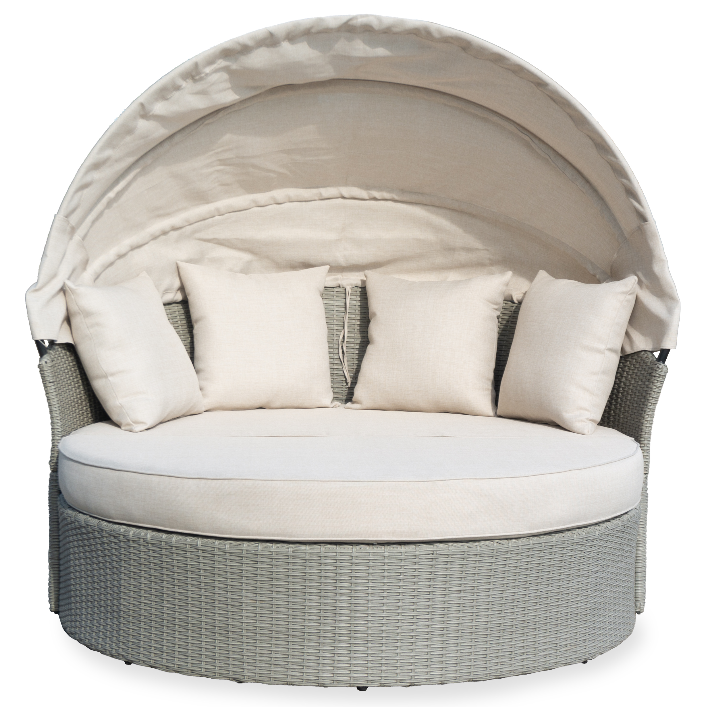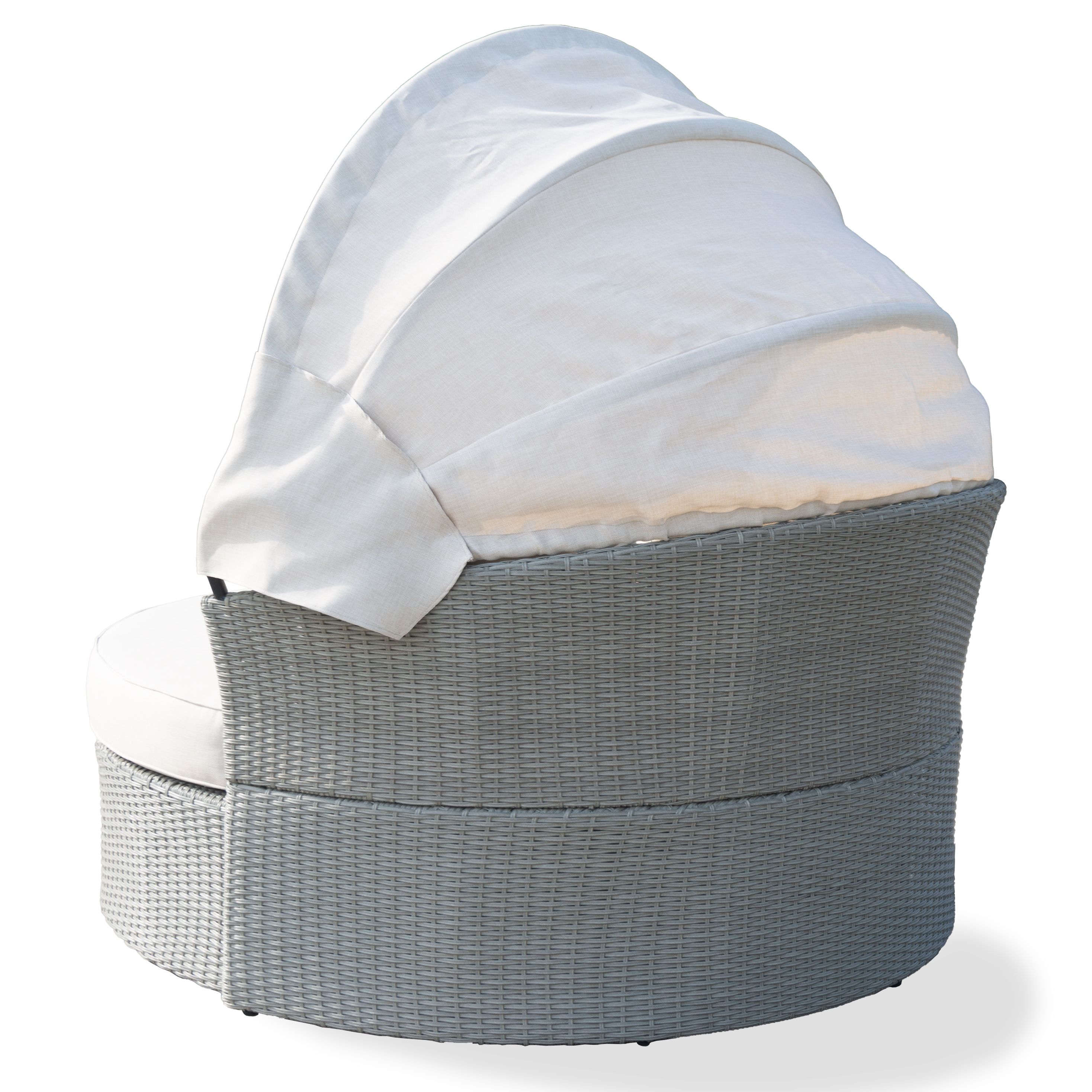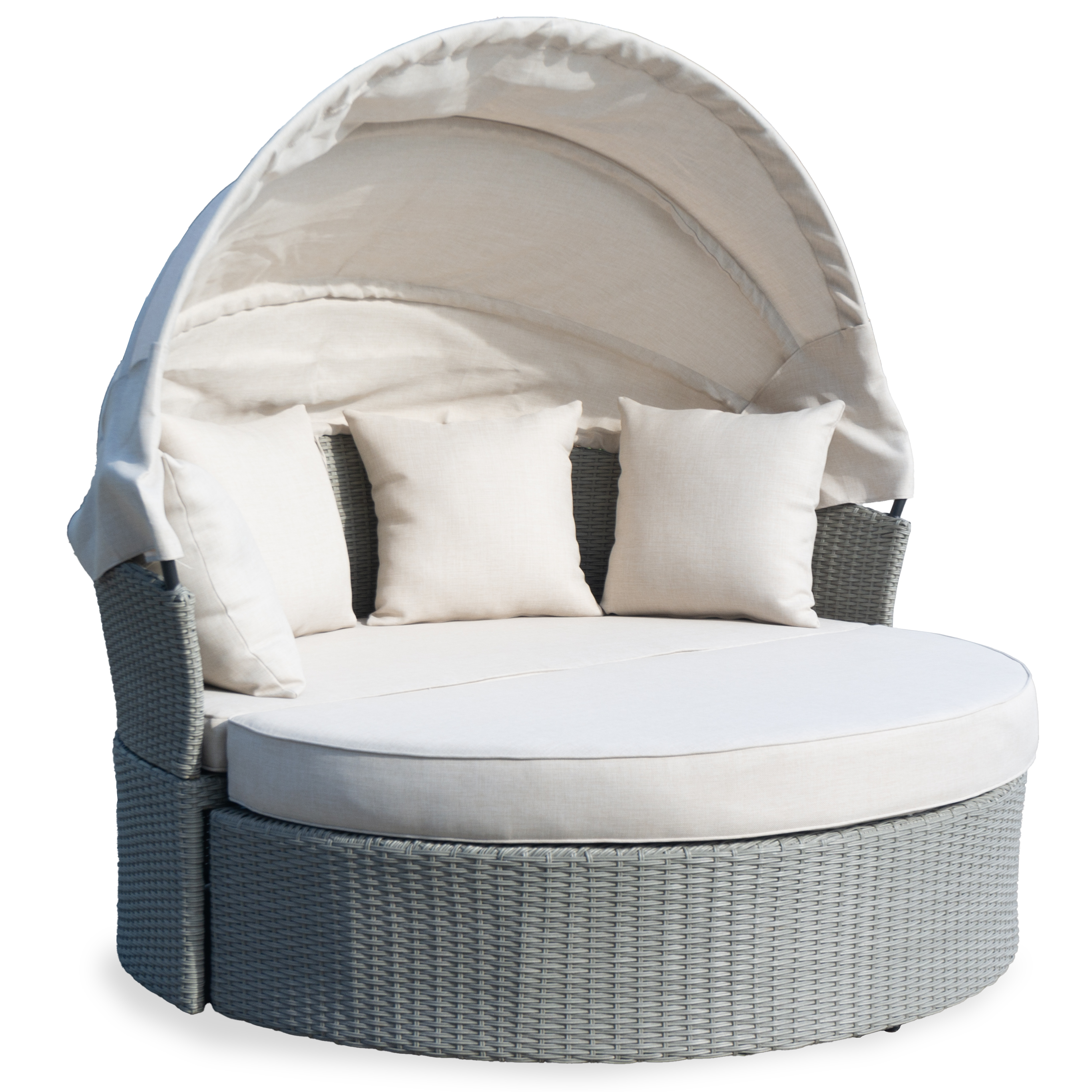 La structure est en rotin industriel de haute qualité, qui se caractérise par une grande stabilité et une grande élasticité. Le matériau est hydrofuge, résistant aux intempéries et durable, ce qui rend l'îlot de soleil idéal pour une utilisation en extérieur tout au long de l'année. La couleur grise intemporelle souligne le look moderne et peut être combinée de nombreuses façons.