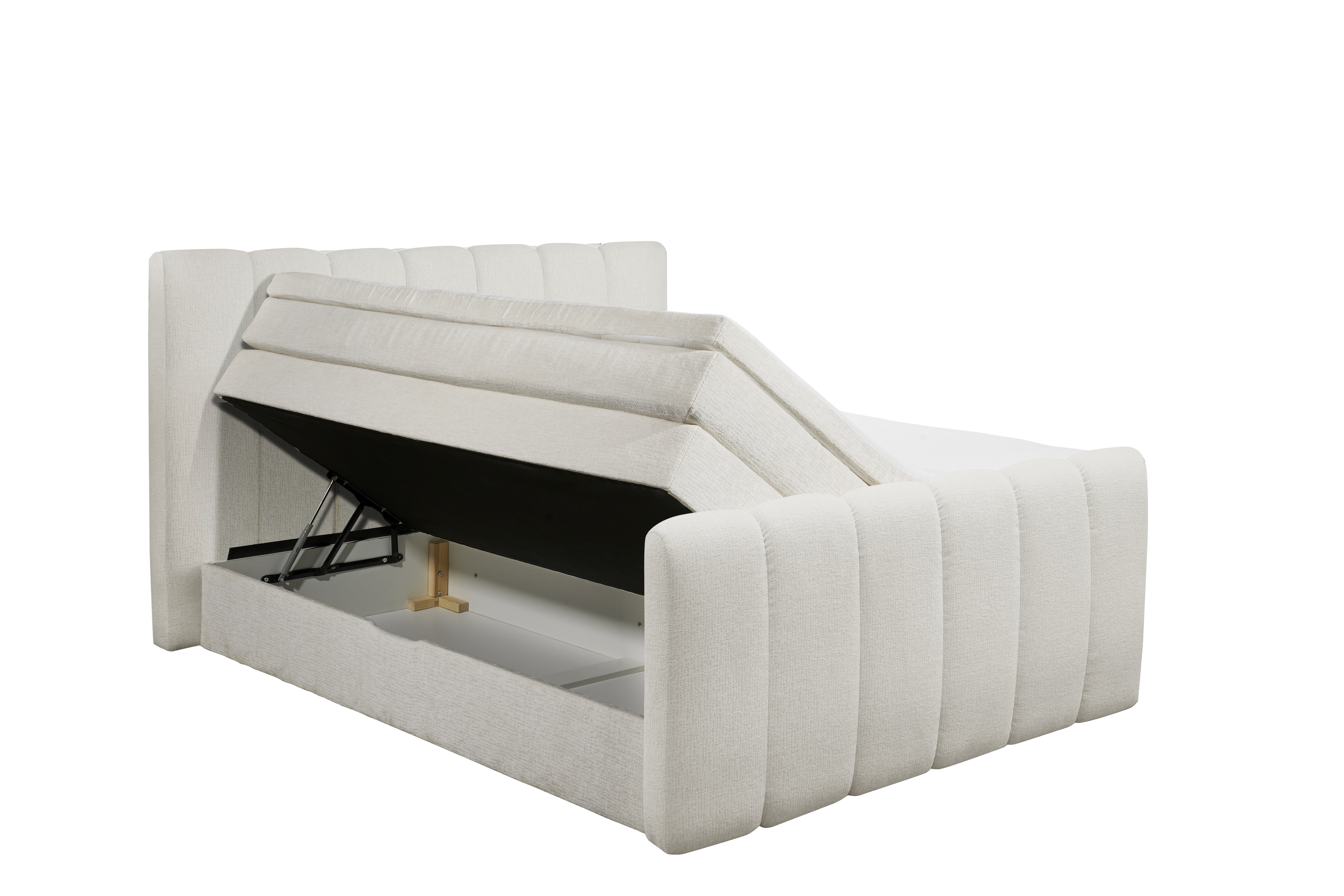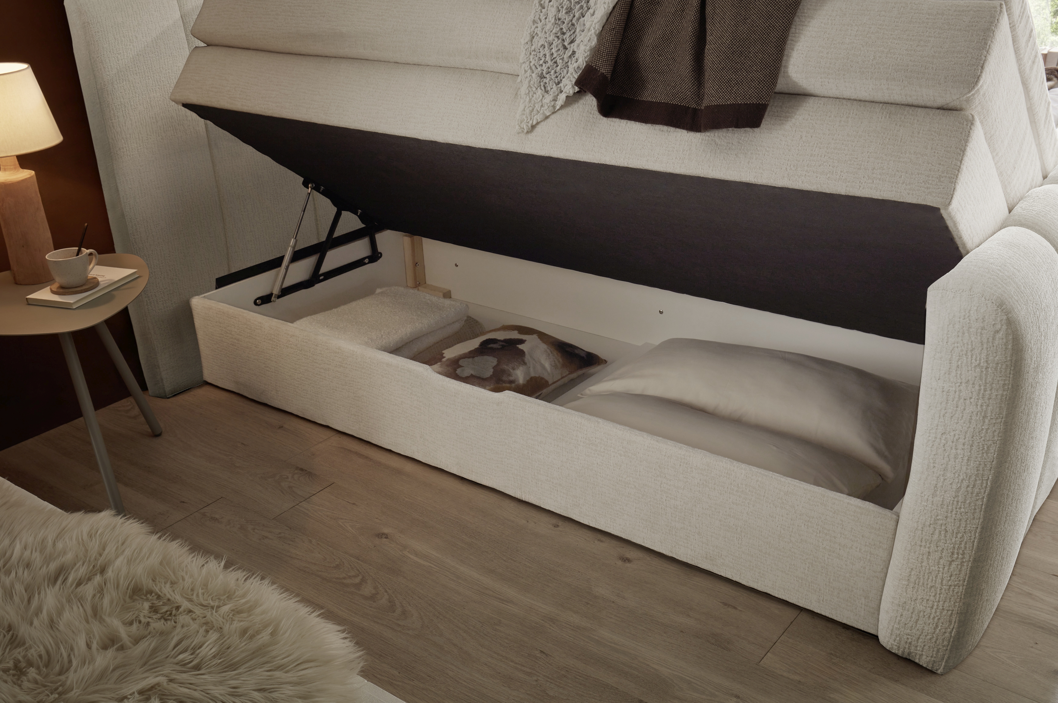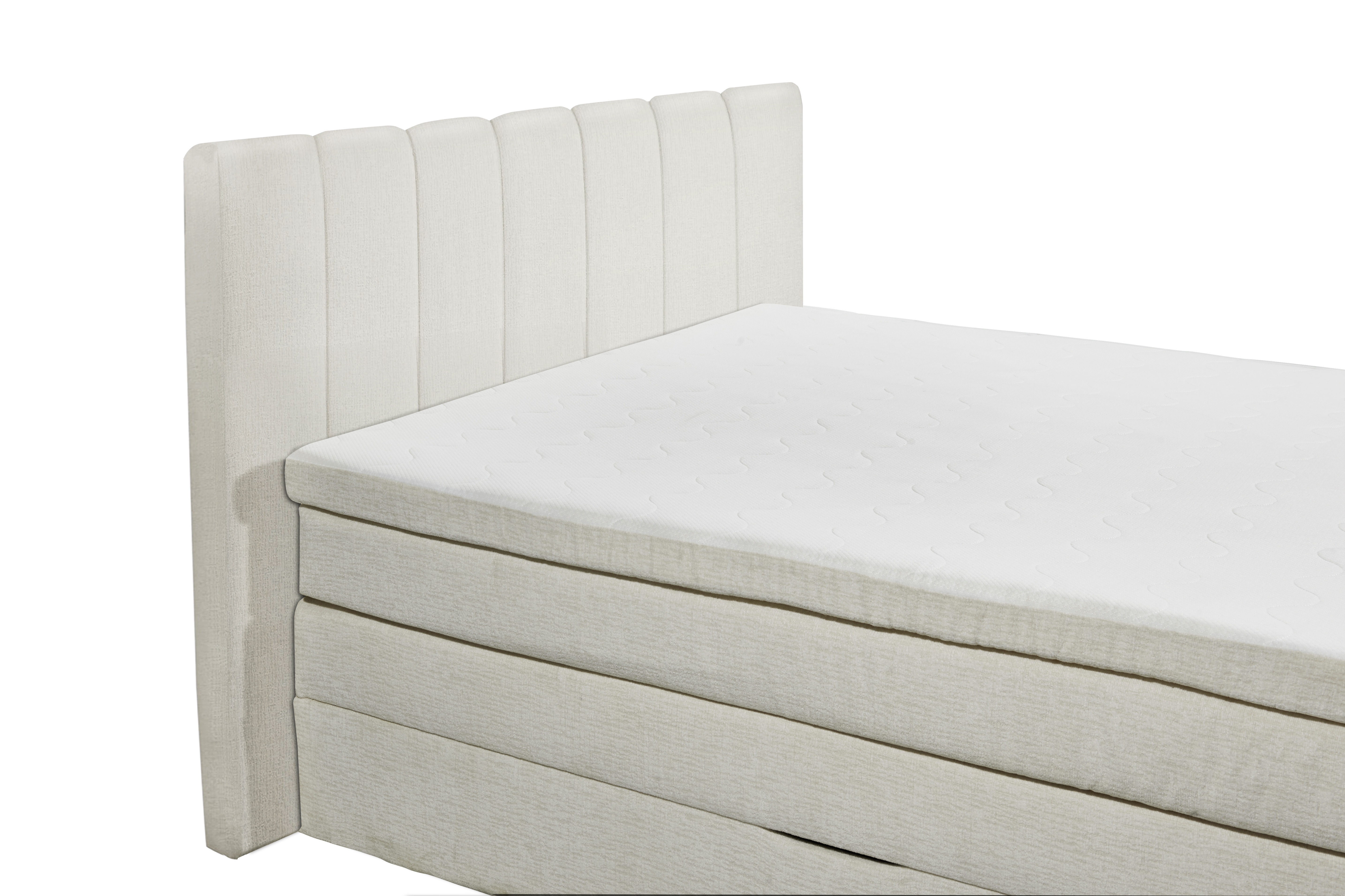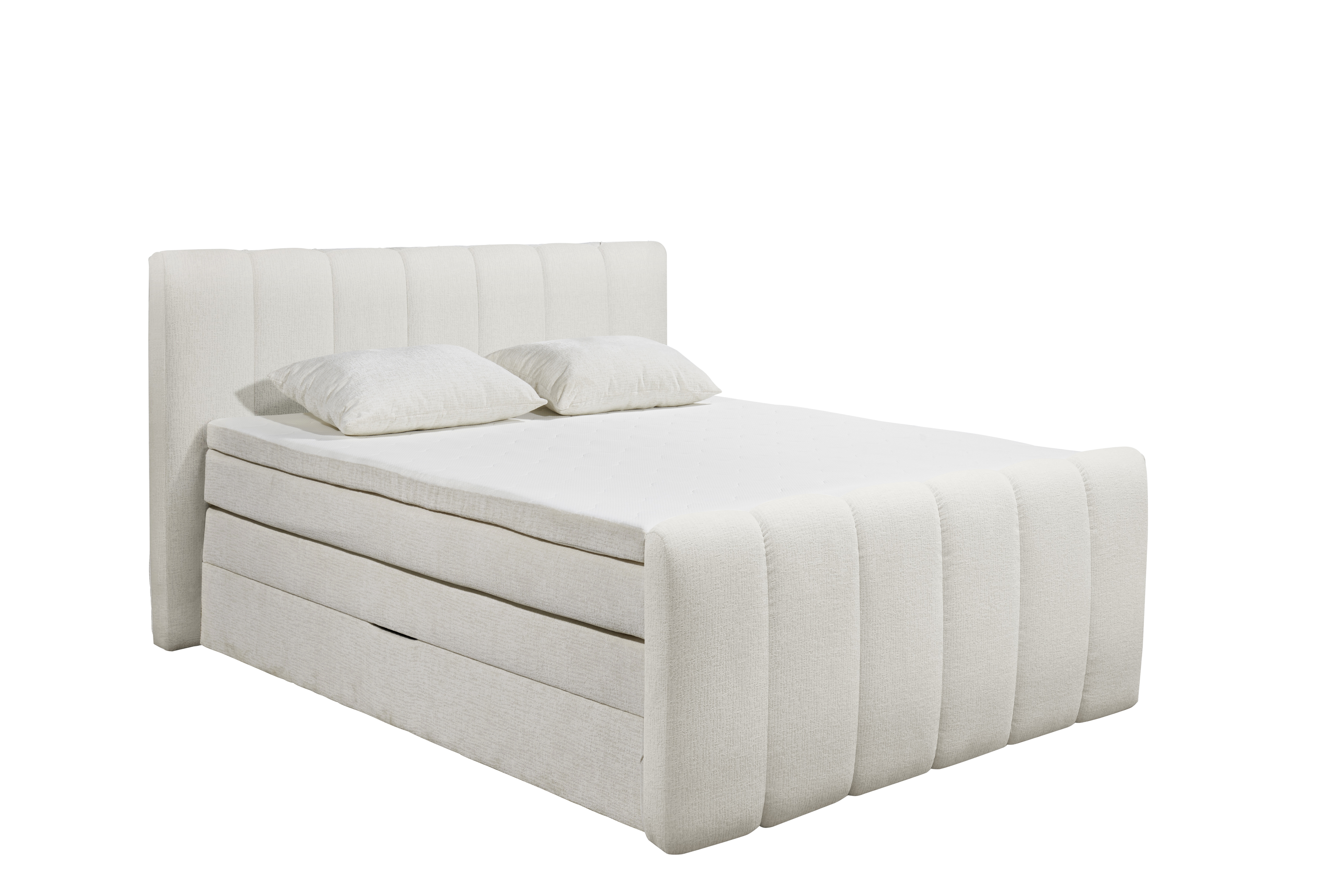 Ce lit boxspring allie des équipements fonctionnels à une fabrication solide et un confort de couchage agréable. La housse de couleur ivoire 100 % polyester est facile d'entretien et confère au lit un aspect clair et neutre. Deux sommiers à ressorts Bonell et des matelas à ressorts ensachés assortis offrent un confort de couchage moyennement ferme (degré de fermeté H2). Un surmatelas confort en mousse T25 améliore encore le soulagement de la pression – sa housse est lavable à 40 °C. Des coffres de rangement accessibles latéralement sous la surface de couchage offrent un espace de rangement pratique. La tête et le pied de lit sont matelassés et complètent l'ensemble de manière fonctionnelle. Le lit peut supporter une charge maximale d'environ 120 kg et est livré sans décoration.