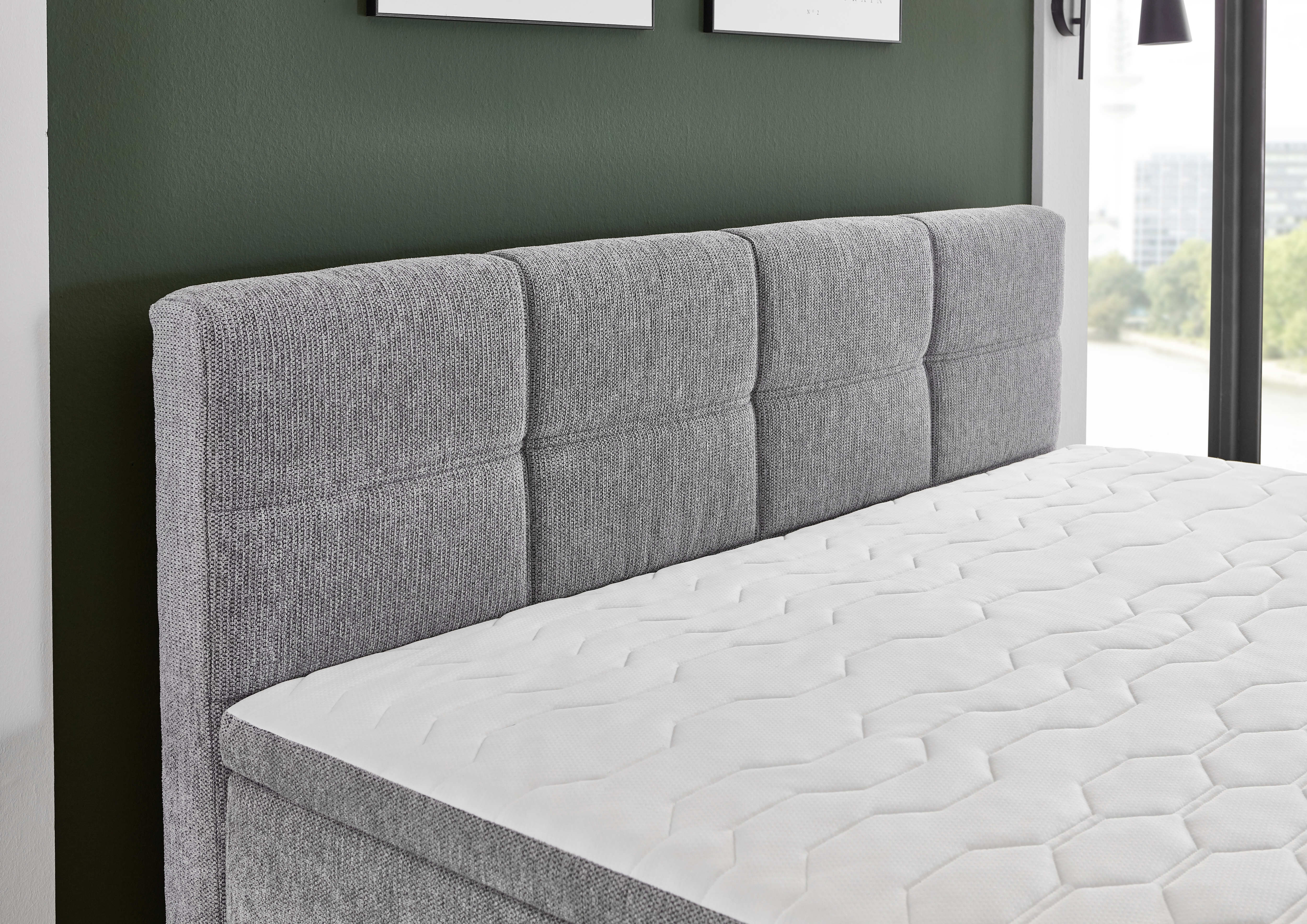 Revetement : lit boxspring en tissu 50530-720 couleur argent, 100 % polyester ; surface de couchage/double toile 100 % polyester