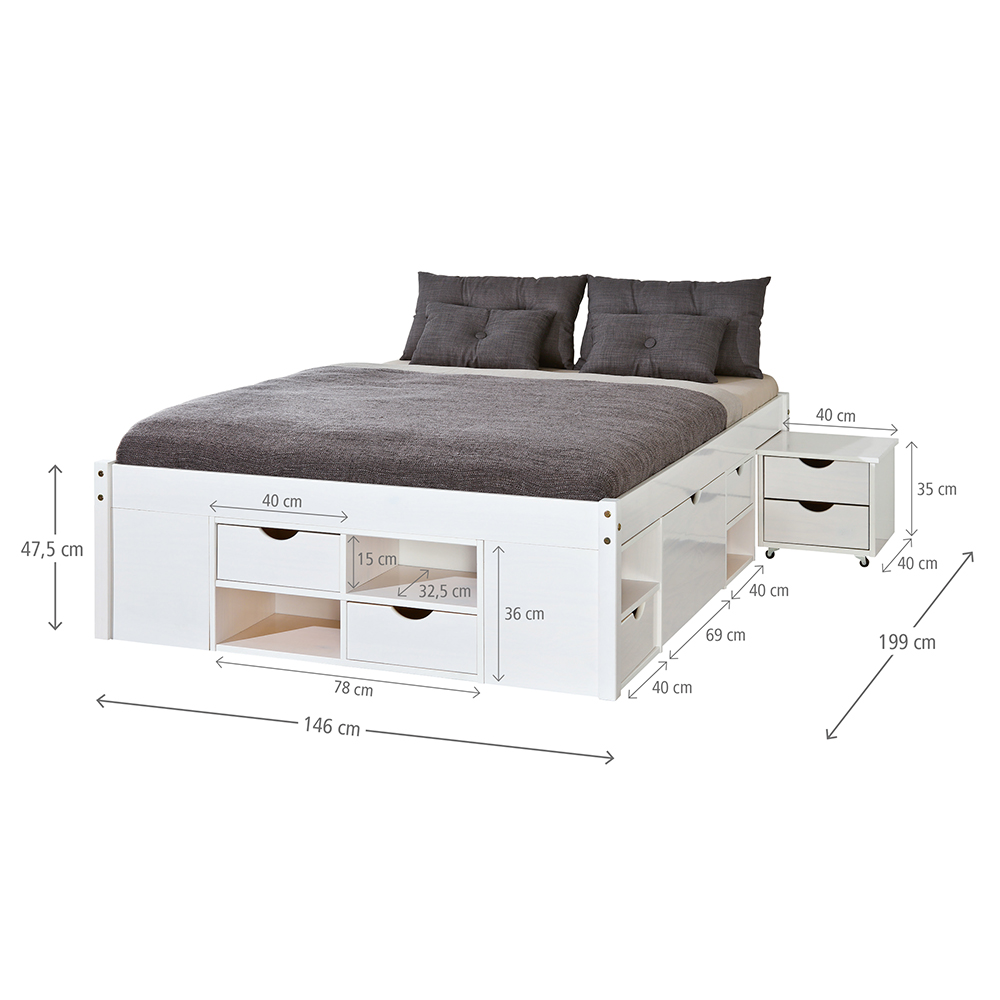 | Equipement lits: | Tiroirs, incl. chevet(s), incl. sommier à lattes , sans tête de lit | ||