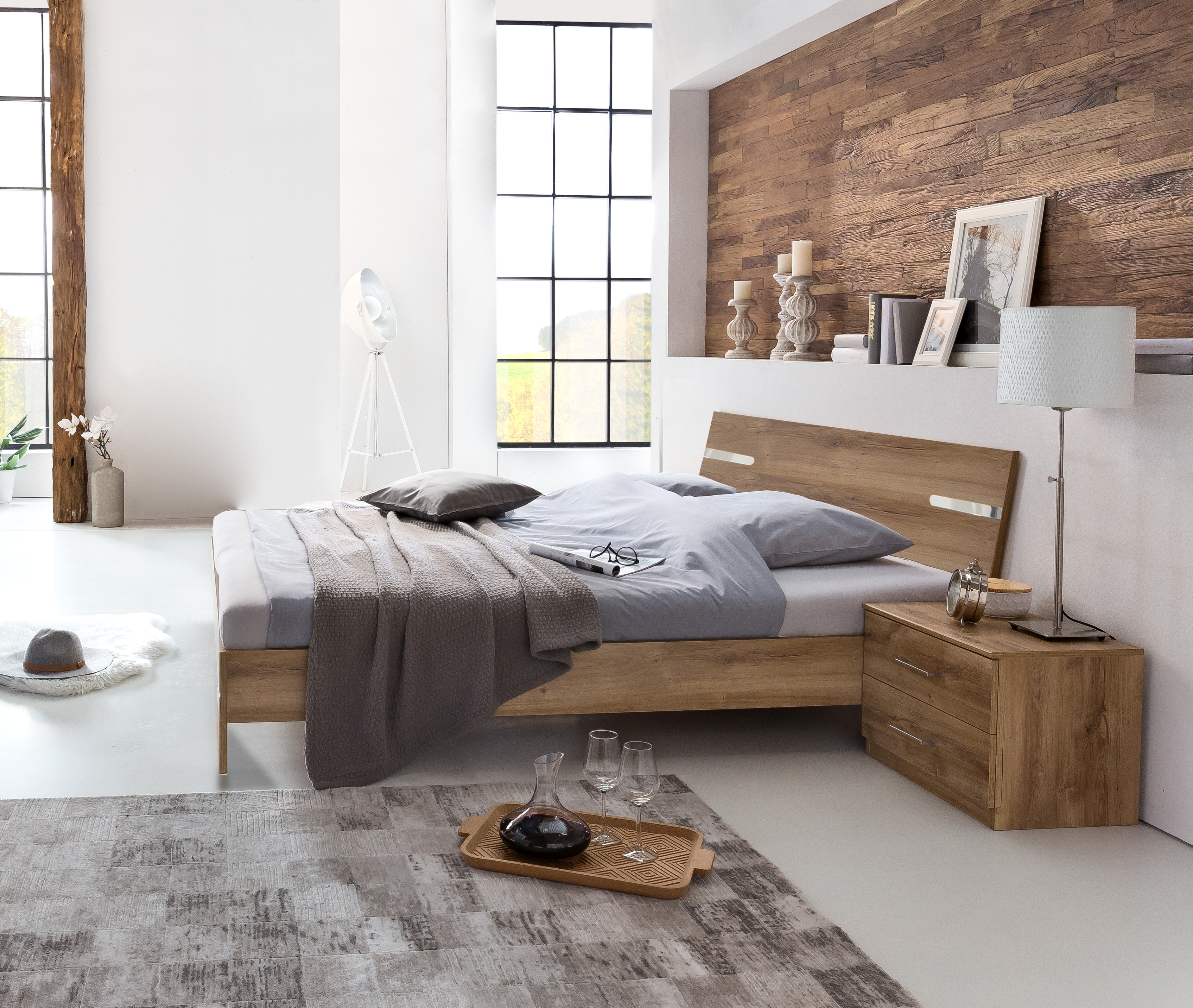 Caisson et façade : décor planches de chêne avec lattes ton chrome brillant