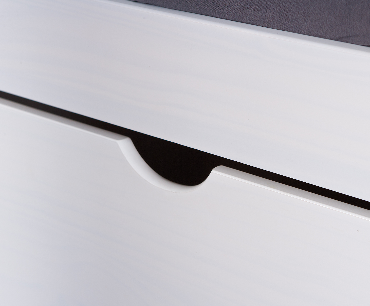 Fabriqué en pin massif laqué blanc, ce meuble est protégé par un vernis pauvre en COV (composés organiques volatils), hydrofuge et facile d’entretien. Le veinage naturel du bois reste visible, conférant au lit une apparence élégante et discrète.
