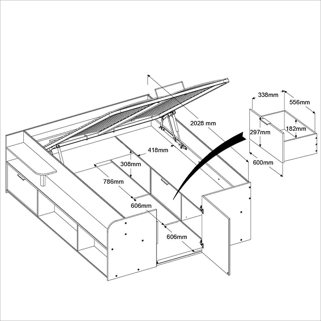 Côté gauche du lit : 1 tiroir, étagères, 1 marche, tête et pied de lit - soft