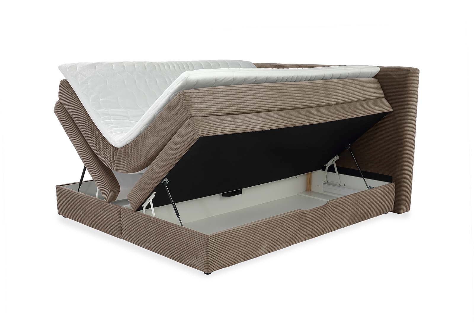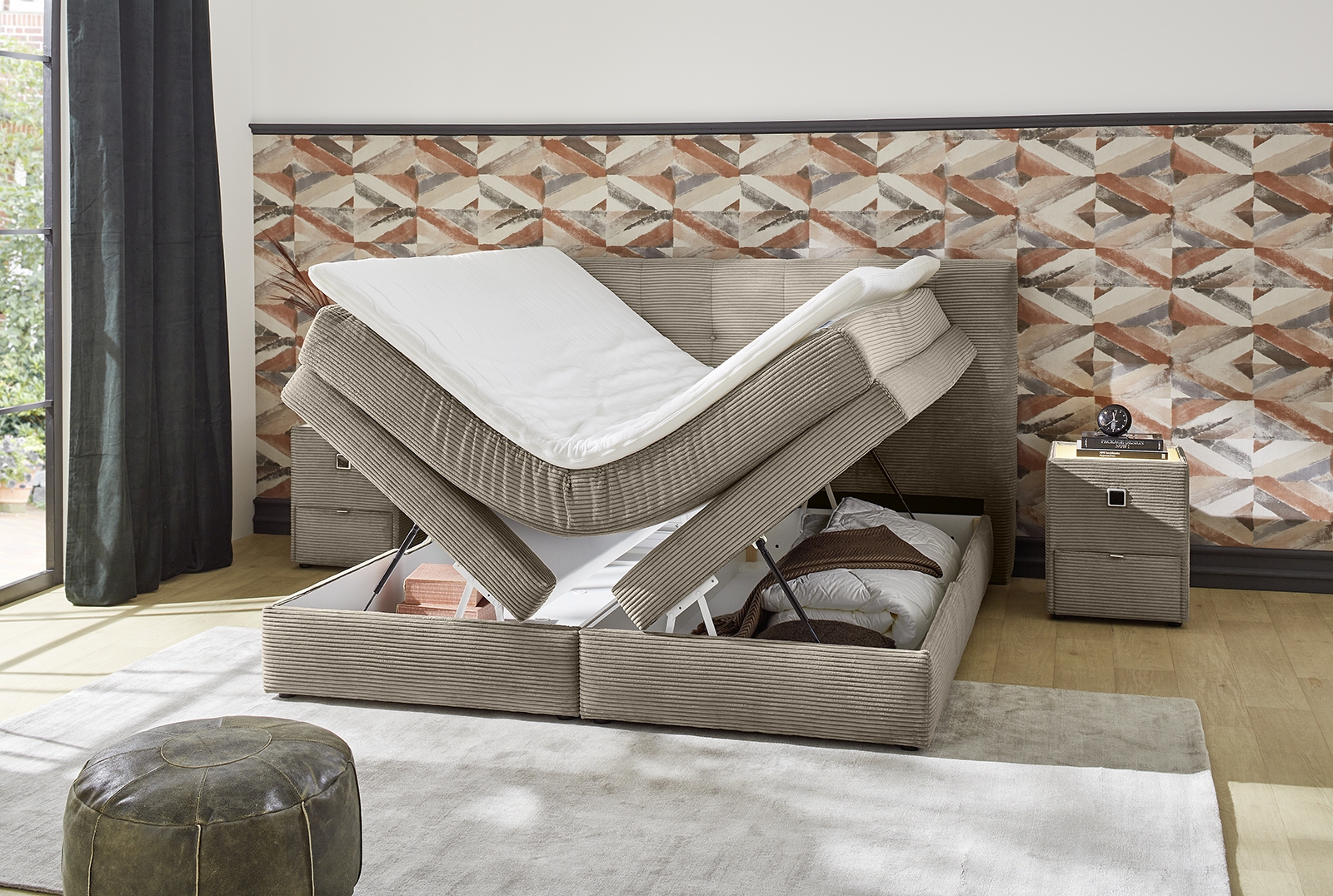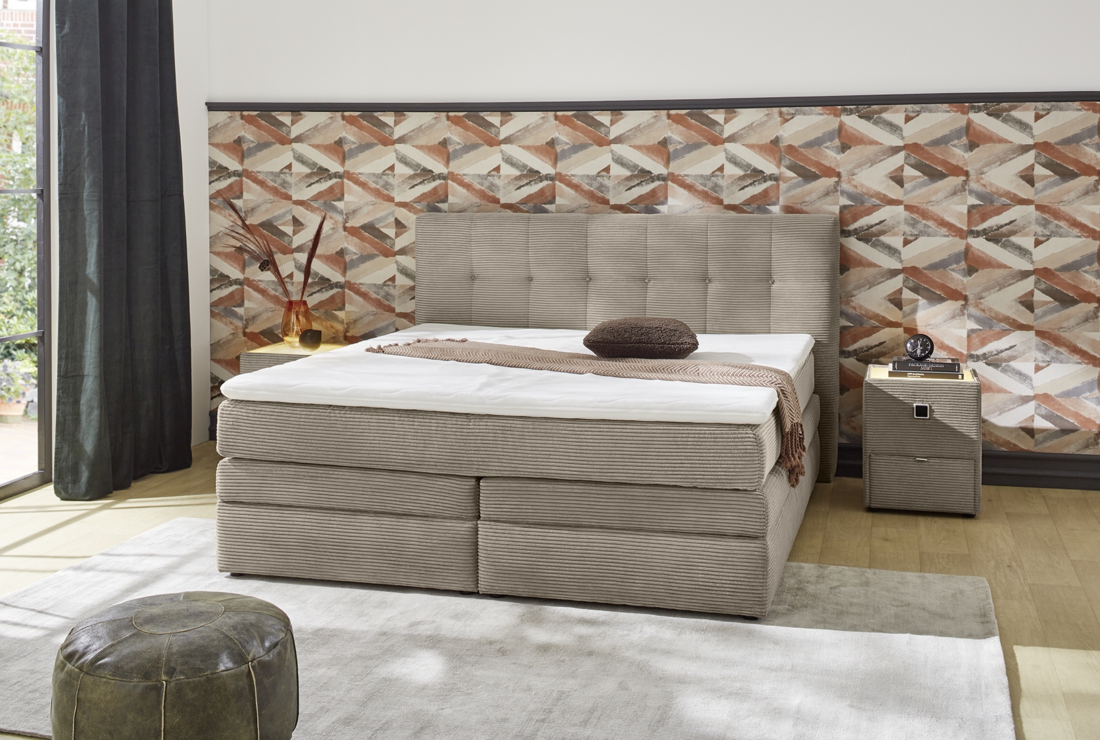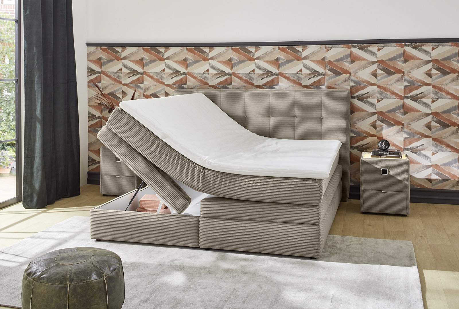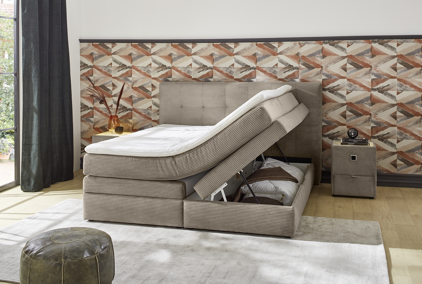 La base de ce lit boxspring est un caisson avec garnissage à ressorts bonnell utilisé comme suspension. Sur le caisson se trouve un matelas de qualité 7 zones à ressorts ensachés tonneaux dans un revêtement duo qui empêche les matelas de glisser. La double suspension ainsi formée crée un confort unique avec une adaptation optimale à la morphologie et à la pression corporelle. Le surmatelas en mousse haute résilience vient parfaire cette expérience de couchage unique. Ce lit boxspring garantit un confort de couchage extraordinaire grâce à son excellent système individuel de suspension double.