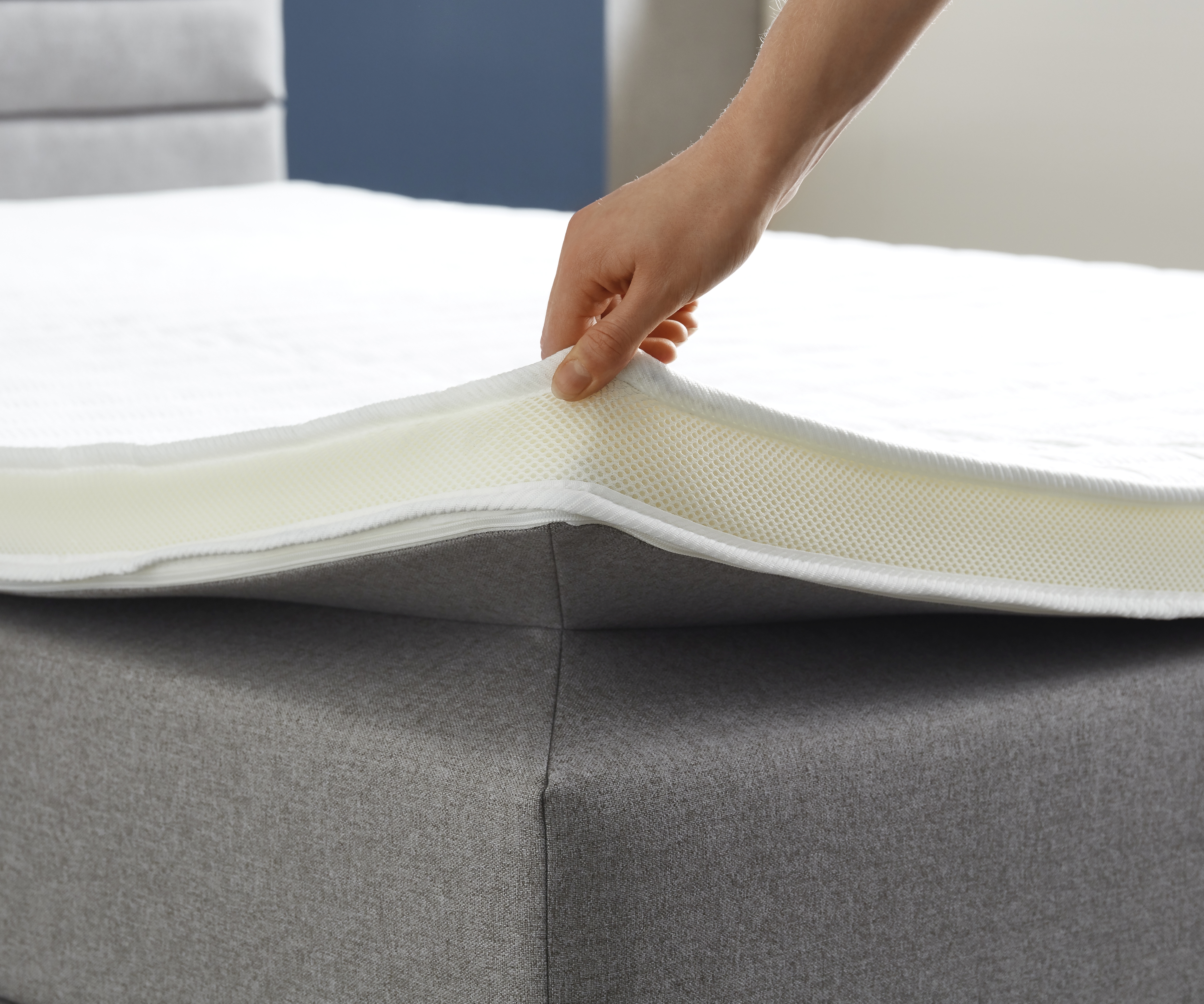 Le surmatelas est cousu au matelas, lui donnant l’aspect d’un surmatelas séparé sans que celui-ci ne puisse glisser. Il est ainsi possible de fixer un drap housse sans que les faces du matelas ne soient recouvertes.