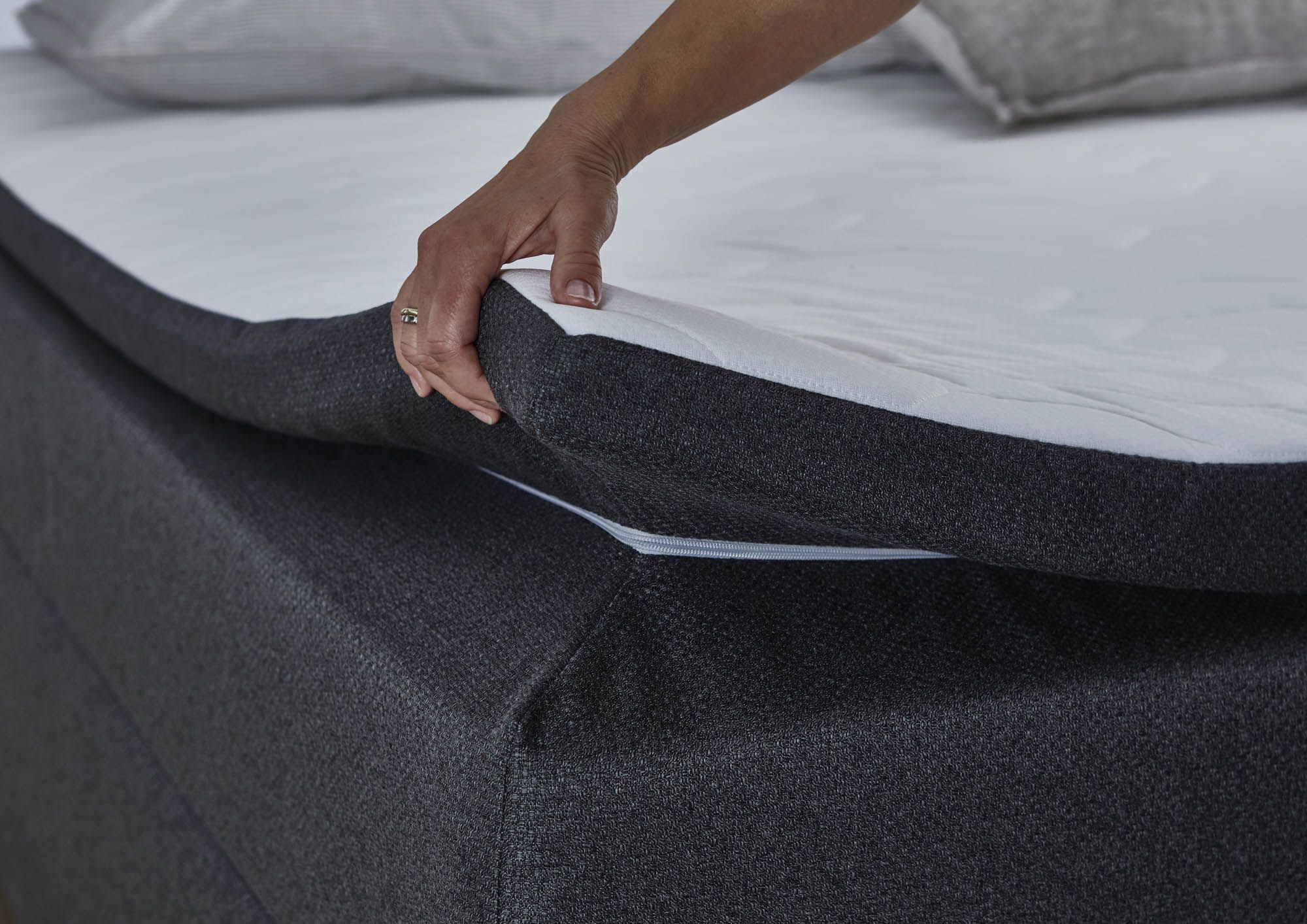 Surmatelas cousu avec le matelas de base aspect séparé, sans que ce dernier ne puisse glisser. Grâce au chevauchement, il est également possible de fixer un drap housse sans que les faces latérales du matelas ne soient cachées.