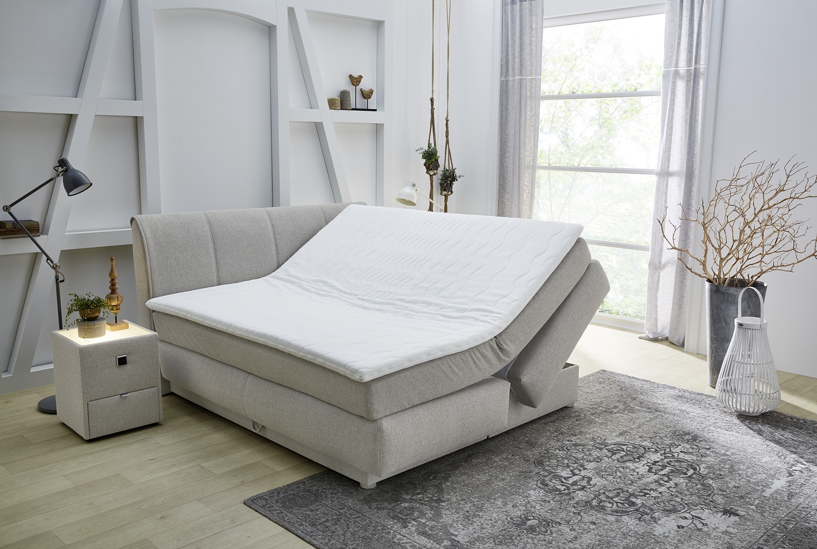 La base de ce lit boxspring tendance est un caisson avec garnissage à ressorts bonnell utilisé comme suspension. Sur le caisson se trouve un matelas de qualité 7 zones à ressorts ensachés en forme de tonneaux dans un revêtement duo qui empêche les matelas de glisser. La double suspension ainsi formée crée un confort unique avec une adaptation optimale à la morphologie du dormeur et à la pression corporelle. Le surmatelas en mousse haute résilience vient parfaire cette expérience de couchage unique. Ce système boxspring garantit un confort de sommeil extraordinaire grâce à son excellent système individuel de suspension double.