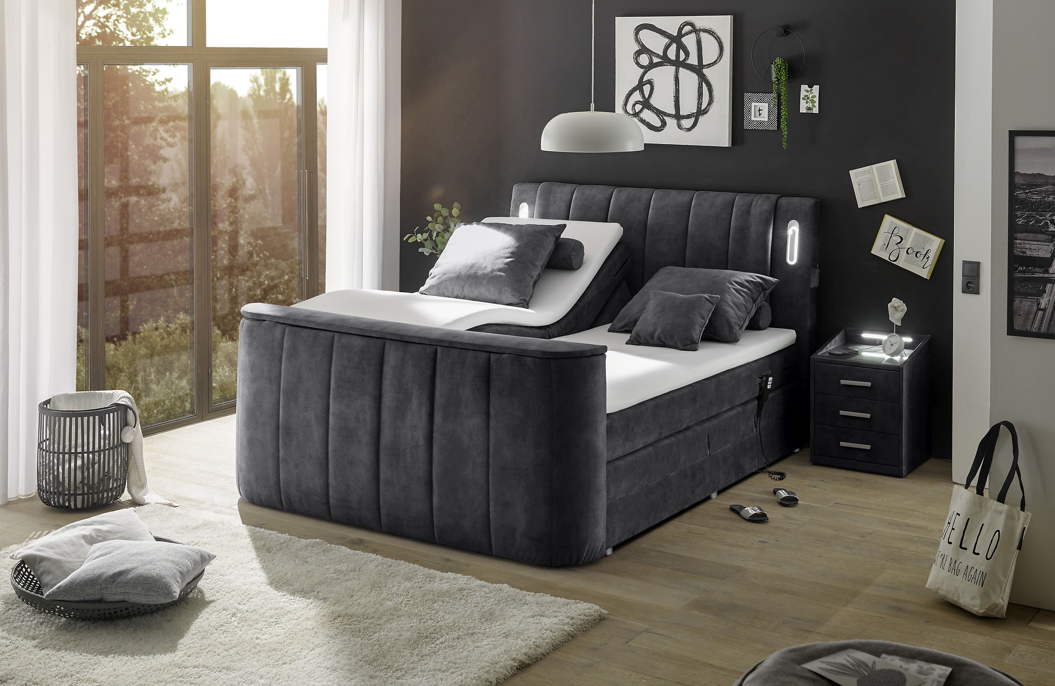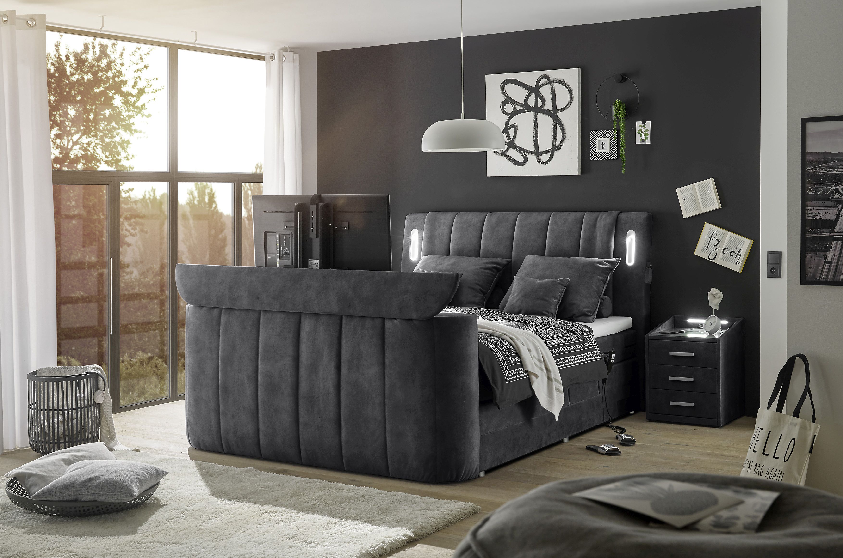 1 pied de lit matelassé avec espace de rangement pour téléviseur jusqu'à 40 pouces (fixation TV motorisée)