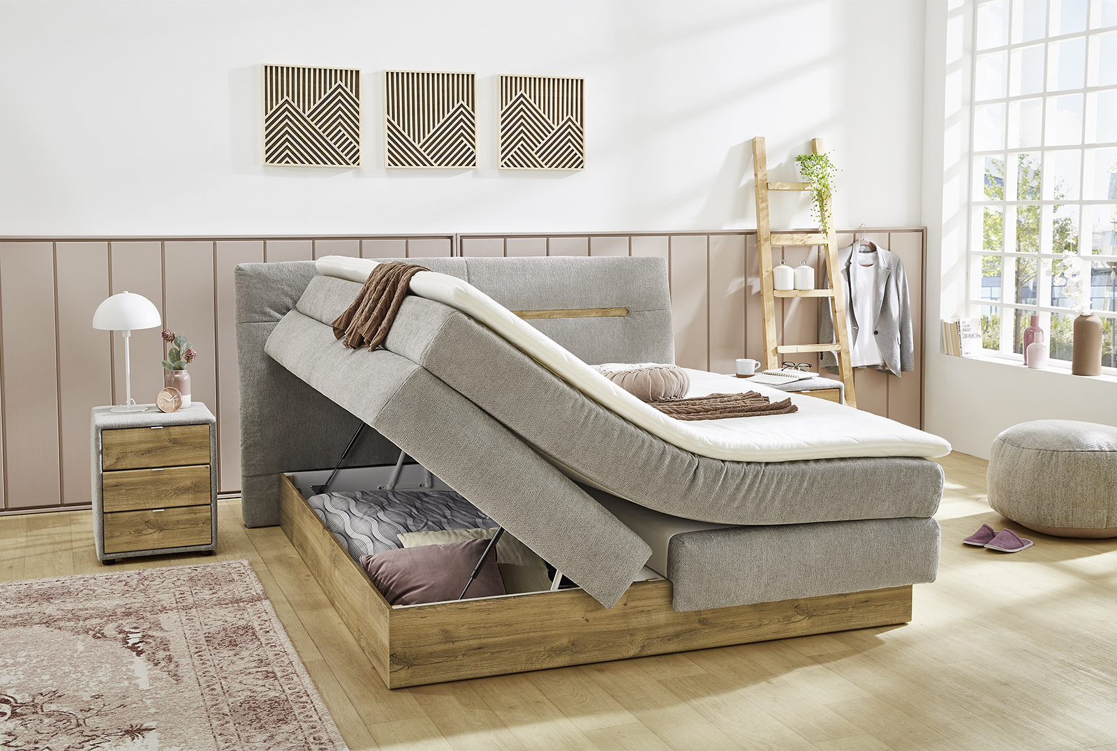 Nika associe un design tendance et naturel avec un aspect pratique indéniable. La combinaison harmonieuse entre le bois et une sélection de tissus permettra de créer une oasis de bien-être dans votre chambre à coucher. Le coffre de rangement facile à ouvrir à l’aide d’un vérin à gaz offre un bel espace pour stocker votre linge de lit de saison.