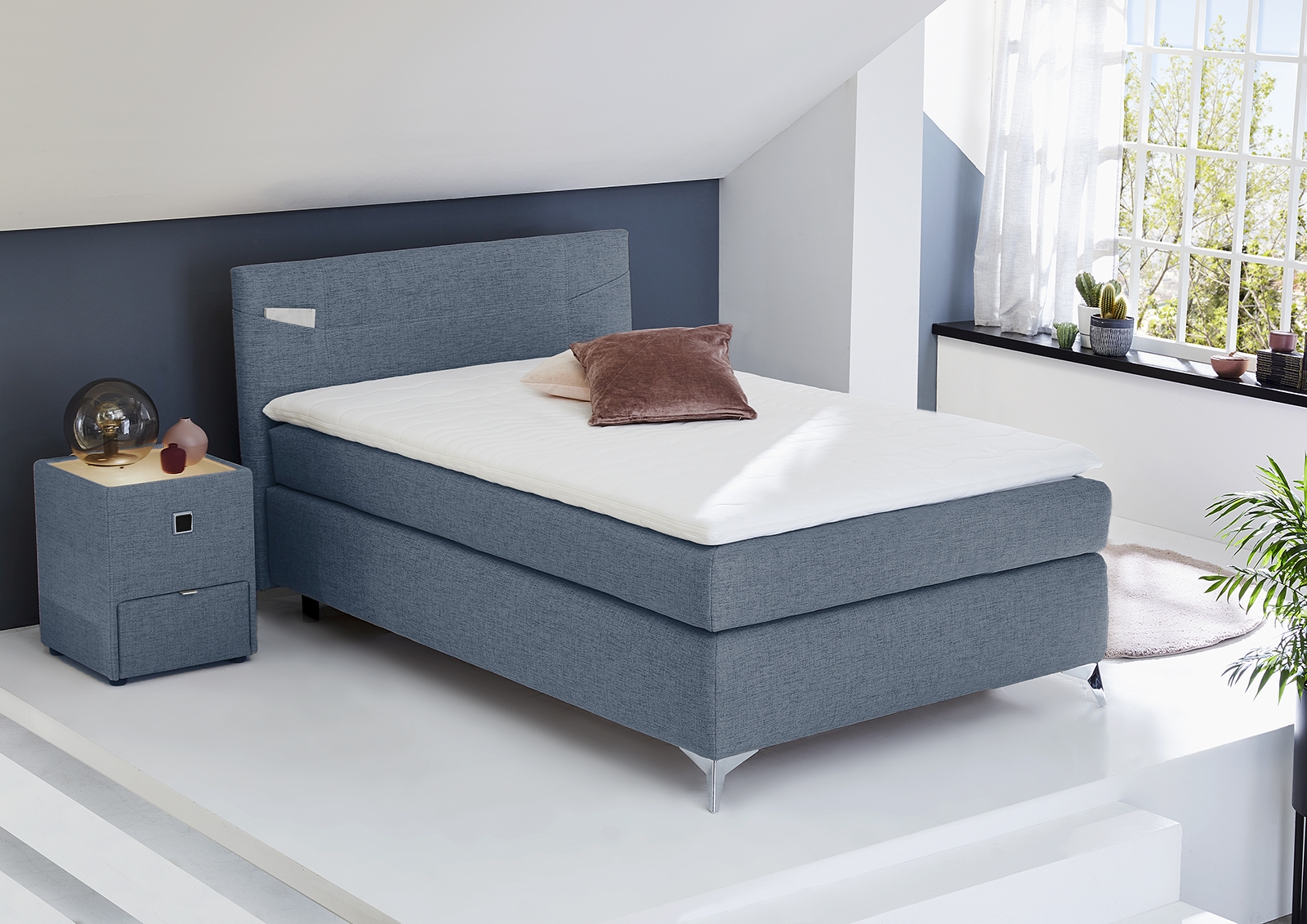 Ce lit boxspring se compose à la base d'un caisson pourvu d'un rembourrage à ressorts bonnell. Le garnissage à ressorts bonnell est utilisé comme suspension. Sur ce caisson se trouve un matelas réversible à ressorts bonnell. La double suspension ainsi formée crée un confort unique avec une adaptation optimale à la morphologie du dormeur et une réduction de la pression. Le surmatelas en mousse polyuréthane vient parfaire cette expérience de couchage unique. Le système boxspring garantit un confort de sommeil extraordinaire grâce à son excellent système individuel de suspension double.