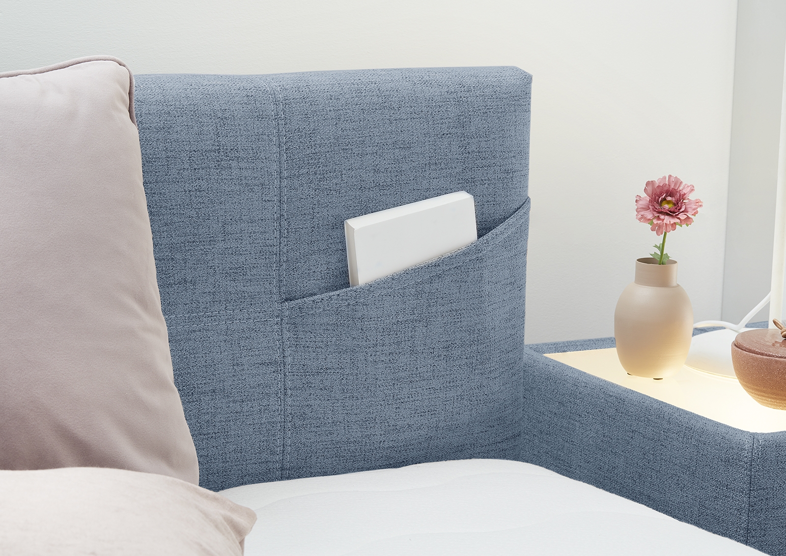 un espace de rangement supplémentaire est offert par les 2 poches dans la tête de lit