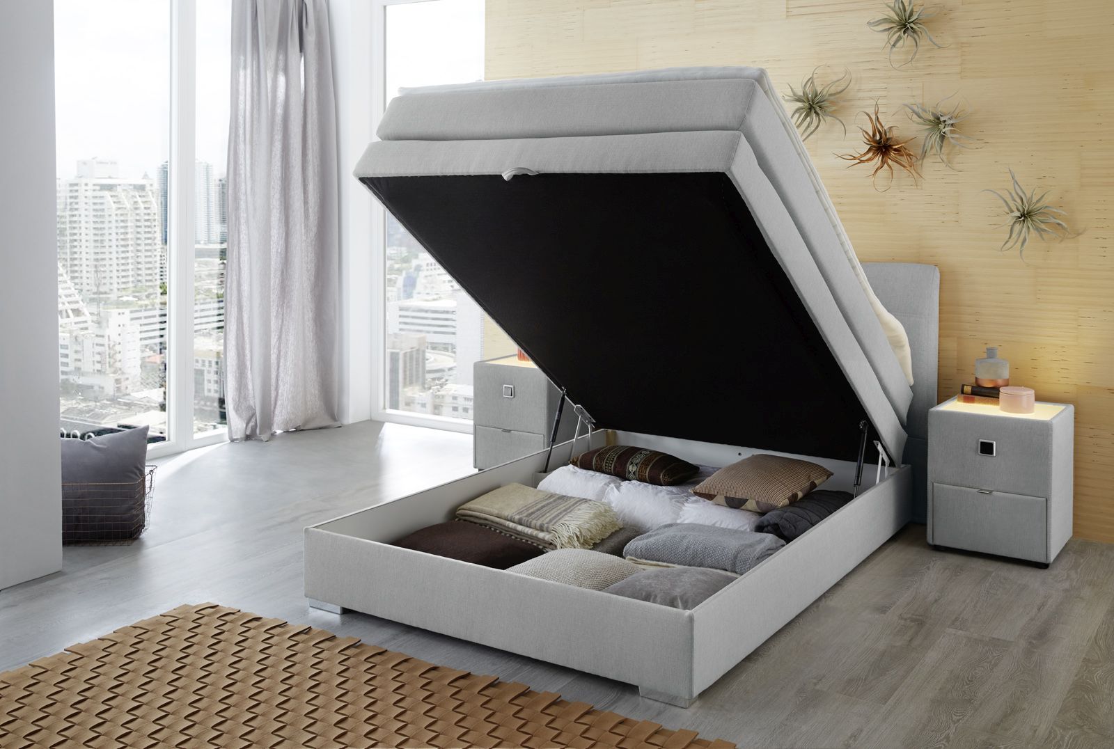 La structure de ce lit boxspring est composée d'un caisson et d'un cadre de lit relevable avec garnissage à ressorts Bonnell. Sur cette base se trouve un mtelas à ressorts bonnell. La double suspension ainsi formée crée un confort unique avec une adaptation optimale à la morphologie du dormeur et à la pression corporelle.Le surmatelas en mousse polyuréthane apporte la touche finale à ce lit boxspring