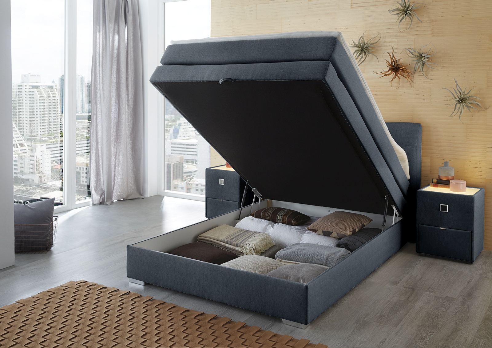 La structure de ce lit boxspring est composée d'un caisson et d'un cadre de lit relevable avec garnissage à ressorts Bonnell. Sur cette base se trouve un mtelas à ressorts bonnell. La double suspension ainsi formée crée un confort unique avec une adaptation optimale à la morphologie du dormeur et à la pression corporelle.Le surmatelas en mousse polyuréthane apporte la touche finale à ce lit boxspring