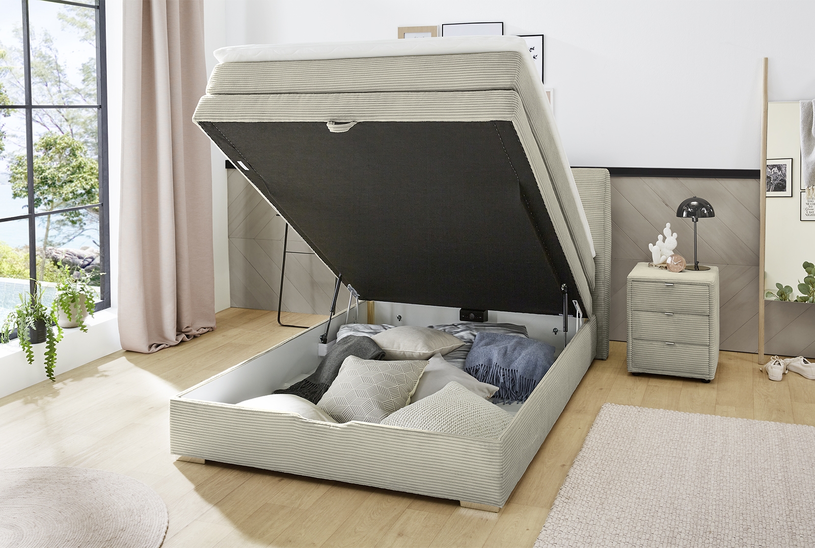 La structure de ce lit boxspring est composée d’un coffre de lit avec garnissage à ressorts bonnell. Un matelas à ressorts bonnell repose sur ce système de suspension. La double suspension ainsi formée crée un confort unique avec une adaptation optimale à la morphologie du dormeur et une réduction de la pression. Le surmatelas en mousse haute résilience apporte la touche finale à ce lit boxspring. Ce lit boxspring garantit un confort de sommeil extraordinaire grâce à son excellent système individuel de suspension double. Le coffre de lit aéré intégré peut être ouvert facilement à l'aide d'un vérin à gaz et offre ainsi un bel espace de rangement.