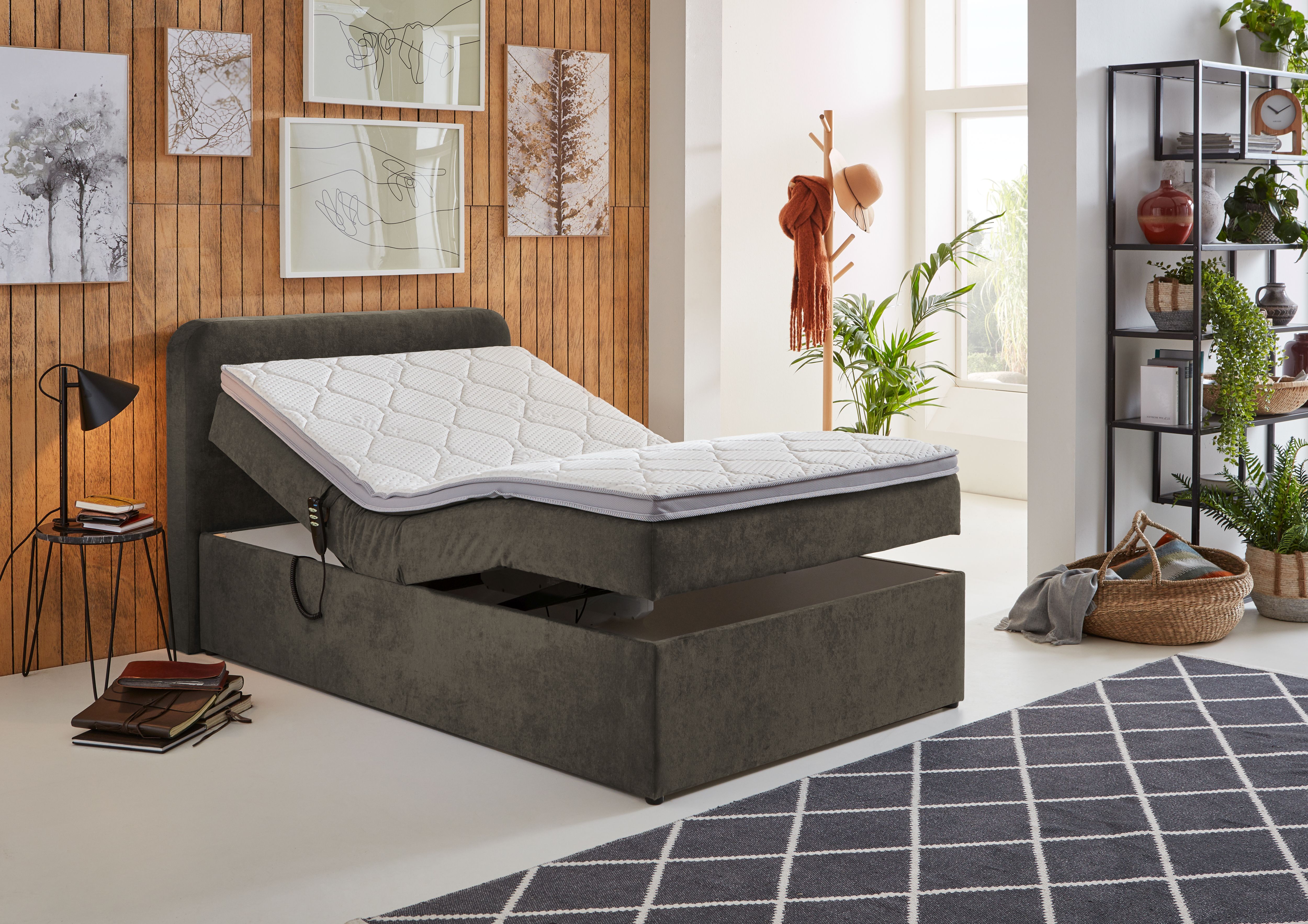 1 caisson de base avec réglage électrique, coffre de rangement, garnissage à ressorts ensachés et surmatelas intégré