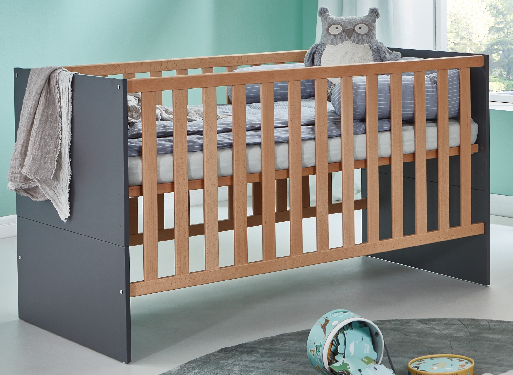 1 lit de bébé avec sommier à lattes réglable sur 4 niveaux ; tête de lit et pied de lit en deux parties ; grilles latérales avec barreaux plats dont une avec 3 barreaux amovibles