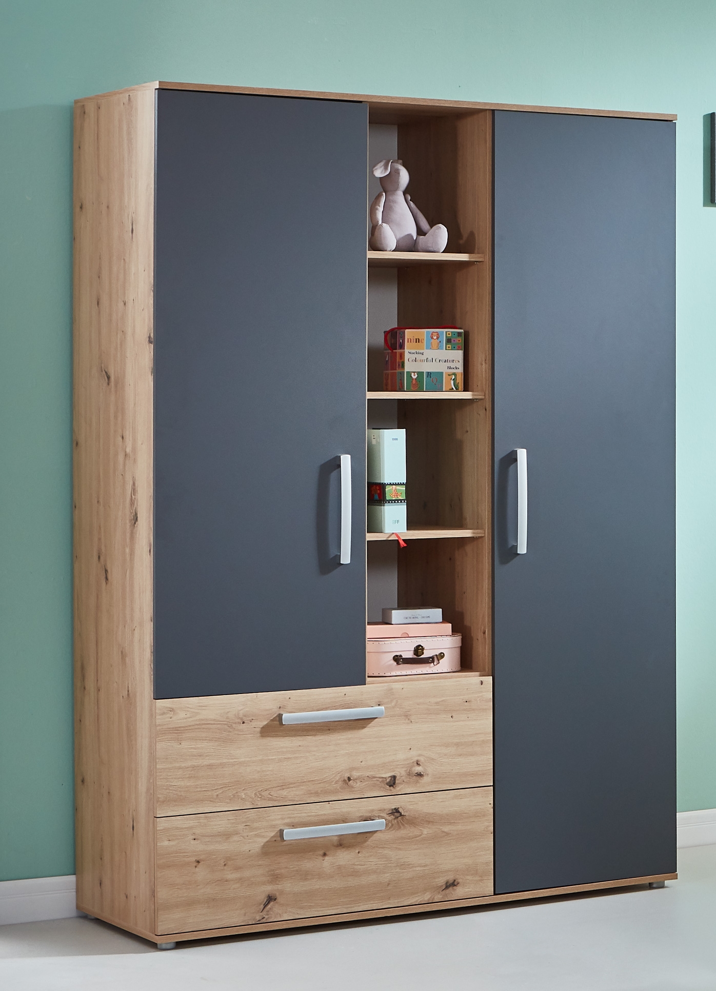 1 armoire à vêtements avec 3 portes, 2 tiroirs, 4 casiers ouverts, 4 tablettes amovibles et 1 barre de penderie
