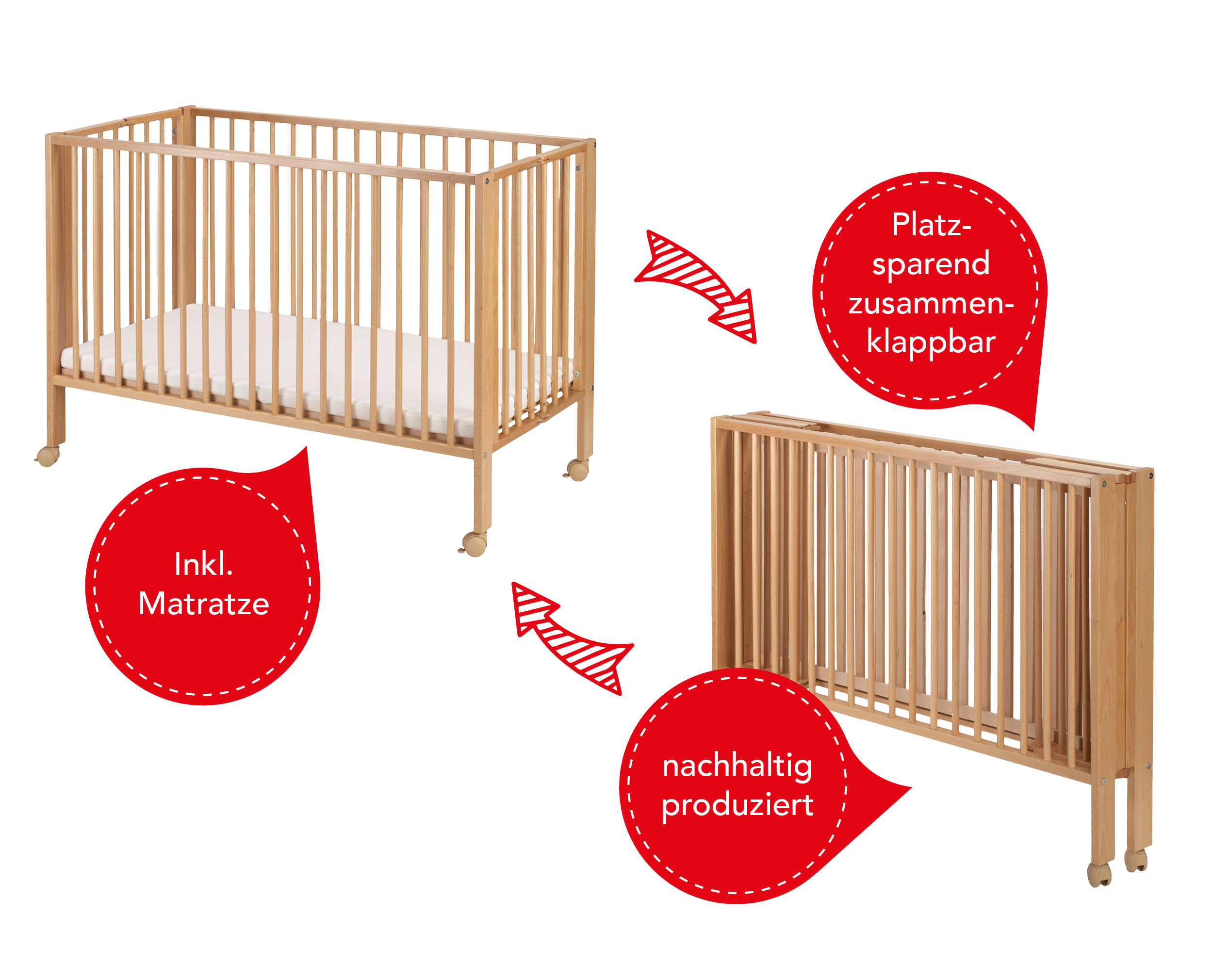 Grâce à sa fonction pliante sans outils, le lit est monté rapidement – et démonté et rangé tout aussi facilement.