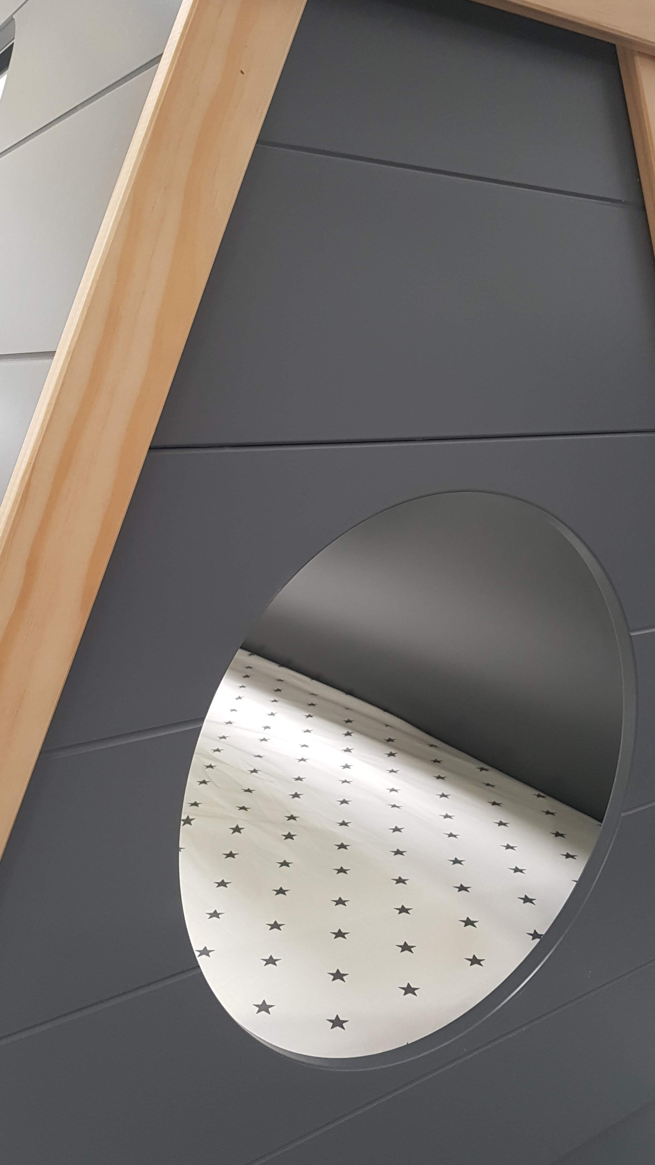 Si vous souhaitez aménager la chambre de votre enfant de façon individuelle, ce lit dans une jolie forme de tipi est exactement ce qu'il vous faut. Avec ce lit en forme de tente, votre enfant peut laisser libre cours à son imagination et plonger dans un univers rempli de jeux. Ce lit enfant avec sa forme unique garantit des nuits peuplées de jolis rêves tandis qu'il représente une belle place de jeu idéale en journée pour vos petits chéris. La combinaison tout en sobriété entre base ton gris et contrastes en bois laissé à l'état naturel s'intègre merveilleusement dans différents styles d'intérieur et diverses palettes de couleurs. Associé à des meubles scandinaves ton blanc ou gris ou en contraste à un mobilier coloré, ce lit junior est une solution unisexe moderne pour la chambre d'enfant. Les deux fenêtres rondes à l'avant et à l'arrière du lit permettent de se cacher ou de se montrer et de s'amuser. Grâce aux lattes en bois couvrant une partie du lit, votre enfant ne peut pas tomber ou glisser du lit. Le sommier à lattes prévu pour un matelas de 90x200 cm est compris dans la livraison. Un tiroir dans les mêmes teintes est disponible séparément pour encore plus d'espace de rangement.