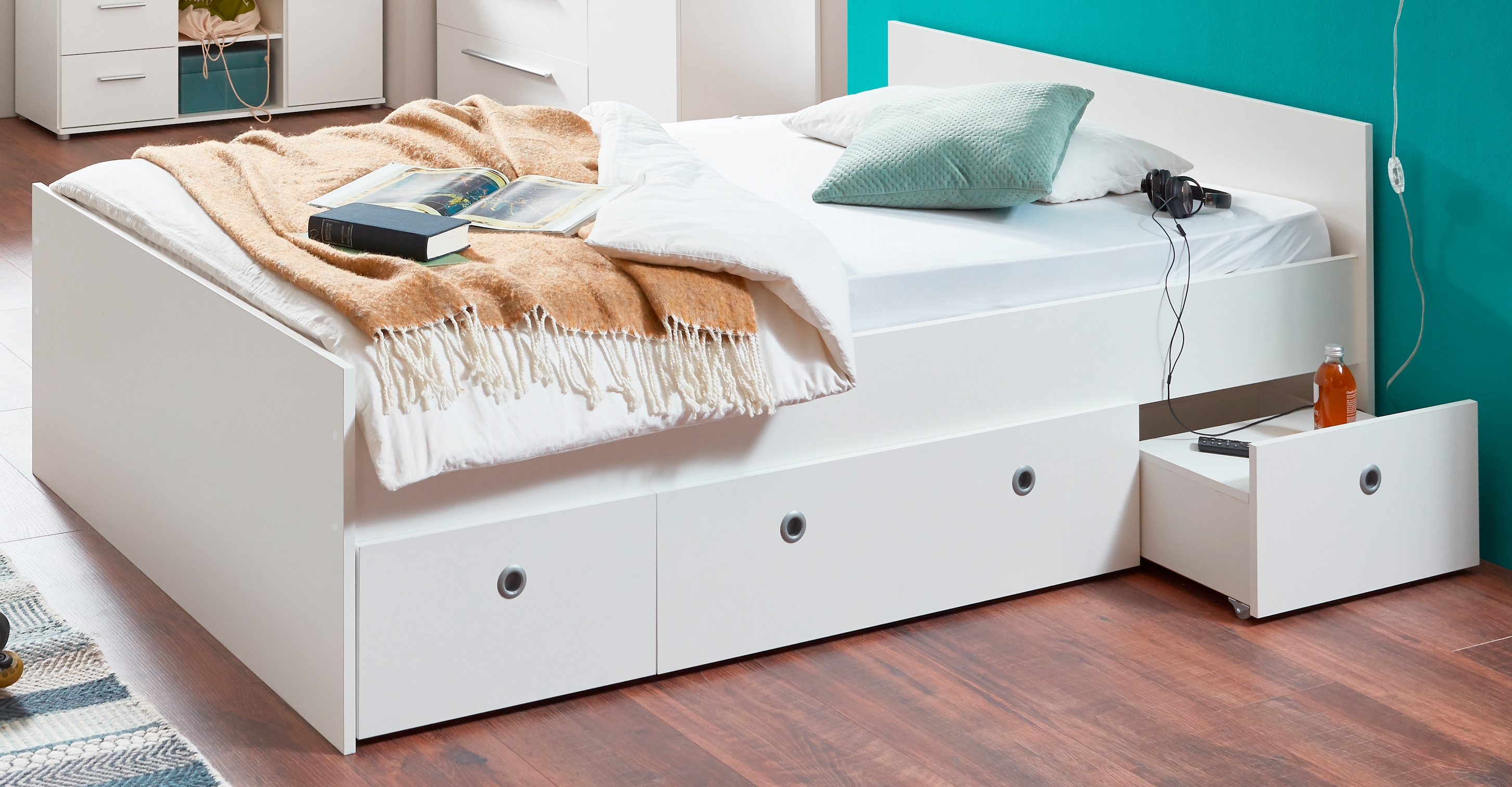 avec 3 tiroirs à roulettes - dont un pourvu d'un couvercle amovible pour être utilisé comme chevet/tablette