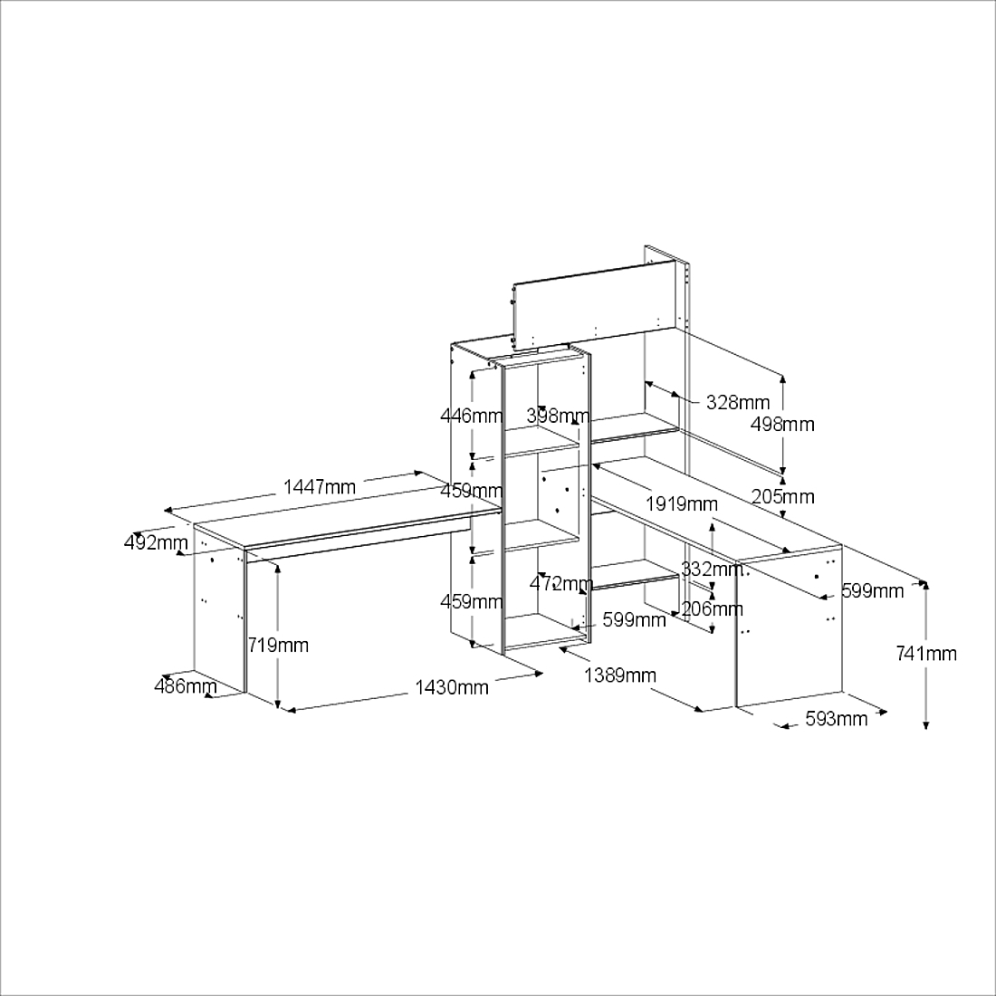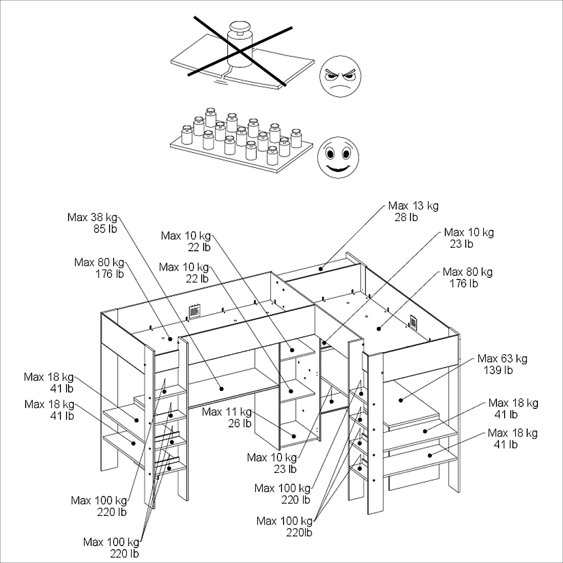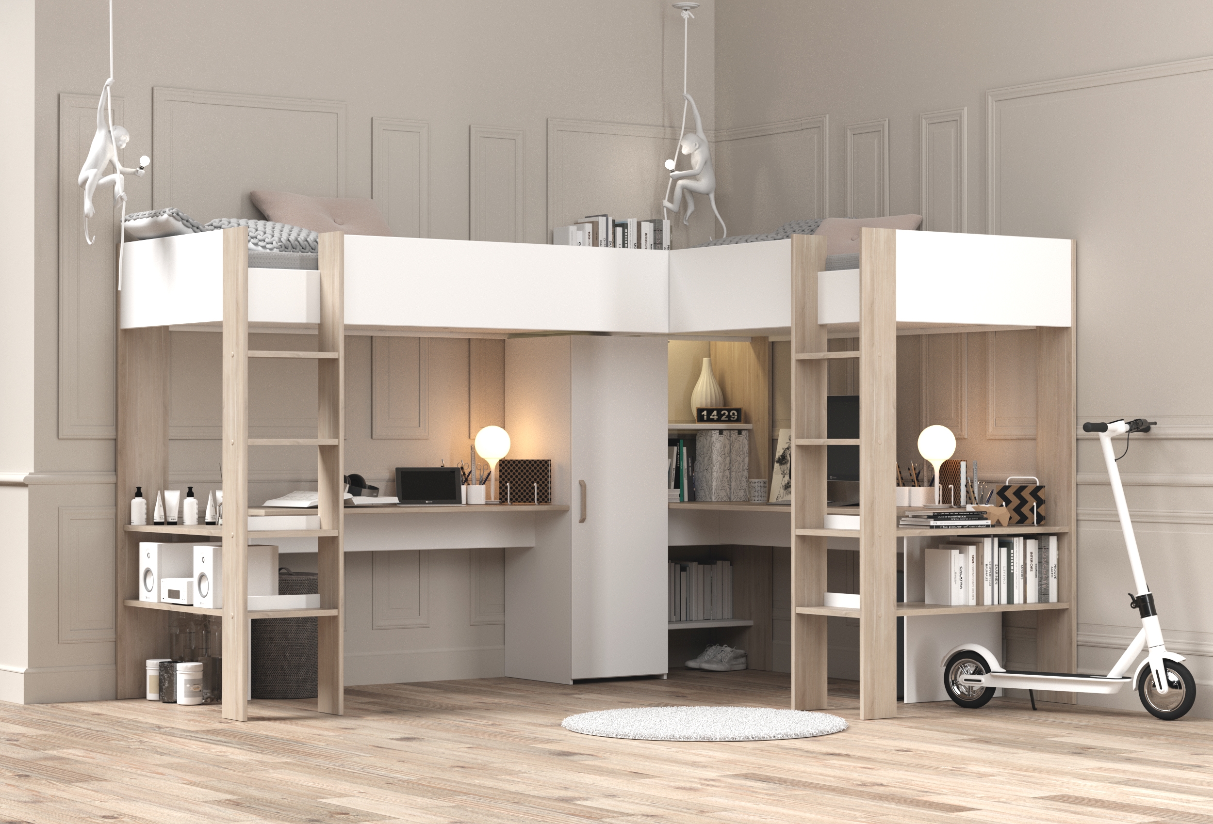 Sous chaque couchage : 1 bureau intégré avec surfaces de rangement de chaque côté