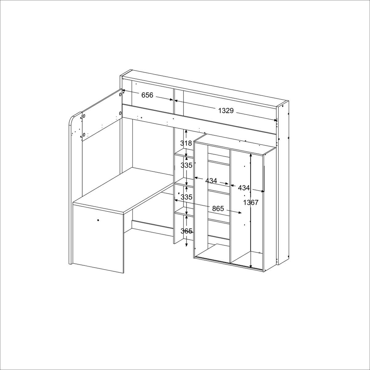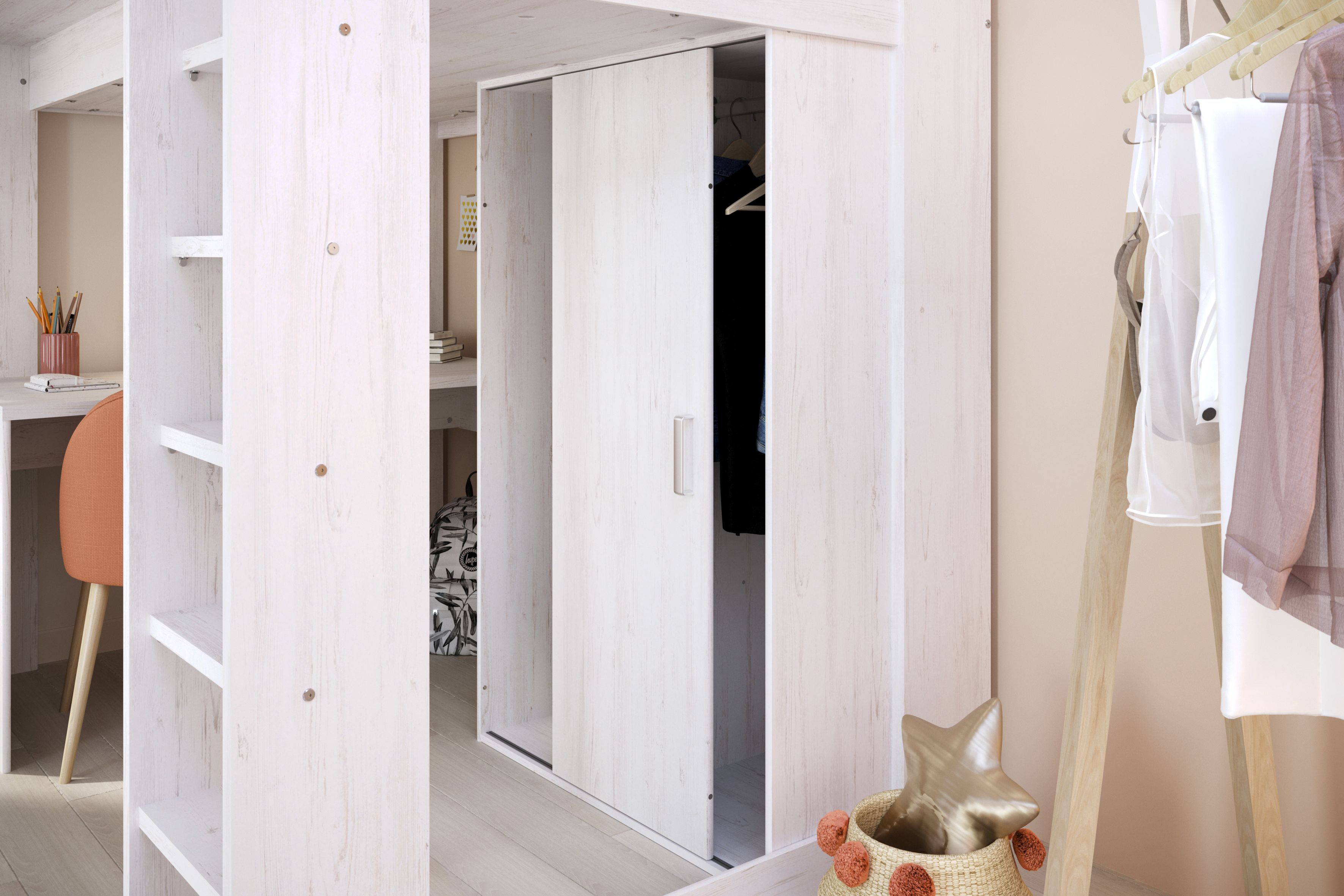 en dessous de la surface de couchage : 1 bureau, 1 armoire à vêtements avec porte coulissante (comprenant 1 barre de penderie), nombreux casiers de rangement à côté et sous la surface de couchage