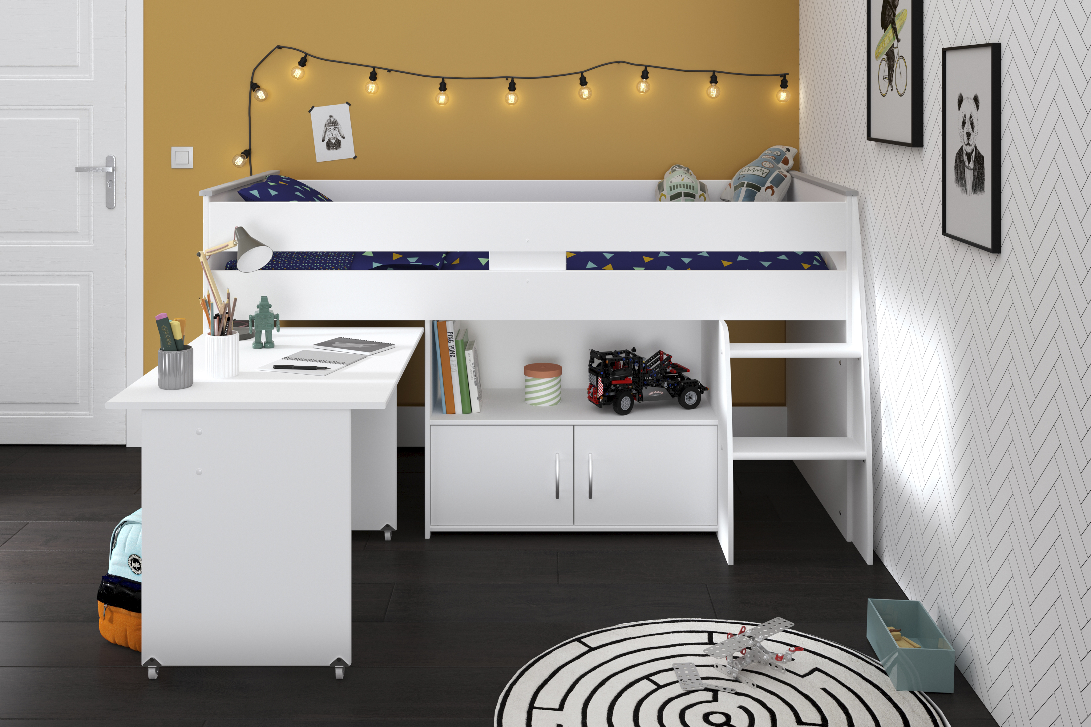 Ce lit mezzanine est un meuble multifonction. Le modèle REVERSE 1 dispose d'un bureau intégré qui se déplace sur des roulettes vers l'intérieur ou l'extérieur. Une échelle intégrée mène au lit confortable.