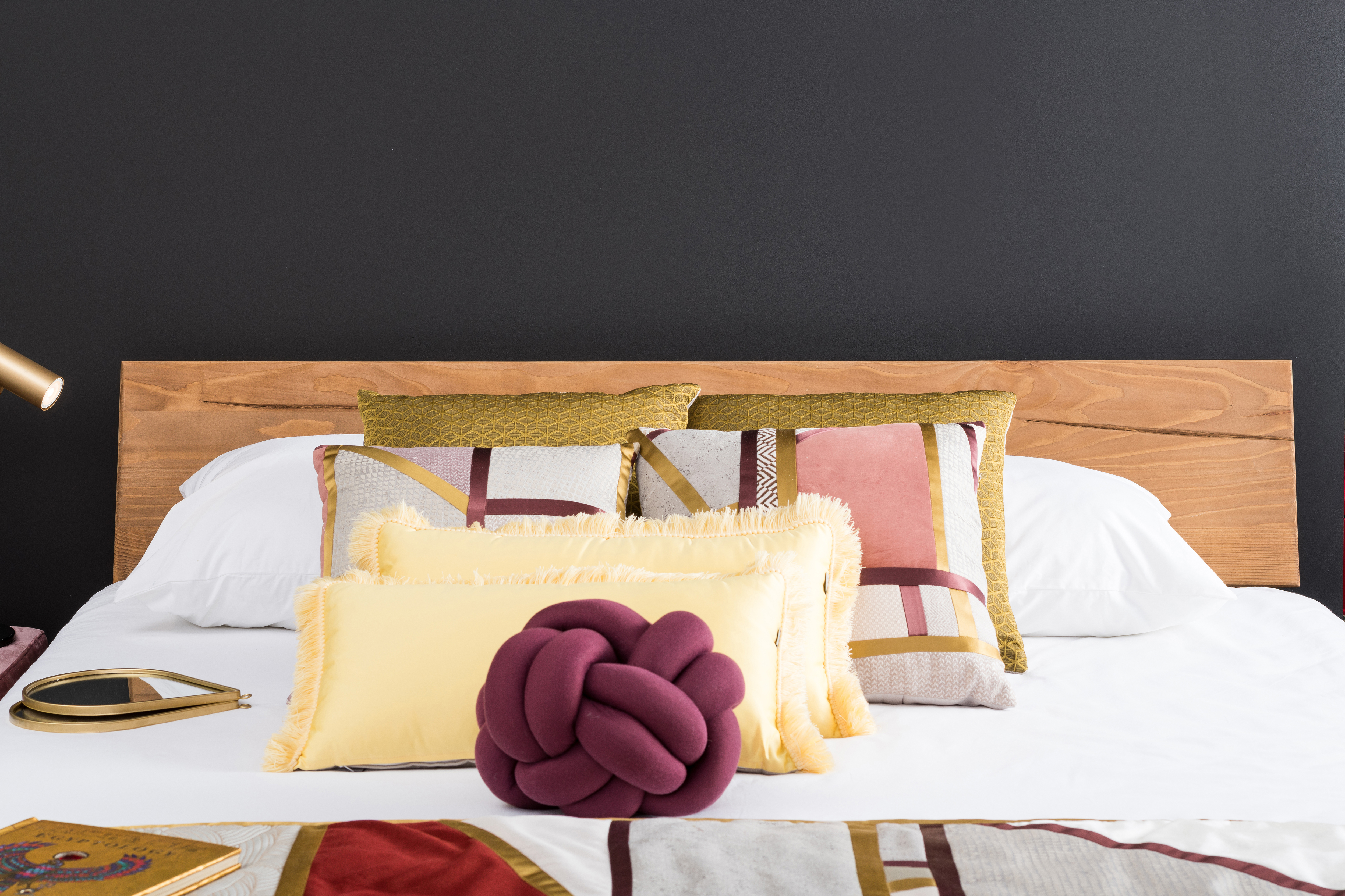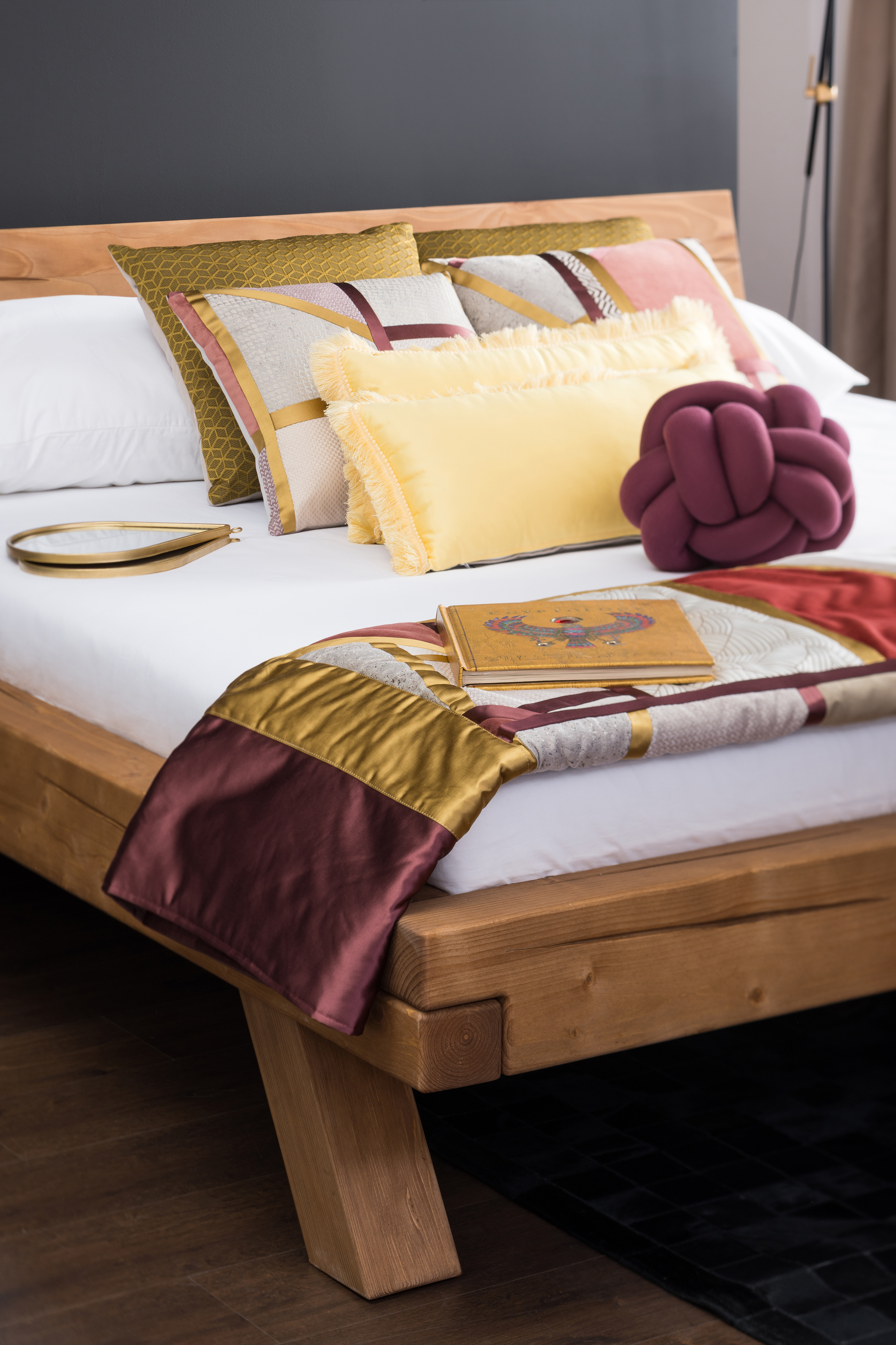 - Cadre de lit avec quatre pieds en bois placés de biais