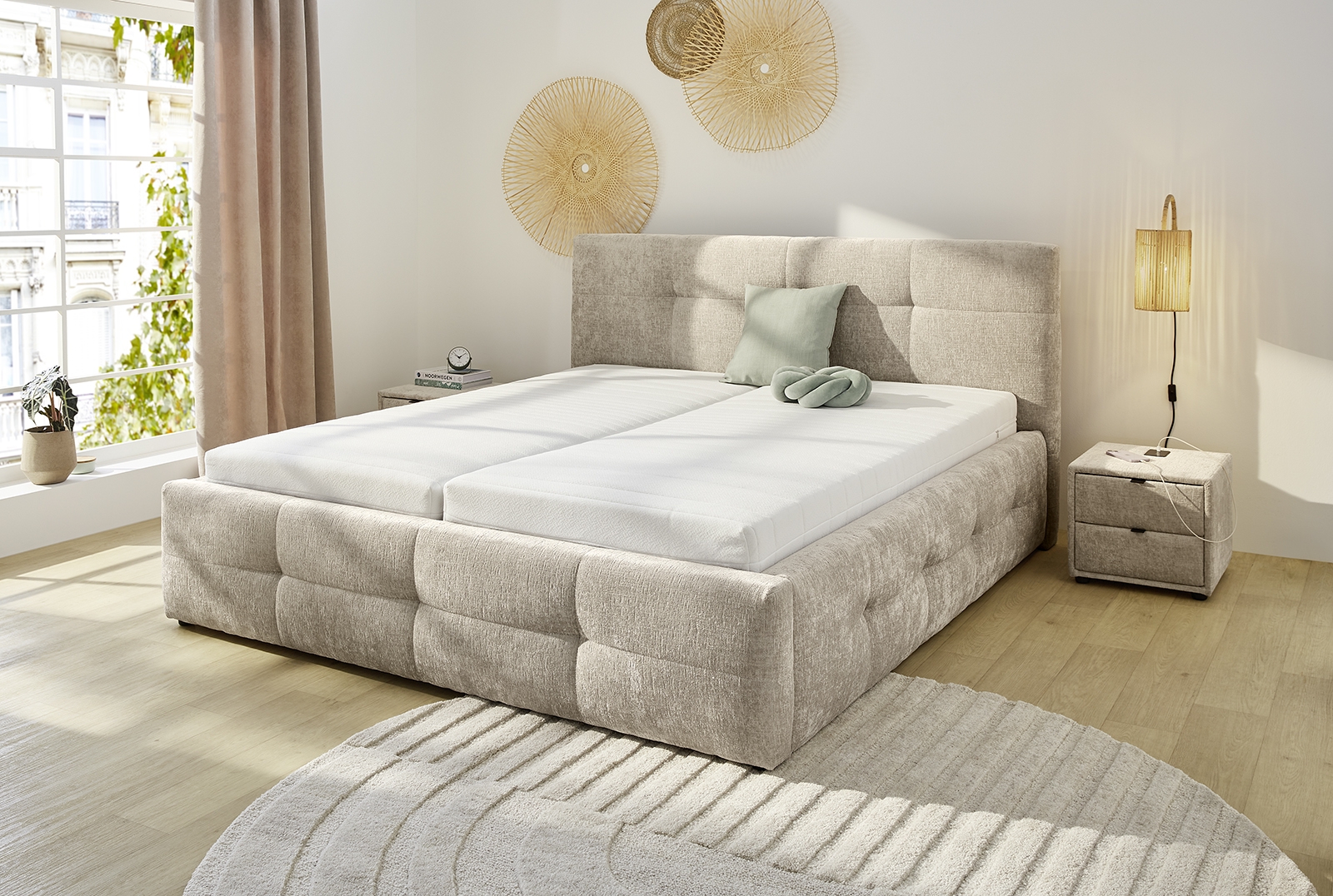Le système Vario de ce lit rembourré est très flexible et permet de positionner un sommier à lattes en bois multiplis dans 2 hauteurs différentes.