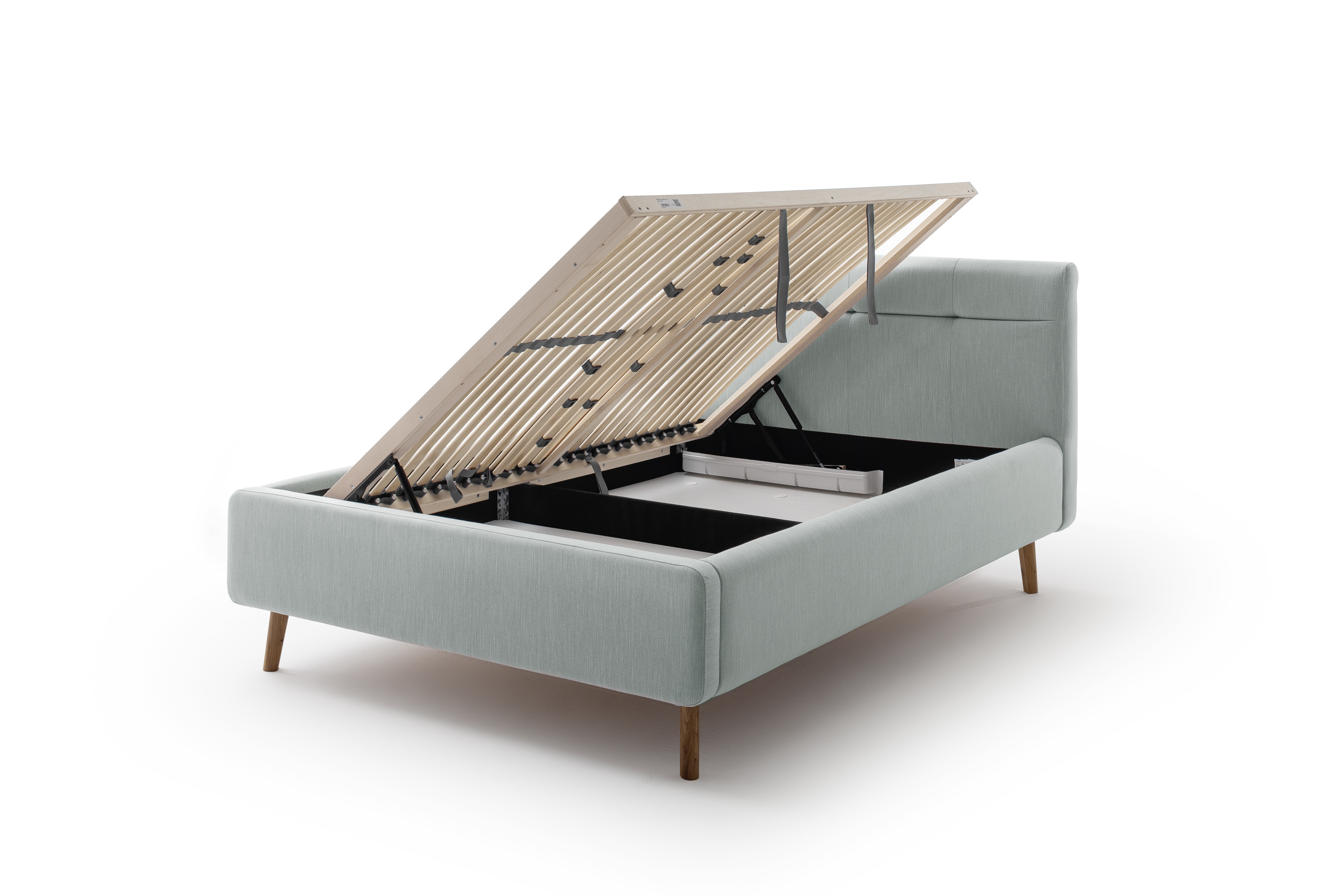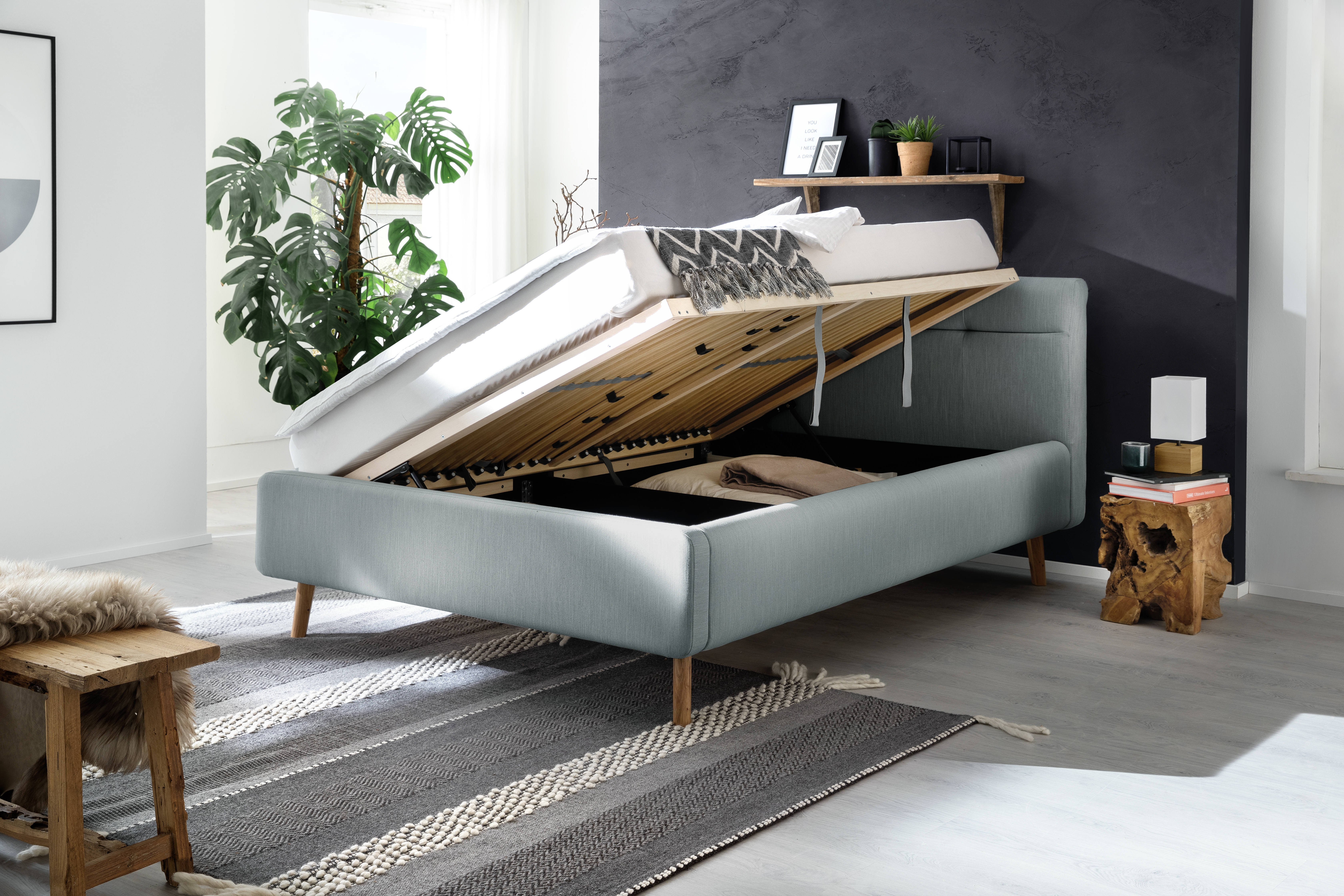 Inclus : coffre de lit avec aération et sommiers à lattes en bois multiplis avec ouverture latérale