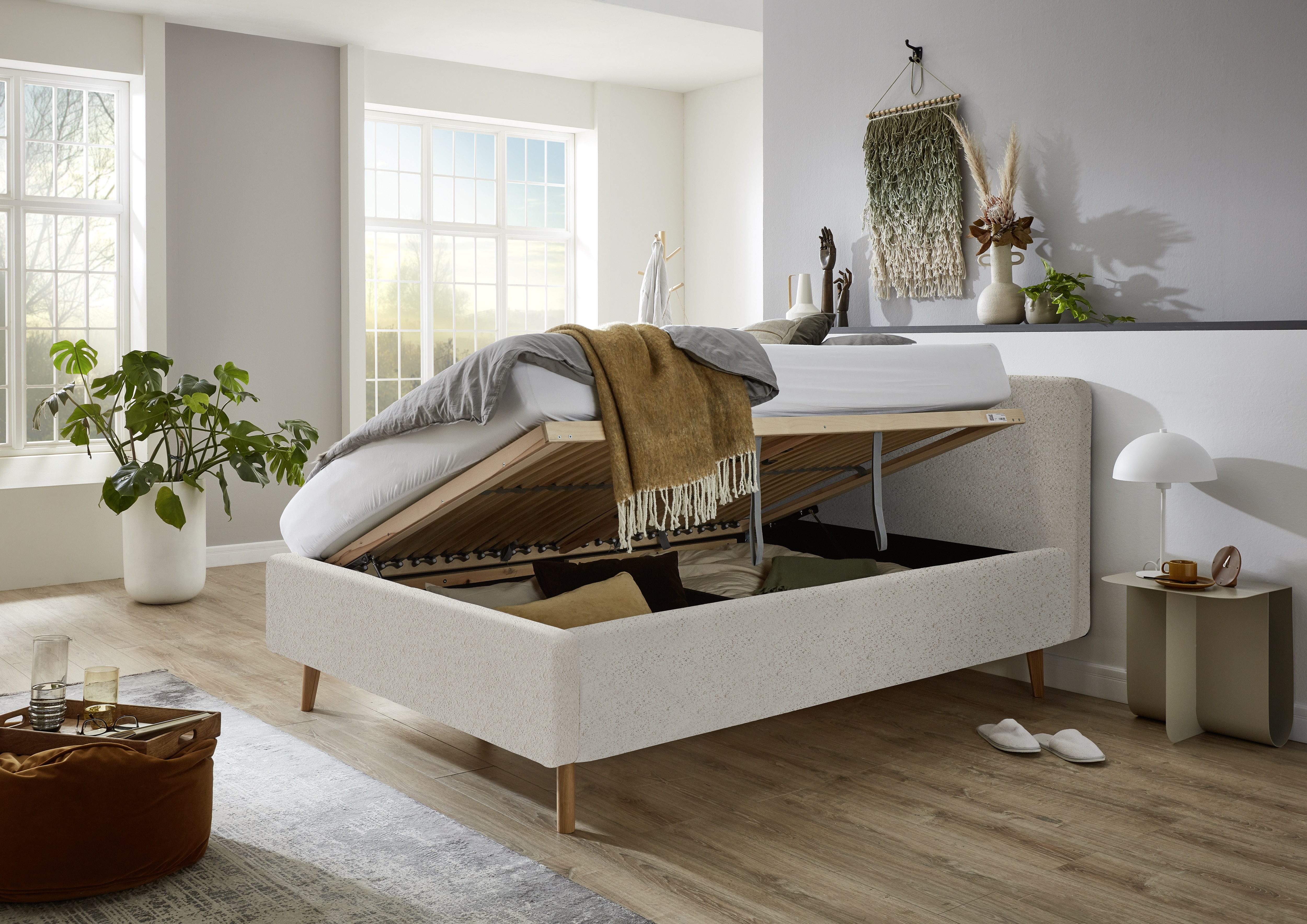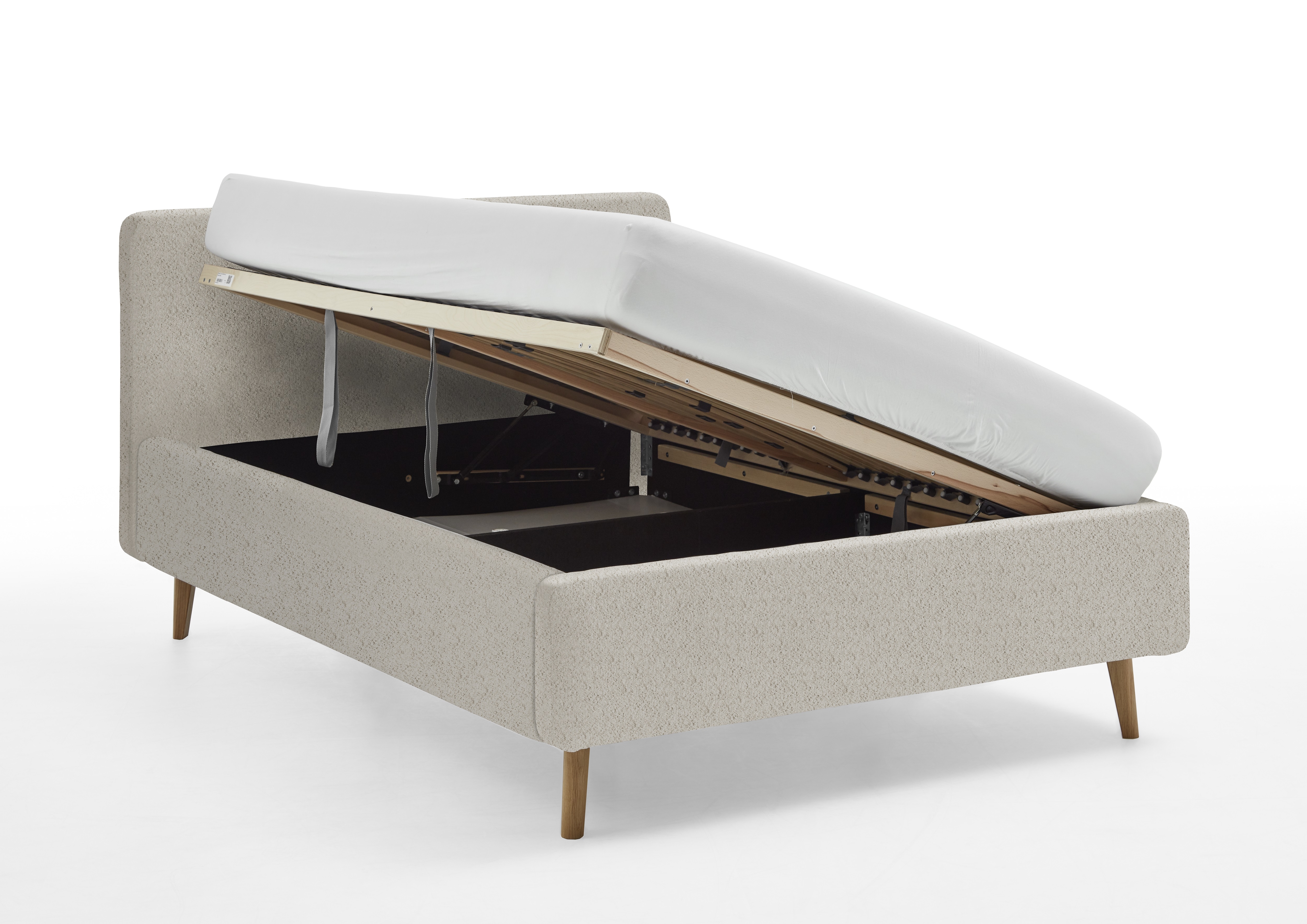 inclus : un coffre de lit avec aération et sommier à lattes en bois multiplis avec ouverture latérale