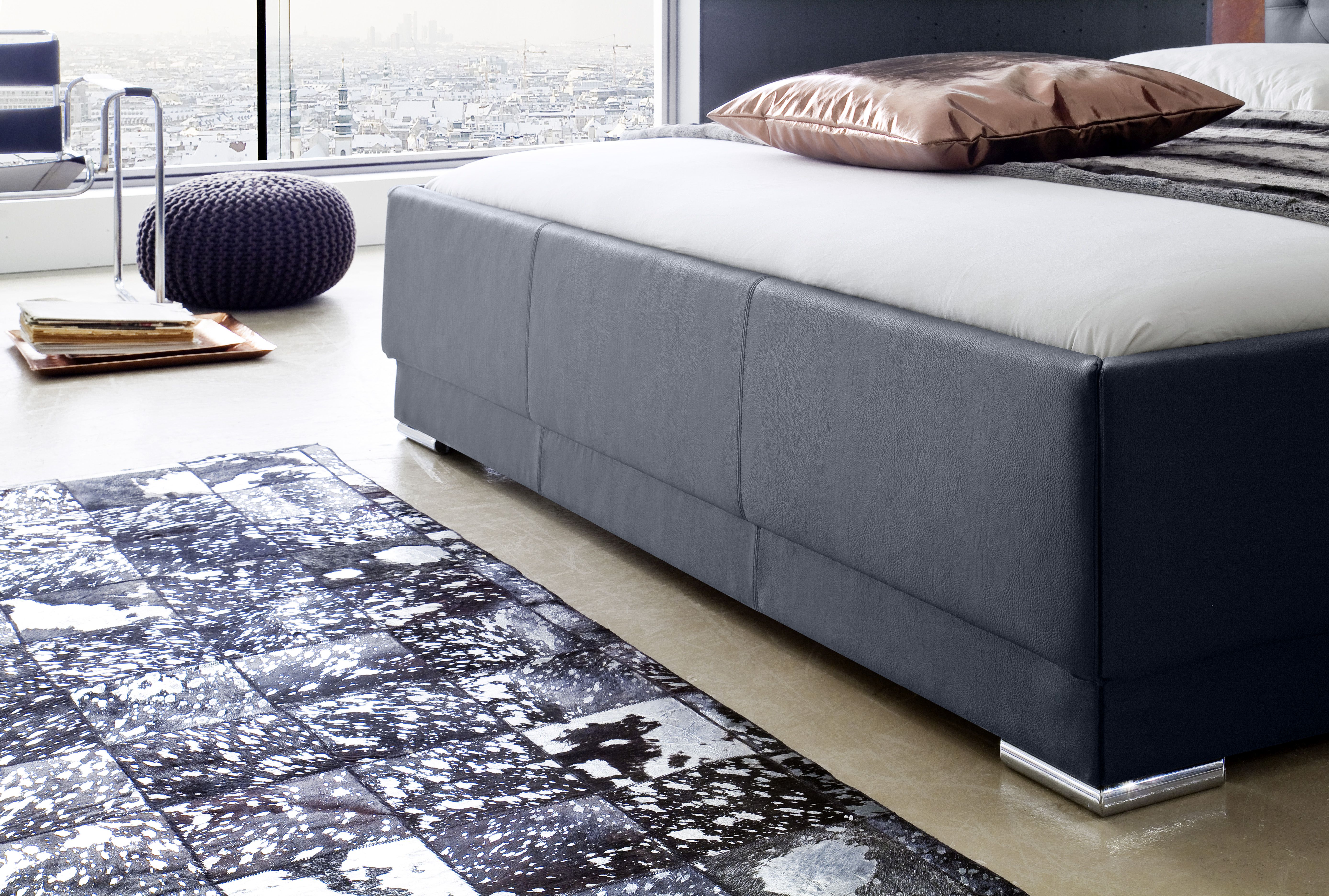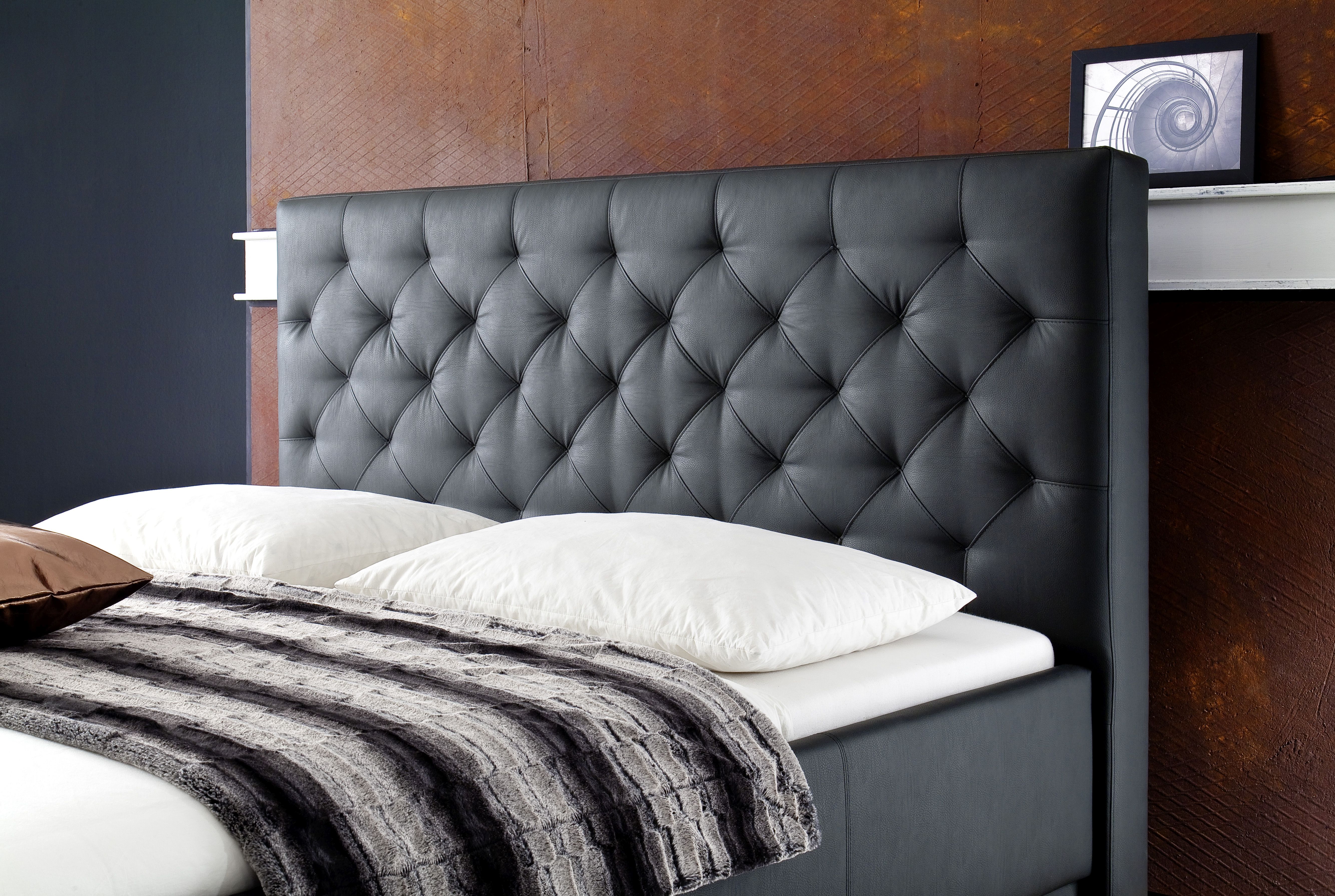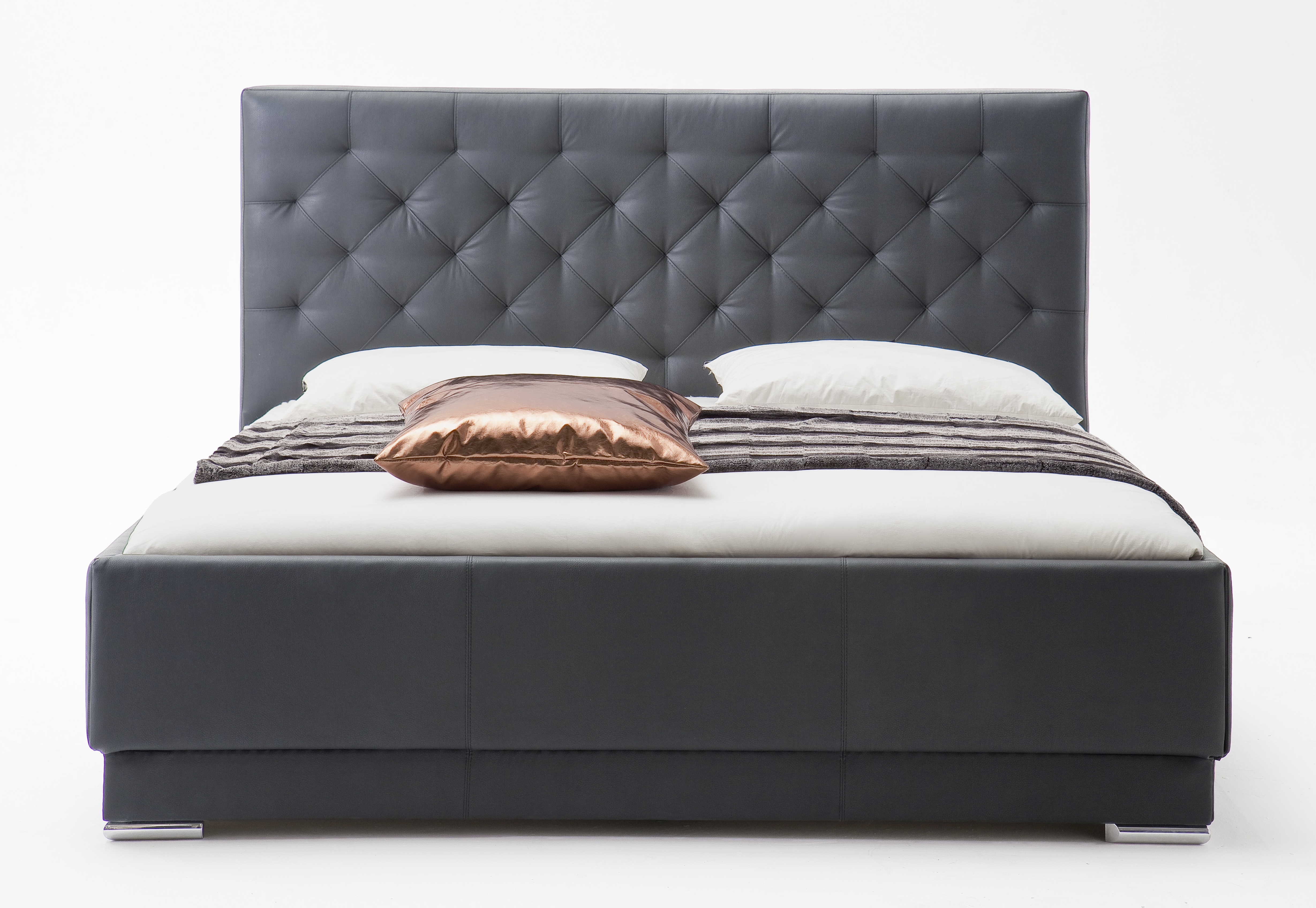 Lit rembourré ton noir avec revêtement en cuir synthétique : face avant 100% polyuréthane, dos : 40% coton, 60% polyester